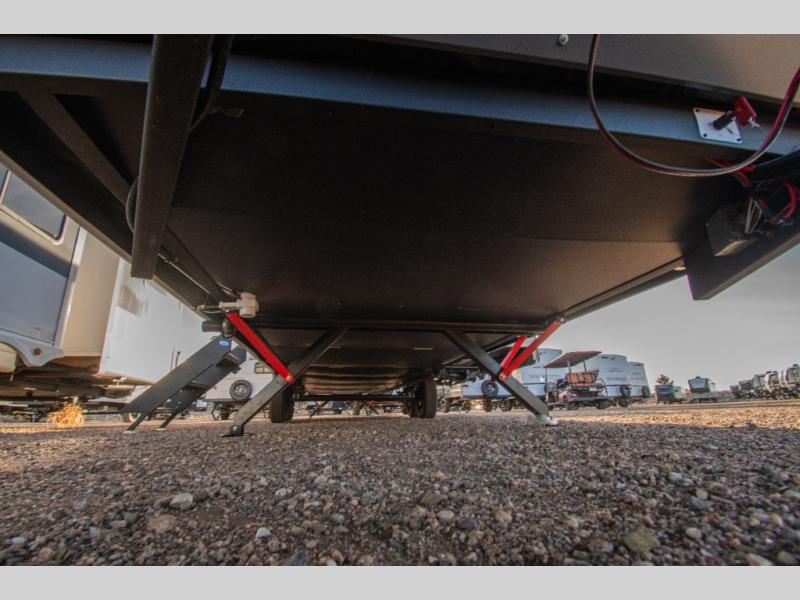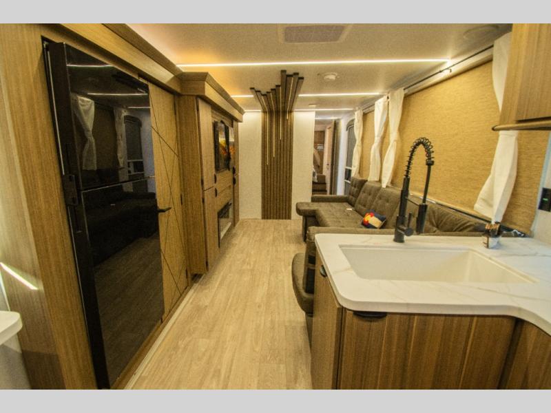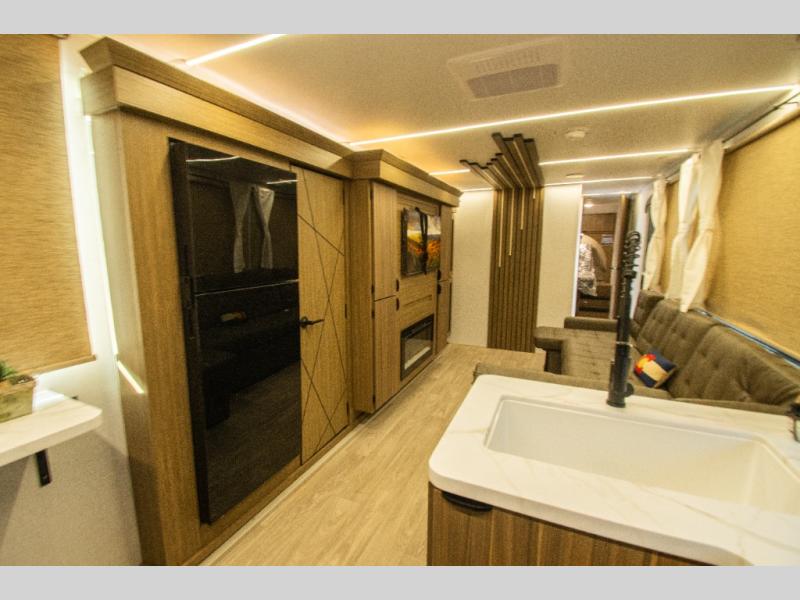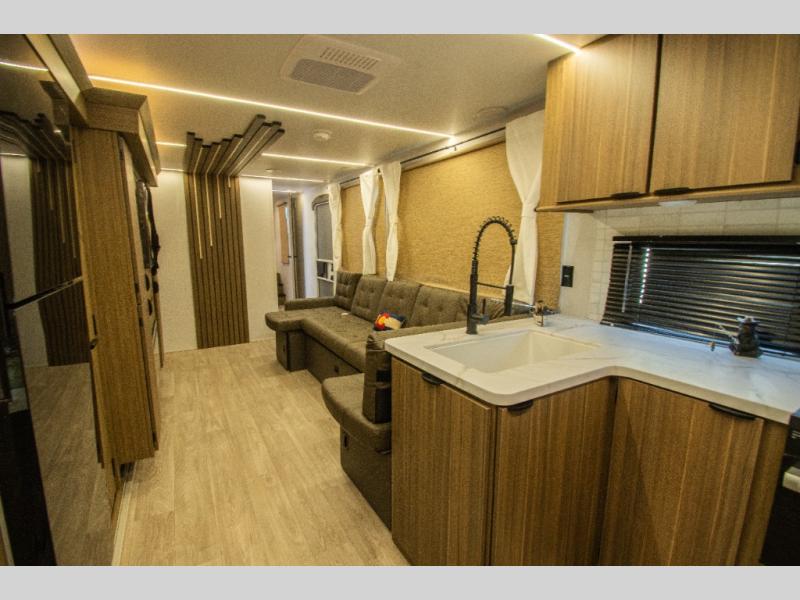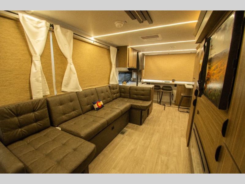 A large slide-out anchors the main living area and adds versatility to the floorplan. Within the slide, you’ll find a hidden bunkhouse, along with the refrigerator, pantry, and a desk, making this space useful for kids, guests, or anyone who needs a dedicated work area while traveling.
