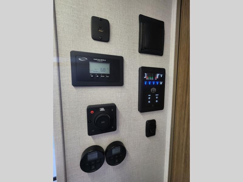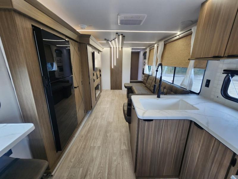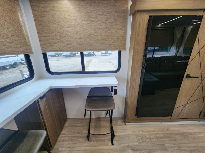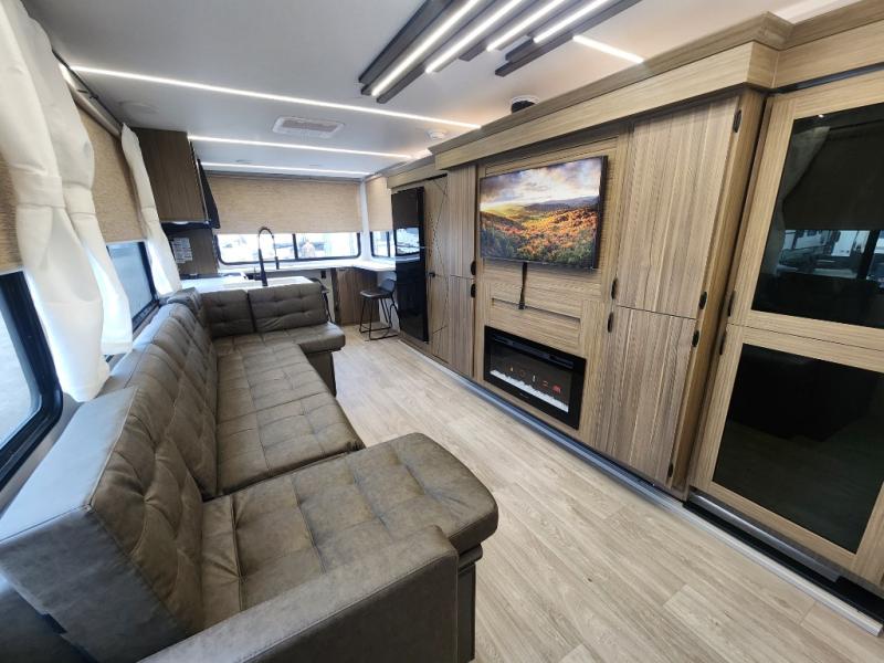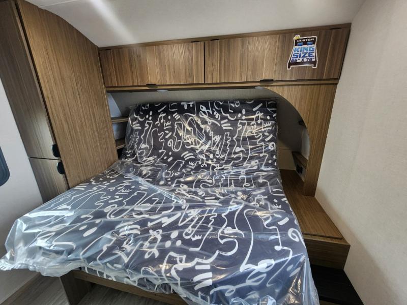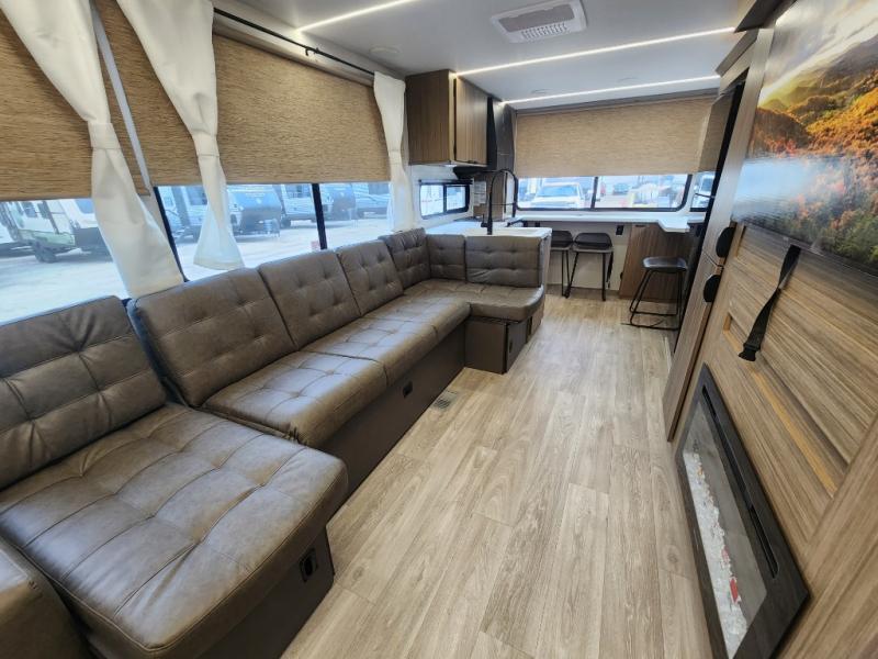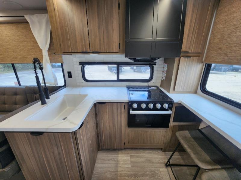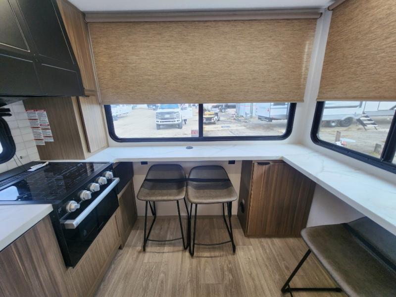 The large slide in this travel trailer is ultra versatile since it features a hidden bunkhouse within it, along with the refrigerator and pantry plus a desk. You are sure to appreciate the rear kitchen that includes wrap-around counter space and chairs, plus a flip-up desk if you need to get some work done. The full bath will let you clean up daily without having to use the camp's facilities, and the front private bedroom includes a custom king bed with Versa Tilt so you can read in bed at night. There is also a wardrobe and overhead cabinet plus a closet with washer and dryer prep if you choose to add these appliances.