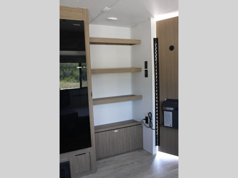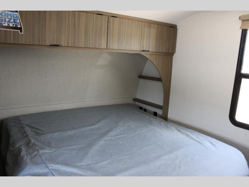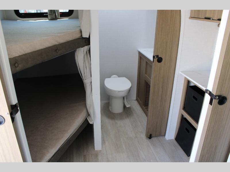 When you're ready to upgrade your RV to a unit with more sleeping space and comfort, choose this Wildwood Platinum travel trailer, and you'll never look back. After setting up camp, put out the large slide and prepare lunch indoors or outside at the outdoor kitchen, and the 20' power awning will shade you from the sun. The kids will find all their snacks in the hidden pantry behind the entertainment center, and their drinks in the oversized fridge. There is a Versa-Lounge to relax on and a Versa Flex table where you can dine and work from home. This model features a rear private bunkhouse with a set of double bed bunks, a desk and a half bath. You will also love the front private bedroom that includes a custom king bed and dual bedside closets with nightstands below.