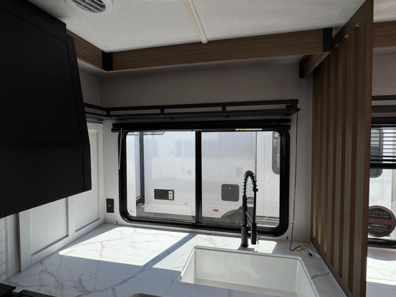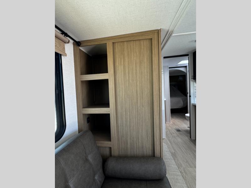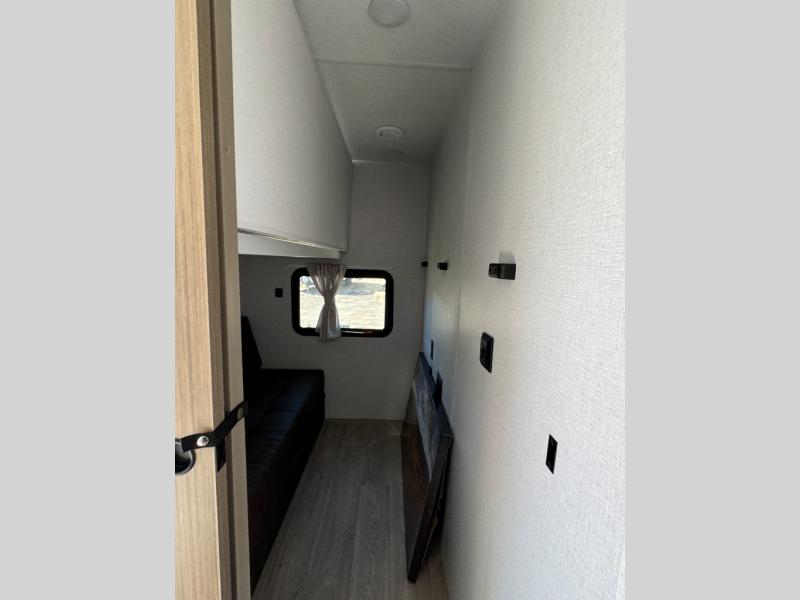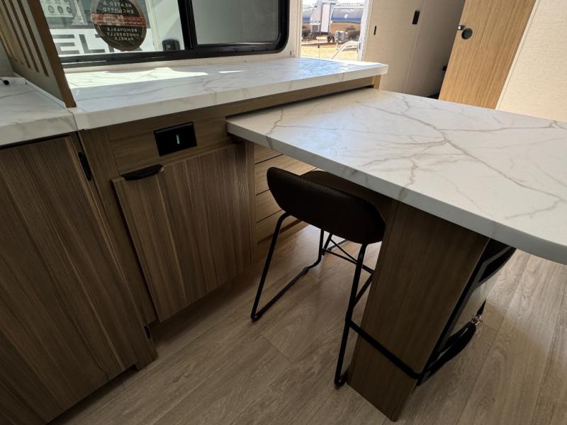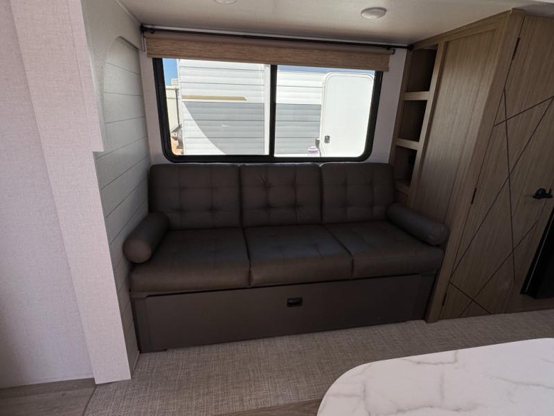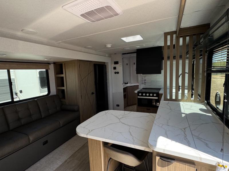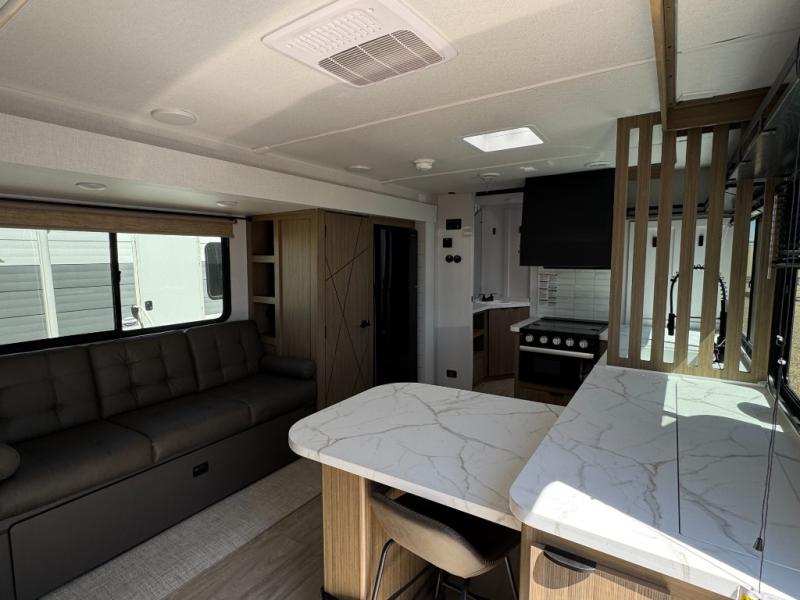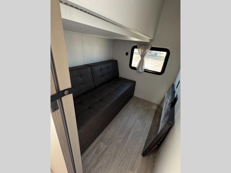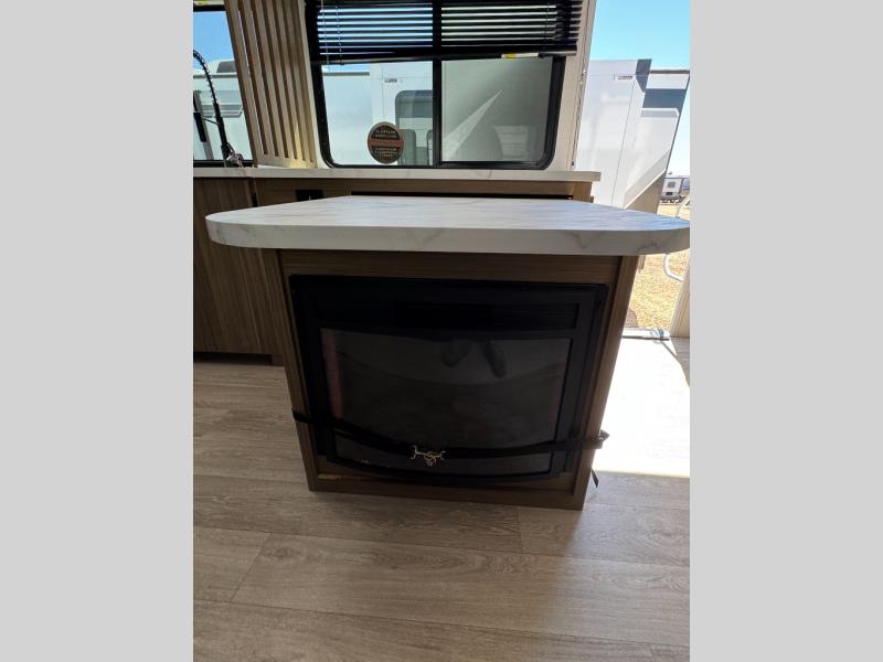 Everyone will enjoy having their own space in this travel trailer thanks to the front master bedroom and the rear bunkhouse. The bunkhouse includes a wall to separate the Versa bunk and fold-down desk on one side and a Versa sofa on the other, perfect for older kids or guests. You'll have the custom king bed with Versa Tilt all to yourselves, and the walk-thru bath will be easily accessible for everyone. In the combined kitchen and living room, a jackknife sofa slide sits across from the fireplace/entertainment center, and there is a pull-out table here so you can dine together.