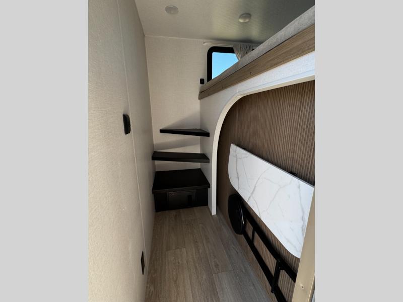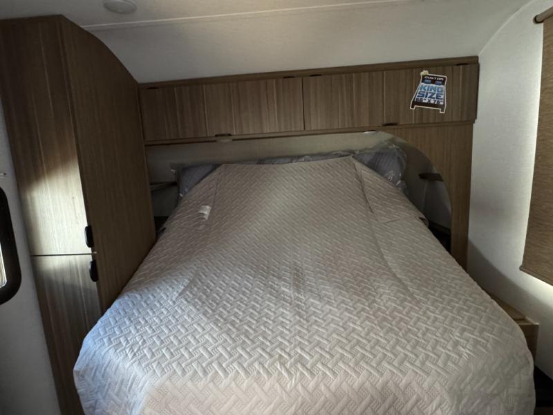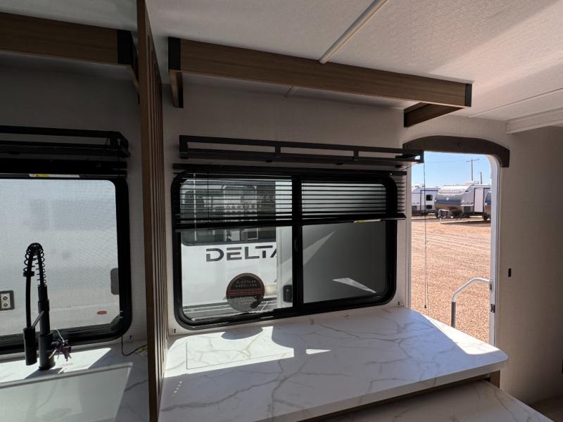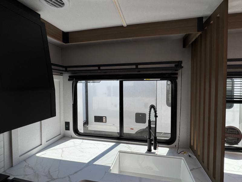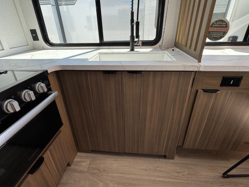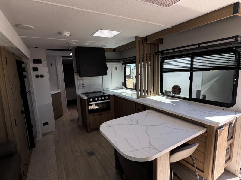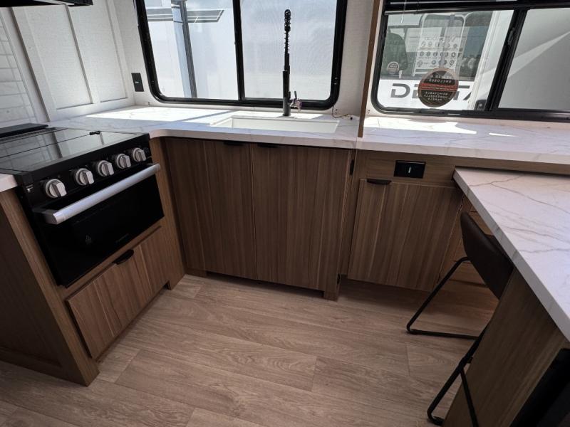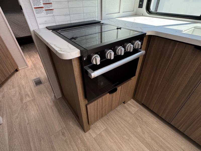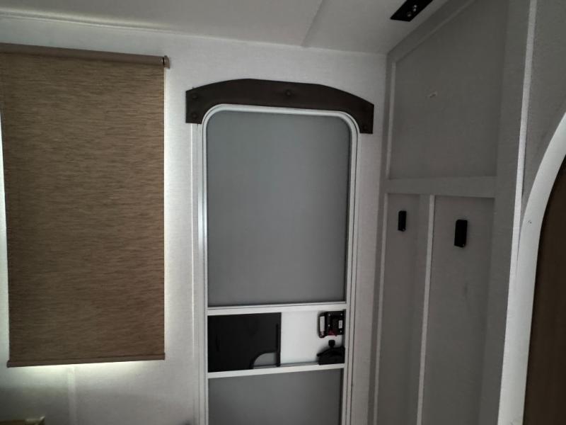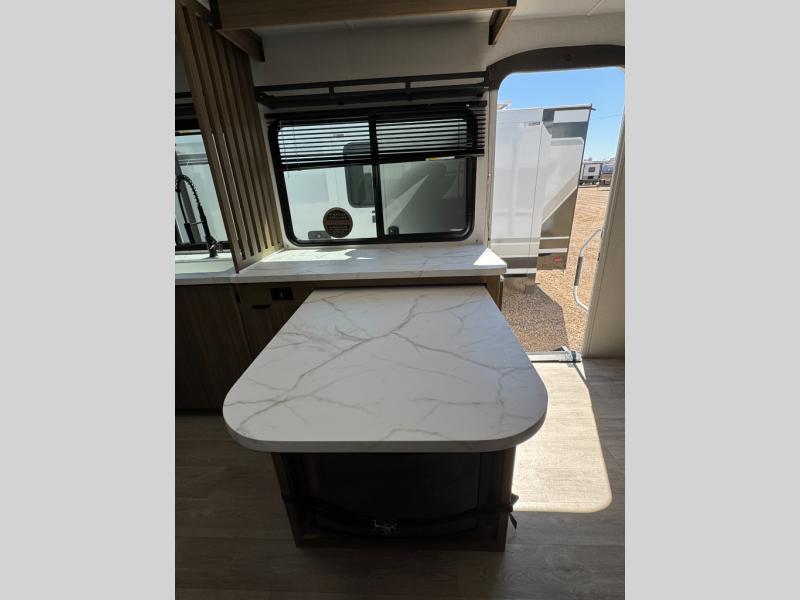 Everyone will enjoy having their own space in this travel trailer thanks to the front master bedroom and the rear bunkhouse. The bunkhouse includes a wall to separate the Versa bunk and fold-down desk on one side and a Versa sofa on the other, perfect for older kids or guests. You'll have the custom king bed with Versa Tilt all to yourselves, and the walk-thru bath will be easily accessible for everyone. In the combined kitchen and living room, a jackknife sofa slide sits across from the fireplace/entertainment center, and there is a pull-out table here so you can dine together.