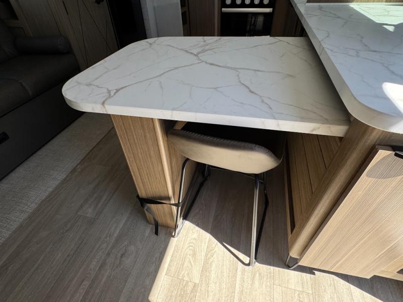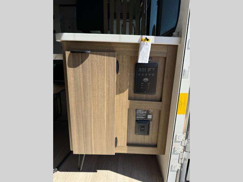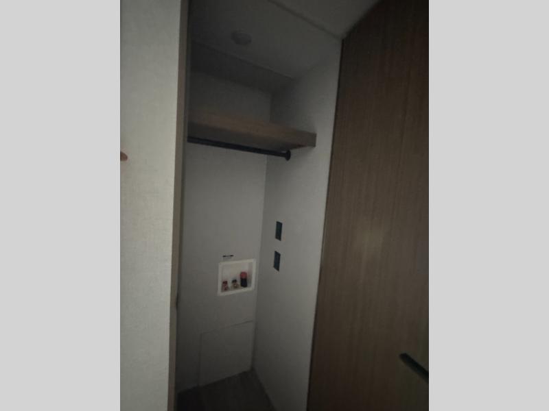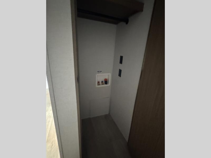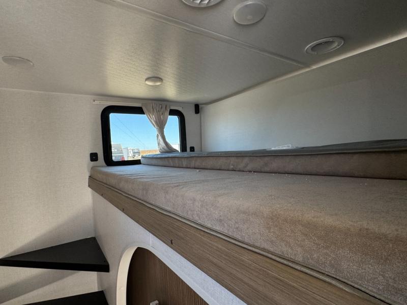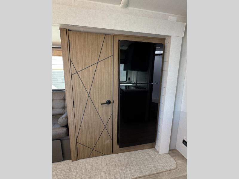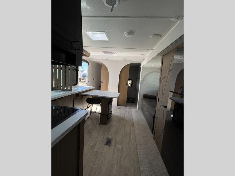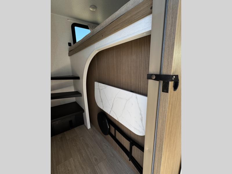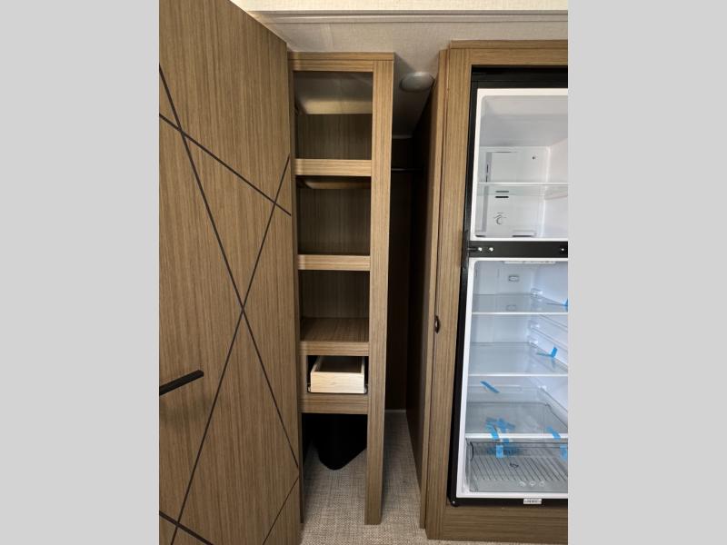Everyone will enjoy having their own space in this travel trailer thanks to the front master bedroom and the rear bunkhouse. The bunkhouse includes a wall to separate the Versa bunk and fold-down desk on one side and a Versa sofa on the other, perfect for older kids or guests. You'll have the custom king bed with Versa Tilt all to yourselves, and the walk-thru bath will be easily accessible for everyone. In the combined kitchen and living room, a jackknife sofa slide sits across from the fireplace/entertainment center, and there is a pull-out table here so you can dine together.