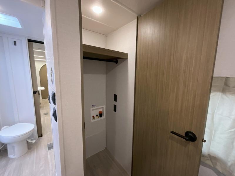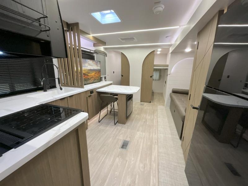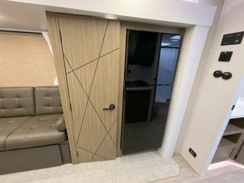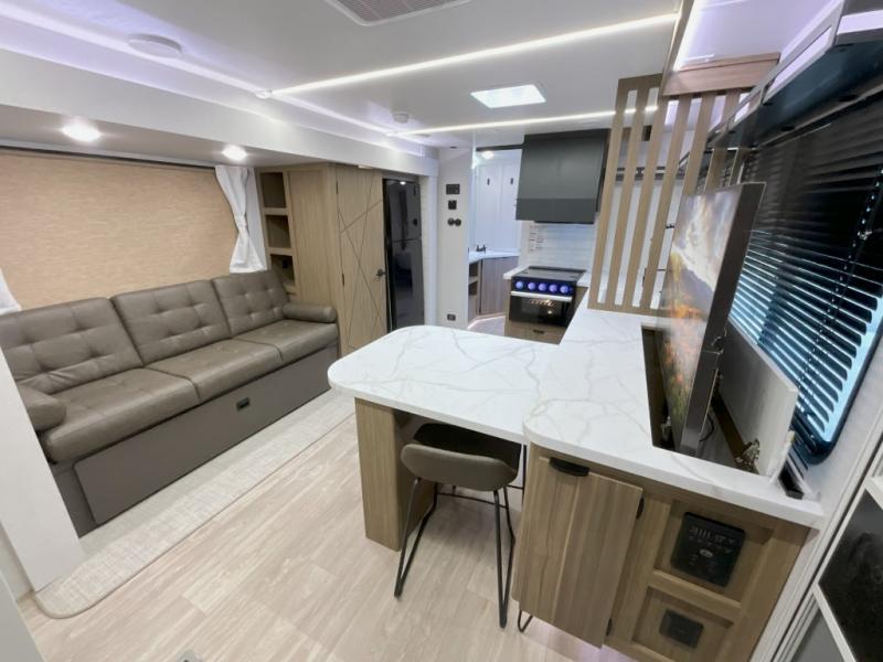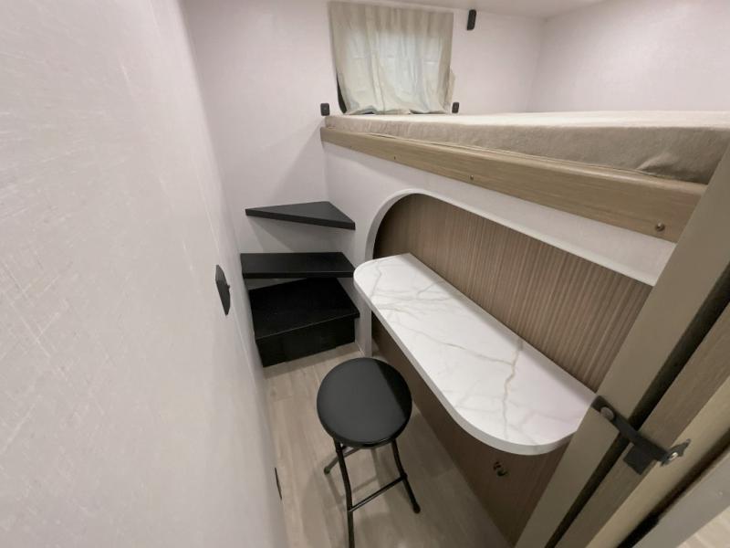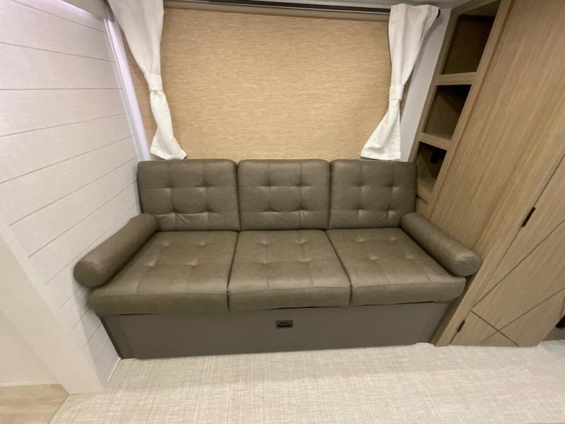 Everyone will enjoy having their own space in this travel trailer thanks to the front master bedroom and the rear bunkhouse. The bunkhouse includes a wall to separate the Versa bunk and fold-down desk on one side and a Versa sofa on the other, perfect for older kids or guests. You'll have the custom king bed with Versa Tilt all to yourselves, and the walk-thru bath will be easily accessible for everyone. In the combined kitchen and living room, a jackknife sofa slide sits across from the fireplace/entertainment center, and there is a pull-out table here so you can dine together.