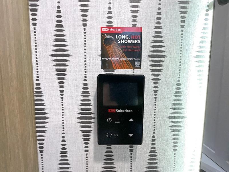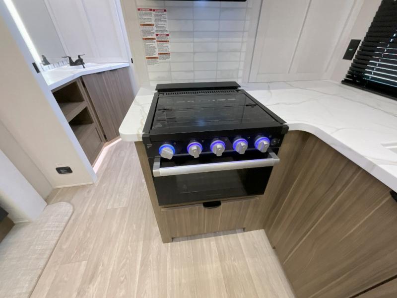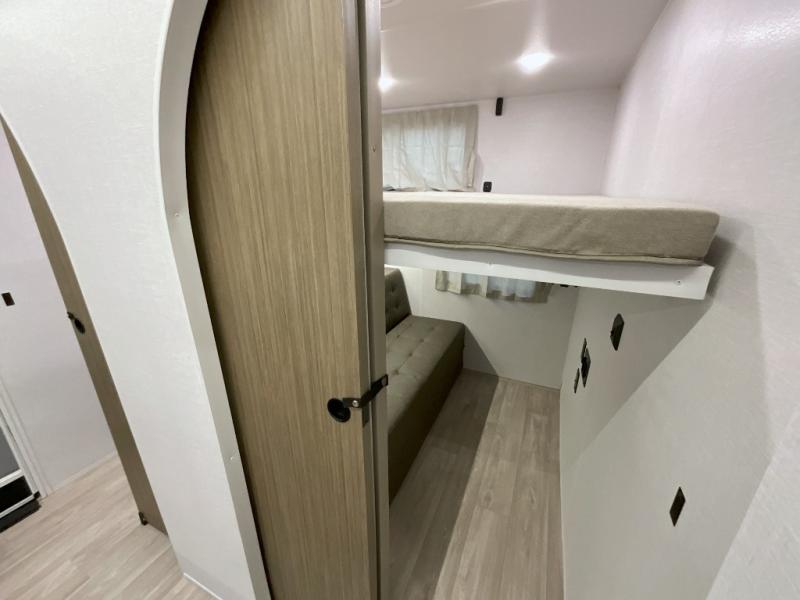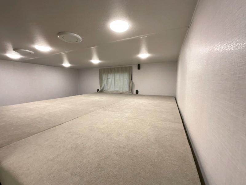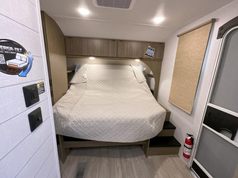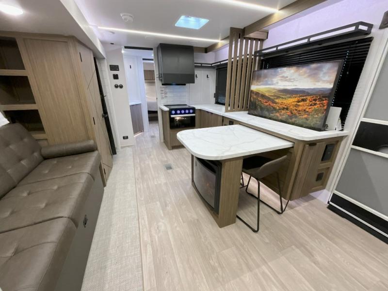 Everyone will enjoy having their own space in this travel trailer thanks to the front master bedroom and the rear bunkhouse. The bunkhouse includes a wall to separate the Versa bunk and fold-down desk on one side and a Versa sofa on the other, perfect for older kids or guests. You'll have the custom king bed with Versa Tilt all to yourselves, and the walk-thru bath will be easily accessible for everyone. In the combined kitchen and living room, a jackknife sofa slide sits across from the fireplace/entertainment center, and there is a pull-out table here so you can dine together.