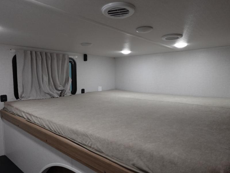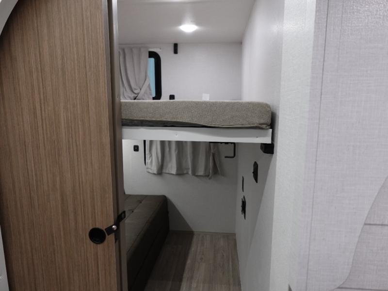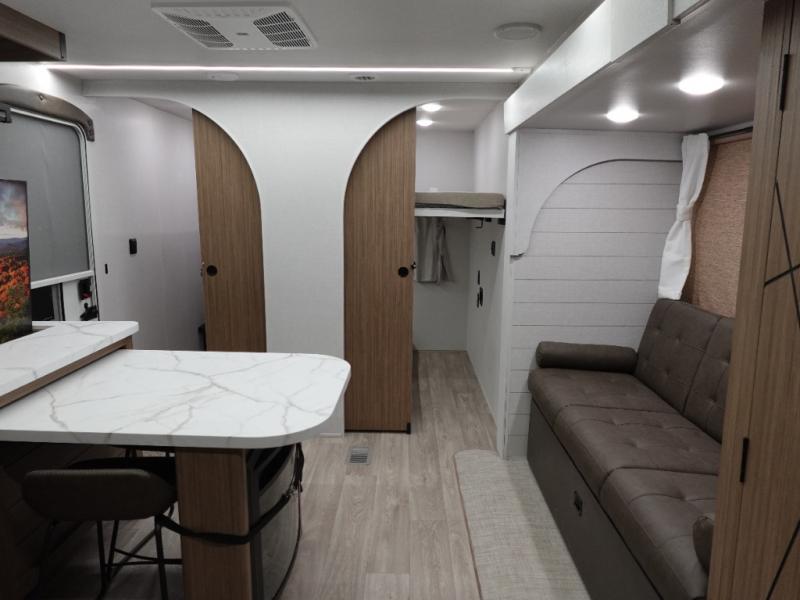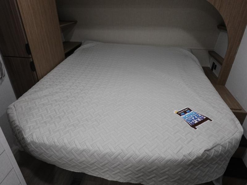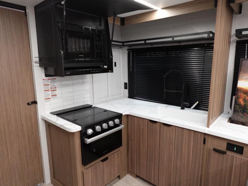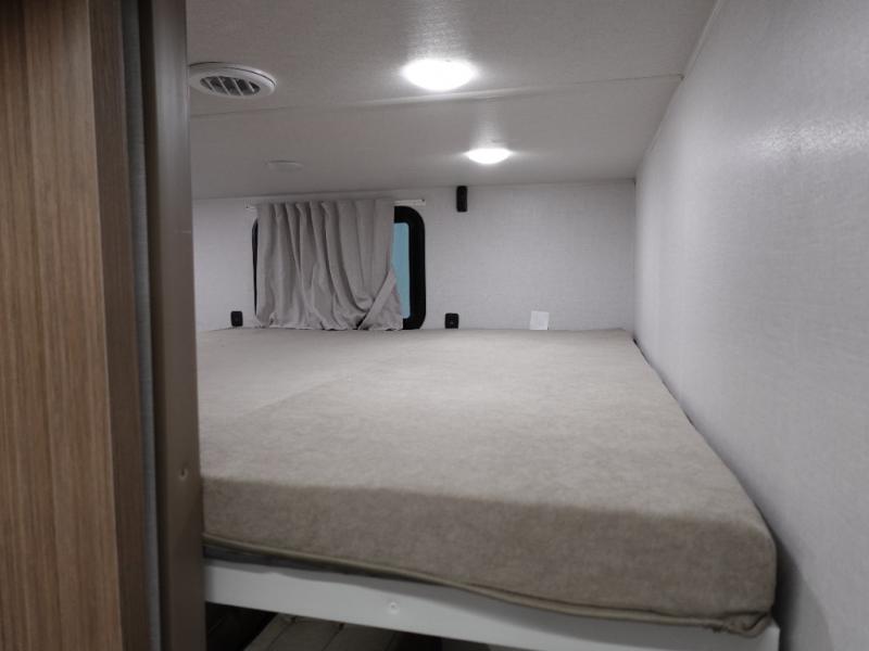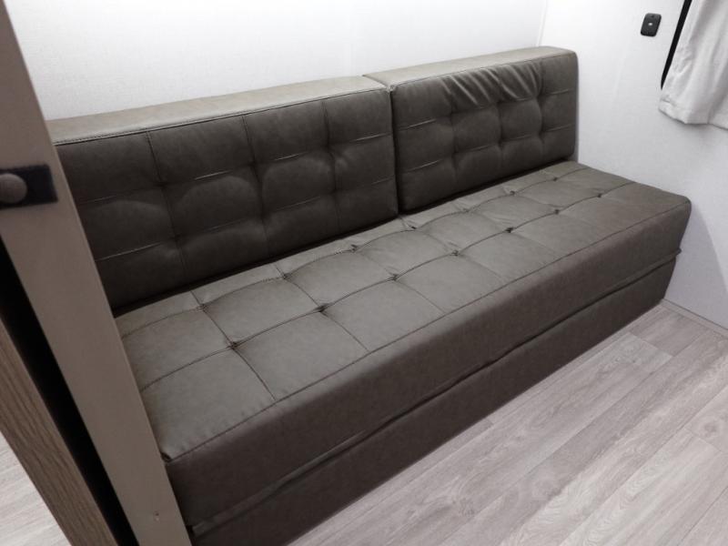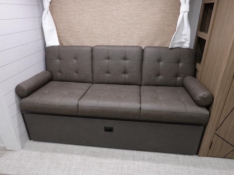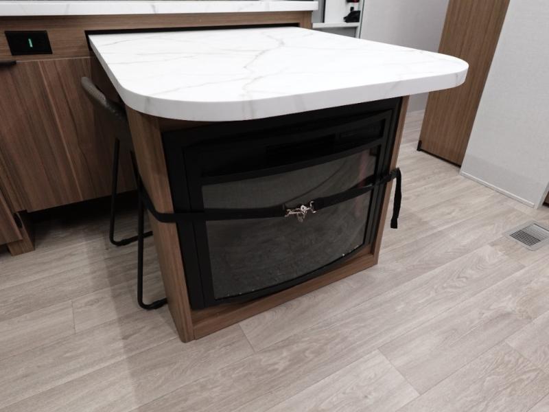 Everyone will enjoy having their own space in this travel trailer thanks to the front master bedroom and the rear bunkhouse. The bunkhouse includes a wall to separate the Versa bunk and fold-down desk on one side and a Versa sofa on the other, perfect for older kids or guests. You'll have the custom king bed with Versa Tilt all to yourselves, and the walk-thru bath will be easily accessible for everyone. In the combined kitchen and living room, a jackknife sofa slide sits across from the fireplace/entertainment center, and there is a pull-out table here so you can dine together.