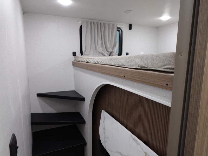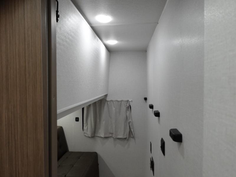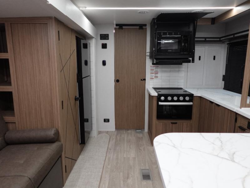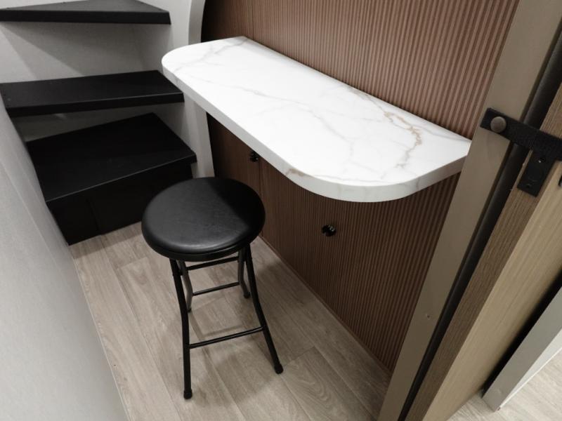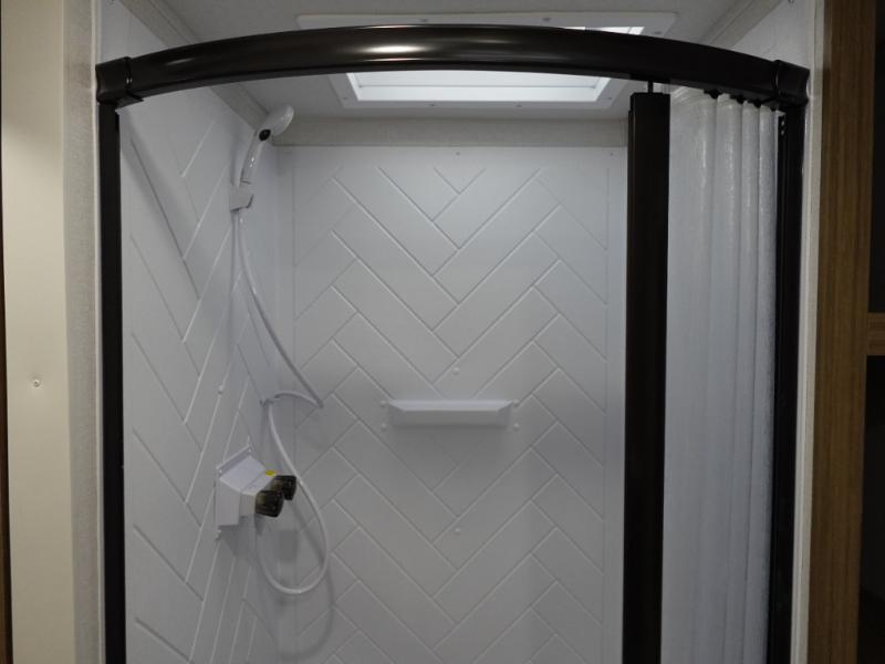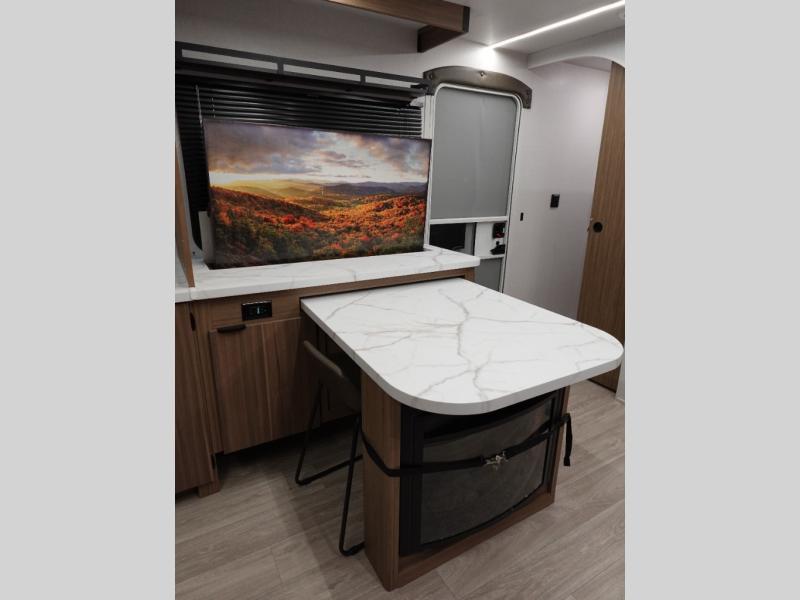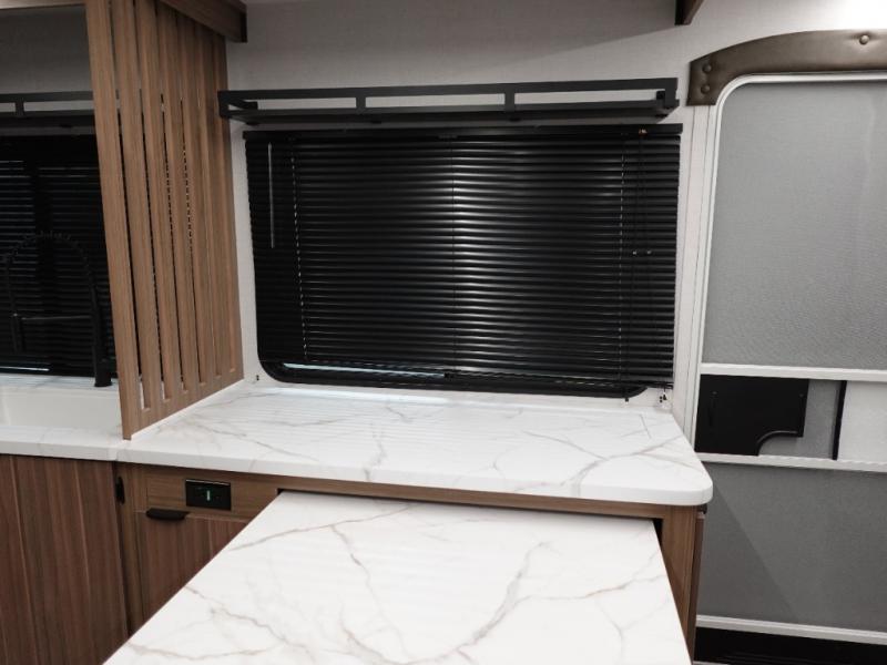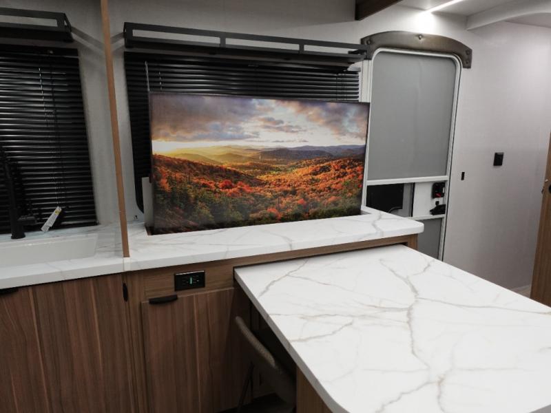 Everyone will enjoy having their own space in this travel trailer thanks to the front master bedroom and the rear bunkhouse. The bunkhouse includes a wall to separate the Versa bunk and fold-down desk on one side and a Versa sofa on the other, perfect for older kids or guests. You'll have the custom king bed with Versa Tilt all to yourselves, and the walk-thru bath will be easily accessible for everyone. In the combined kitchen and living room, a jackknife sofa slide sits across from the fireplace/entertainment center, and there is a pull-out table here so you can dine together.