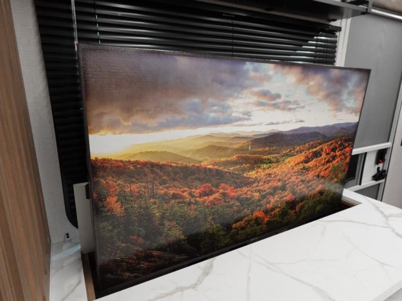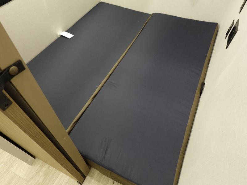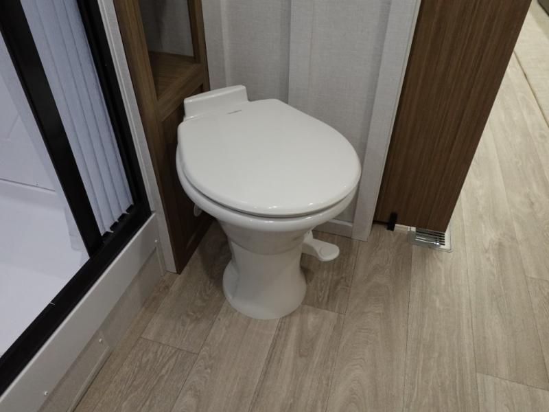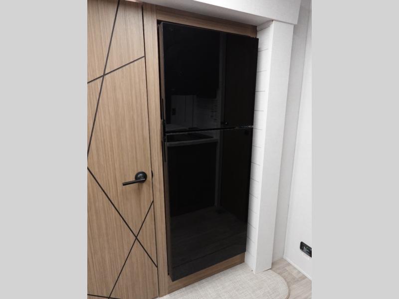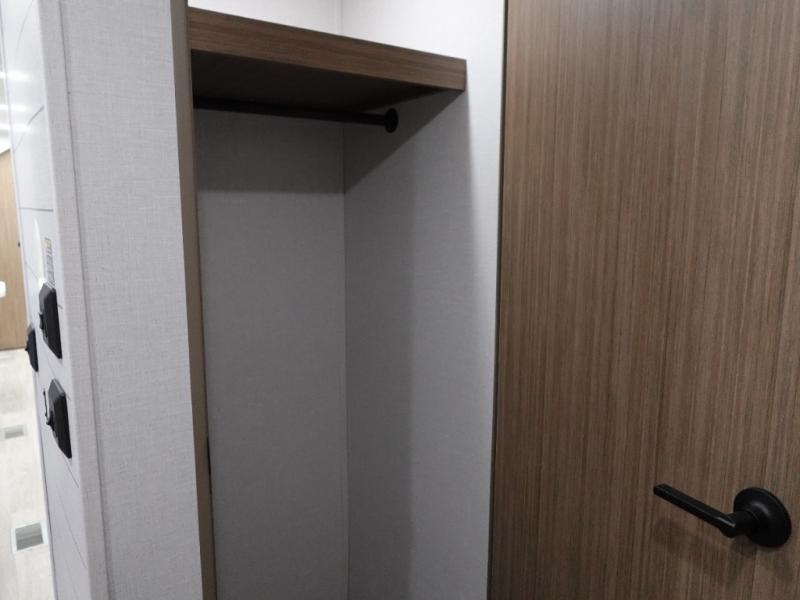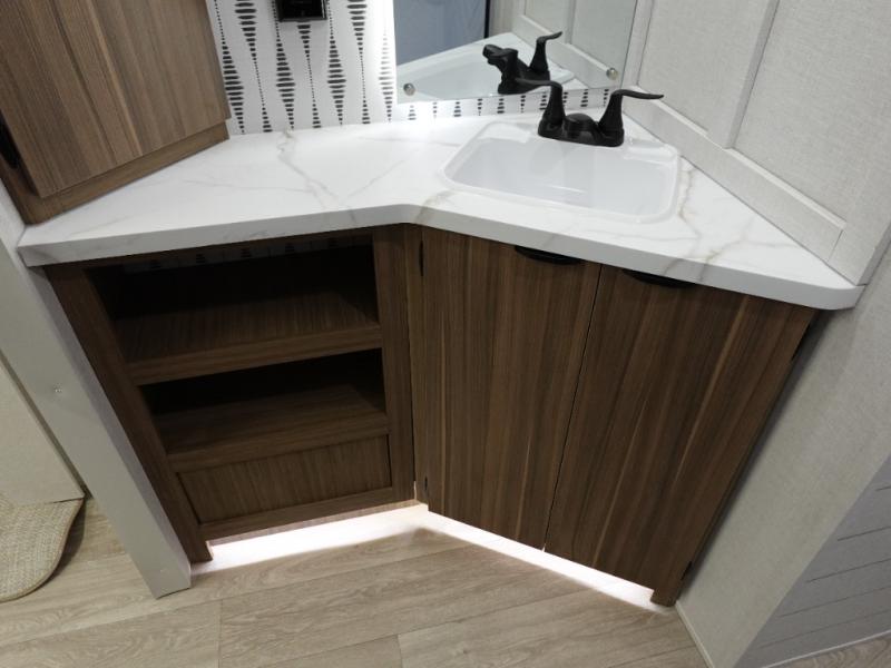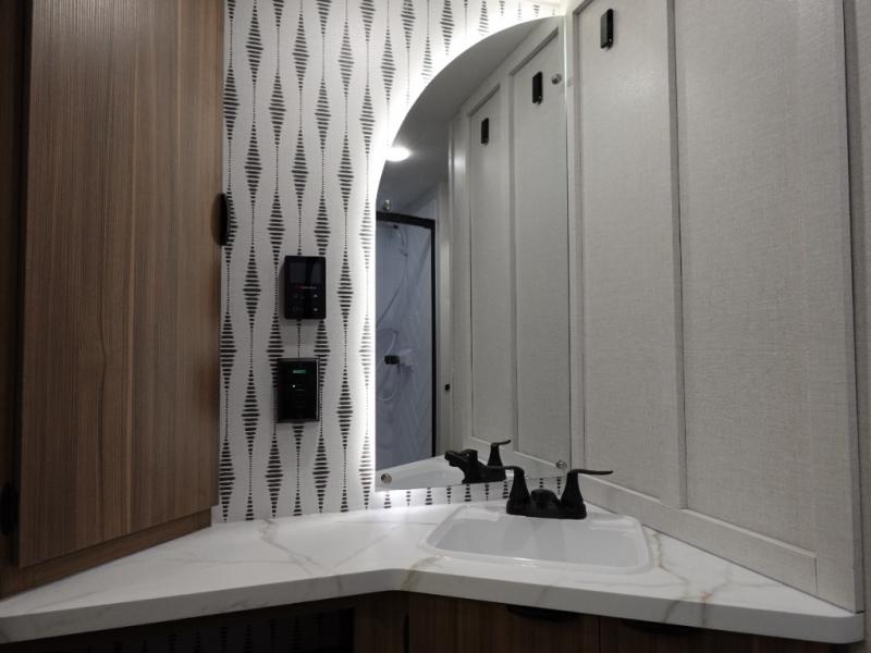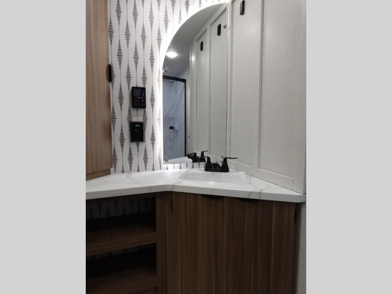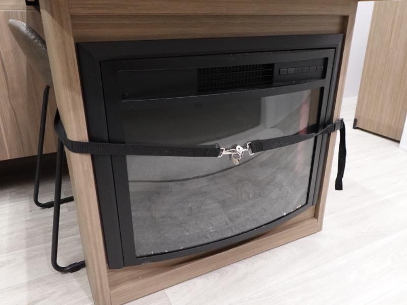 Everyone will enjoy having their own space in this travel trailer thanks to the front master bedroom and the rear bunkhouse. The bunkhouse includes a wall to separate the Versa bunk and fold-down desk on one side and a Versa sofa on the other, perfect for older kids or guests. You'll have the custom king bed with Versa Tilt all to yourselves, and the walk-thru bath will be easily accessible for everyone. In the combined kitchen and living room, a jackknife sofa slide sits across from the fireplace/entertainment center, and there is a pull-out table here so you can dine together.