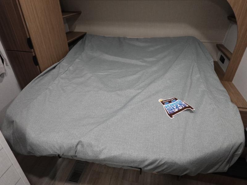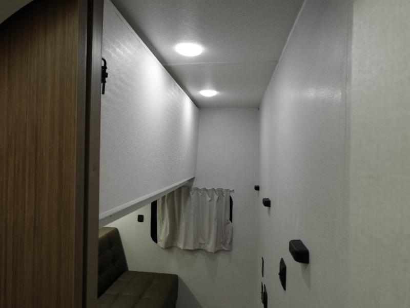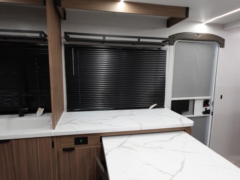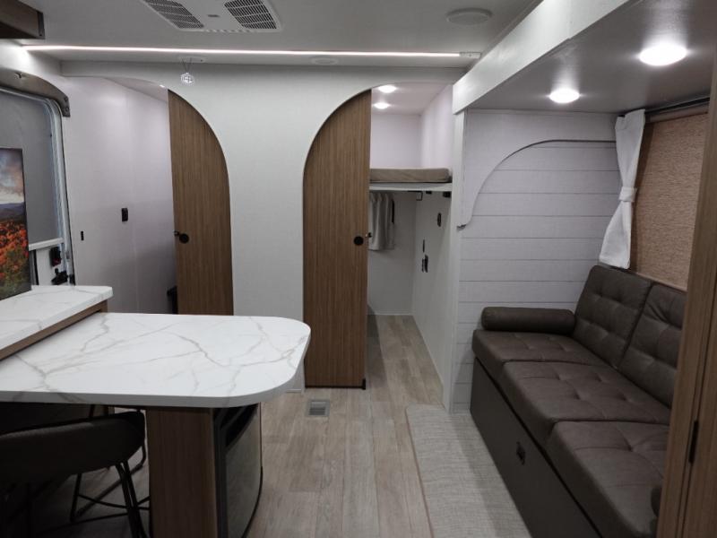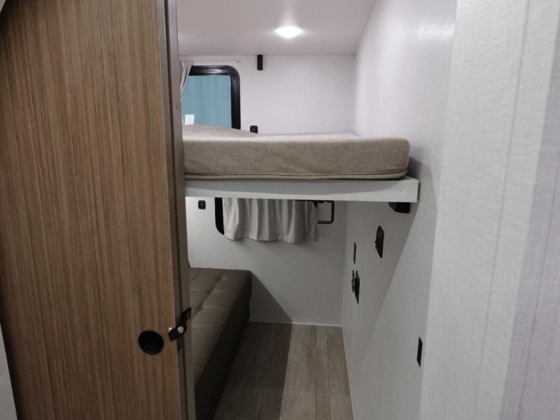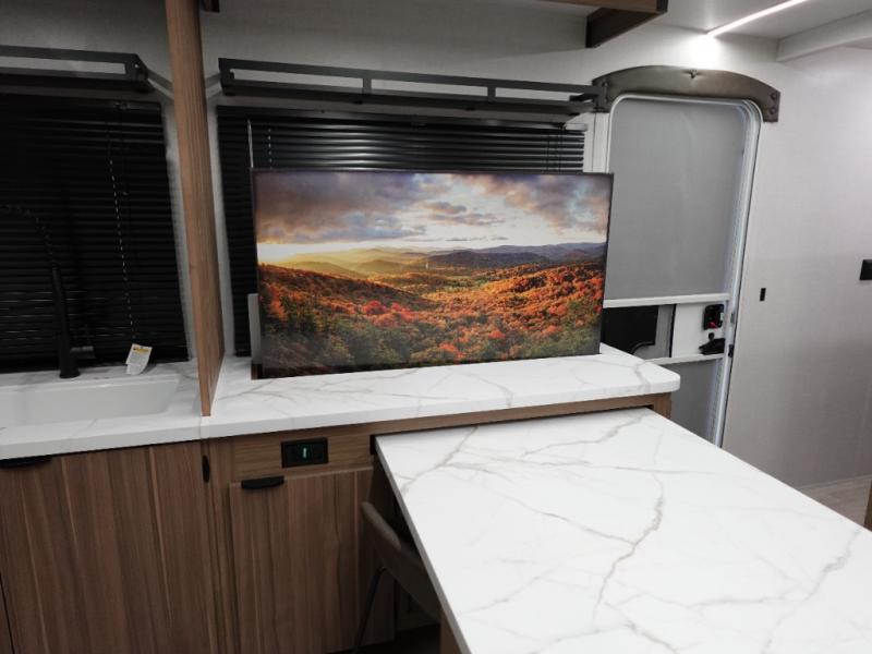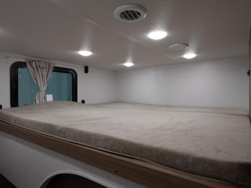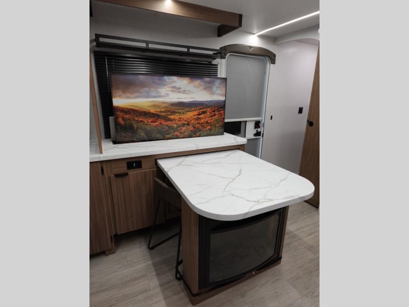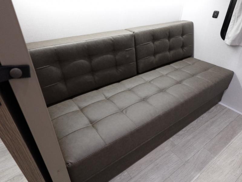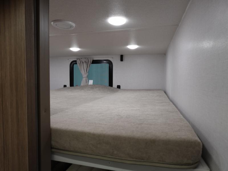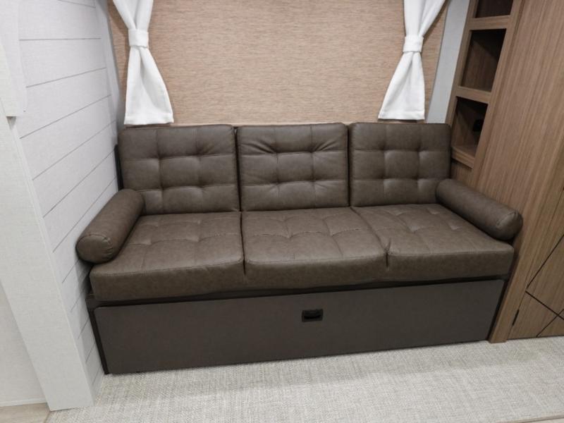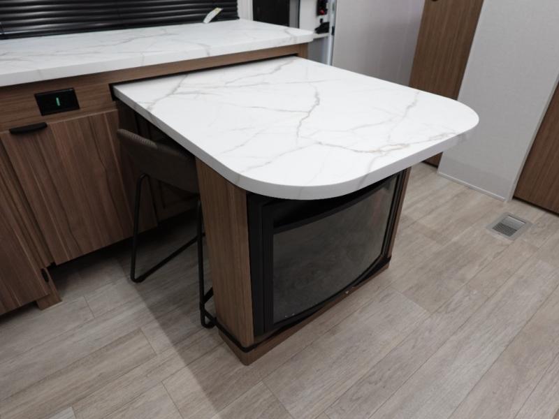 Everyone will enjoy having their own space in this travel trailer thanks to the front master bedroom and the rear bunkhouse. The bunkhouse includes a wall to separate the Versa bunk and fold-down desk on one side and a Versa sofa on the other, perfect for older kids or guests. You'll have the custom king bed with Versa Tilt all to yourselves, and the walk-thru bath will be easily accessible for everyone. In the combined kitchen and living room, a jackknife sofa slide sits across from the fireplace/entertainment center, and there is a pull-out table here so you can dine together.