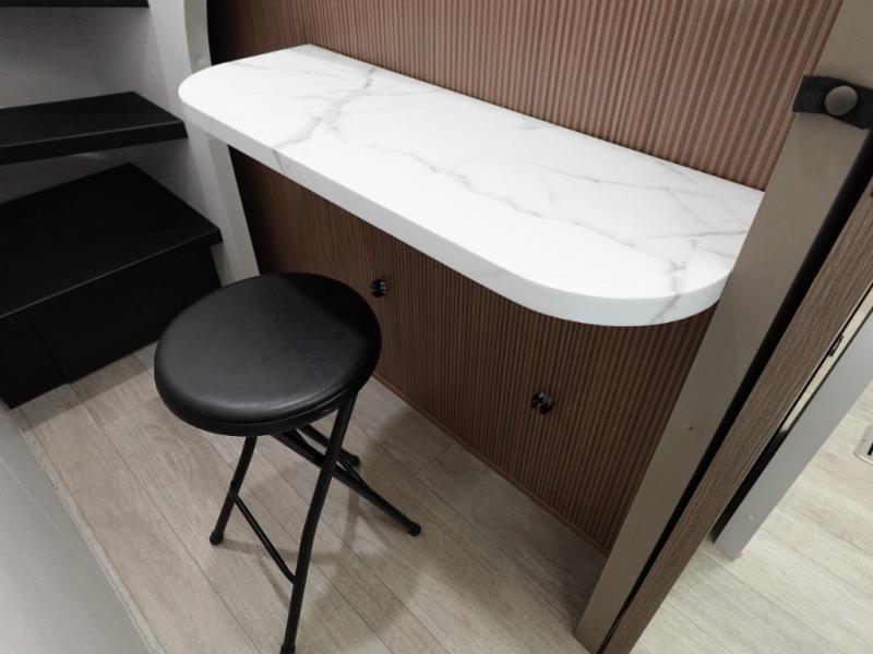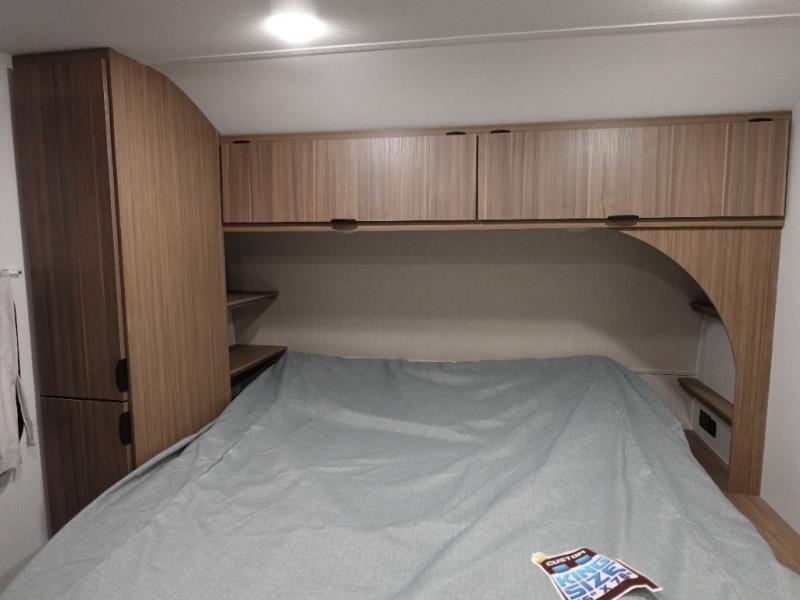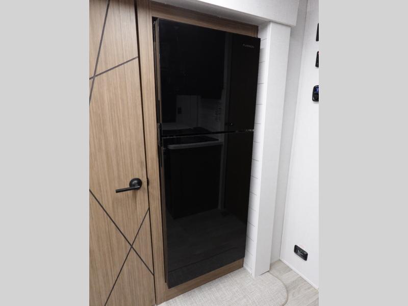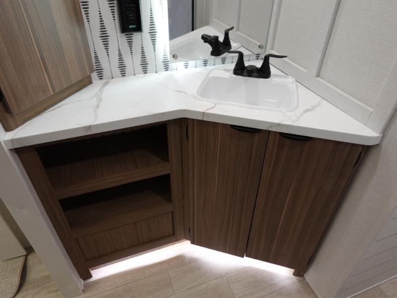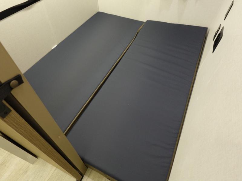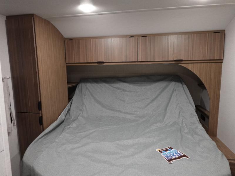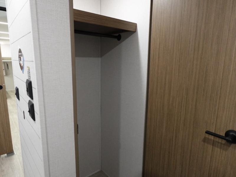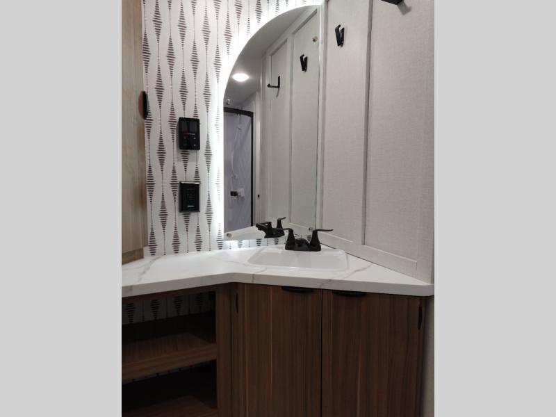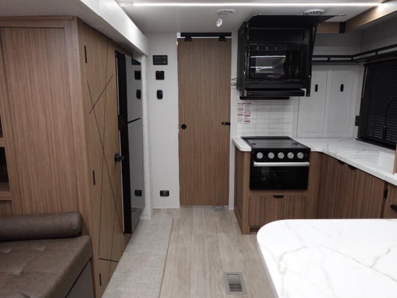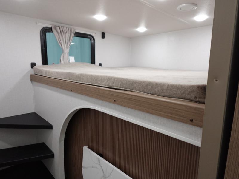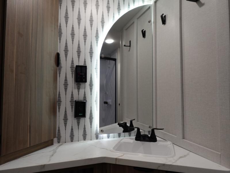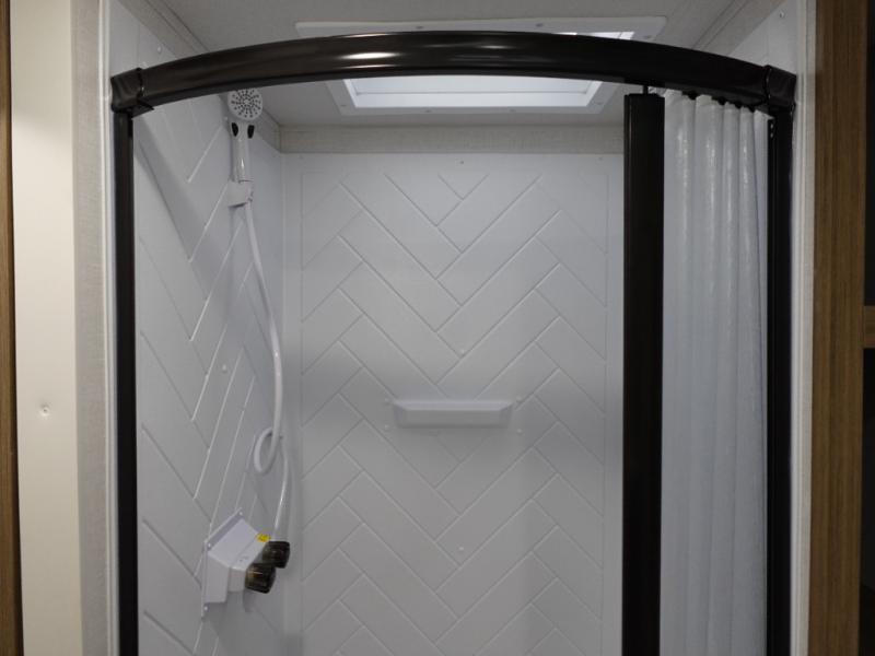 Everyone will enjoy having their own space in this travel trailer thanks to the front master bedroom and the rear bunkhouse. The bunkhouse includes a wall to separate the Versa bunk and fold-down desk on one side and a Versa sofa on the other, perfect for older kids or guests. You'll have the custom king bed with Versa Tilt all to yourselves, and the walk-thru bath will be easily accessible for everyone. In the combined kitchen and living room, a jackknife sofa slide sits across from the fireplace/entertainment center, and there is a pull-out table here so you can dine together.