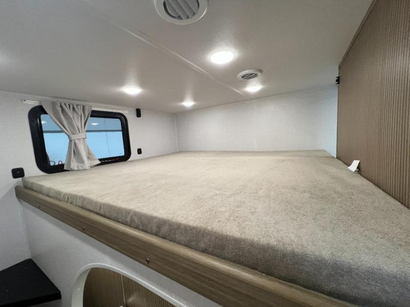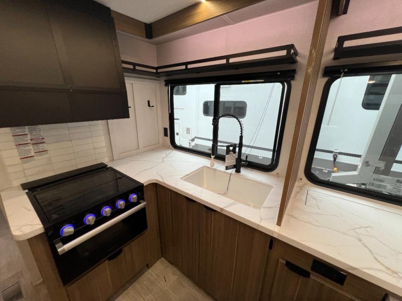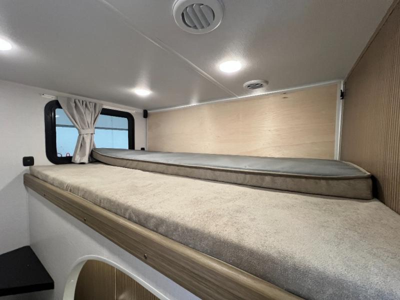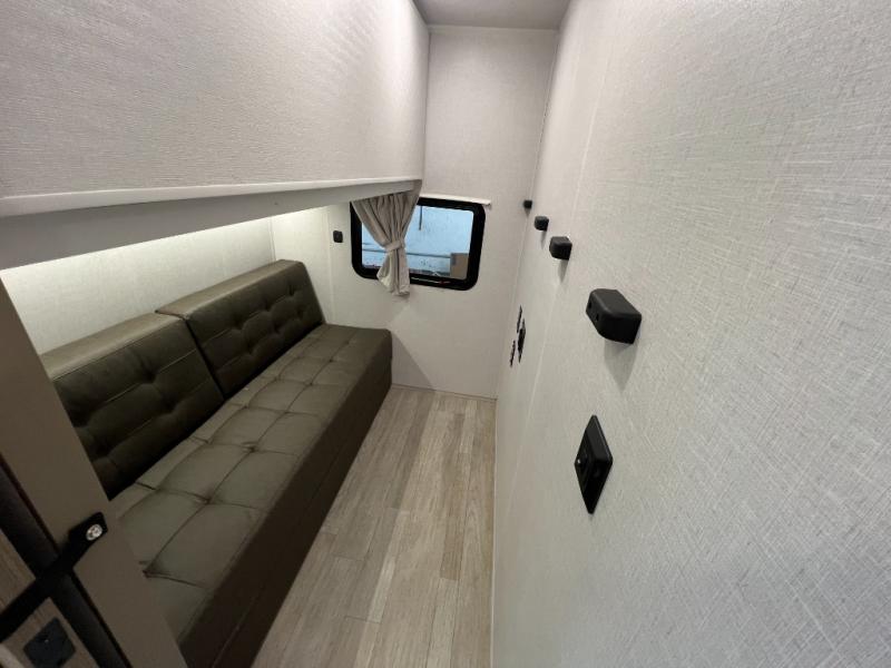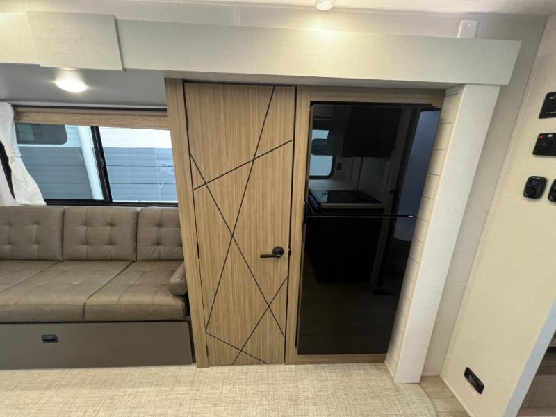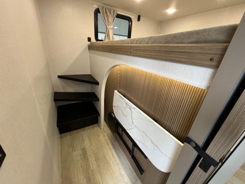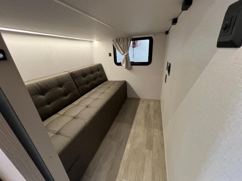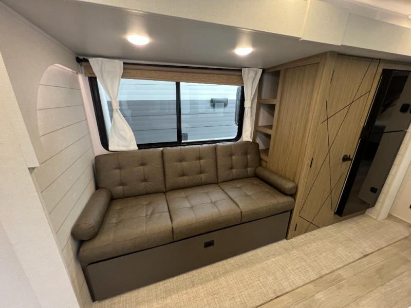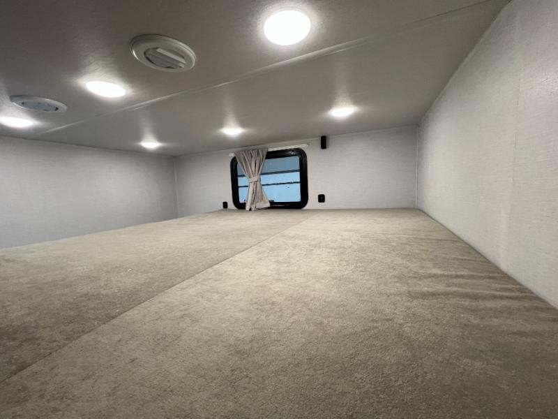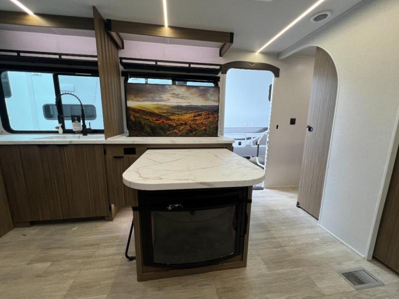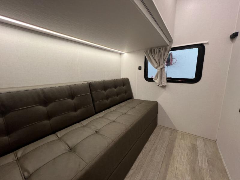 Everyone will enjoy having their own space in this travel trailer thanks to the front master bedroom and the rear bunkhouse. The bunkhouse includes a wall to separate the Versa bunk and fold-down desk on one side and a Versa sofa on the other, perfect for older kids or guests. You'll have the custom king bed with Versa Tilt all to yourselves, and the walk-thru bath will be easily accessible for everyone. In the combined kitchen and living room, a jackknife sofa slide sits across from the fireplace/entertainment center, and there is a pull-out table here so you can dine together.