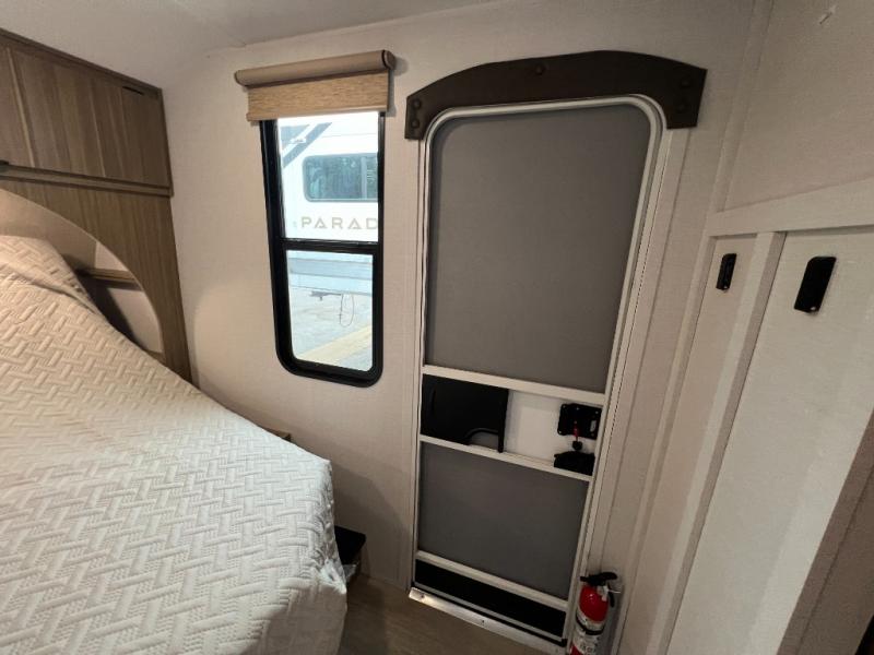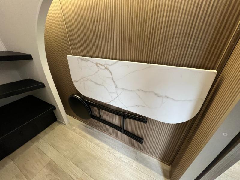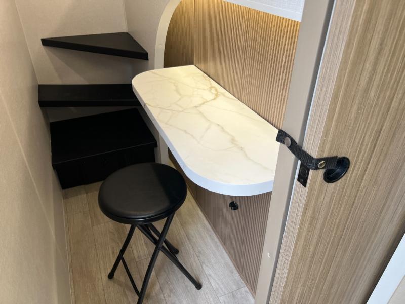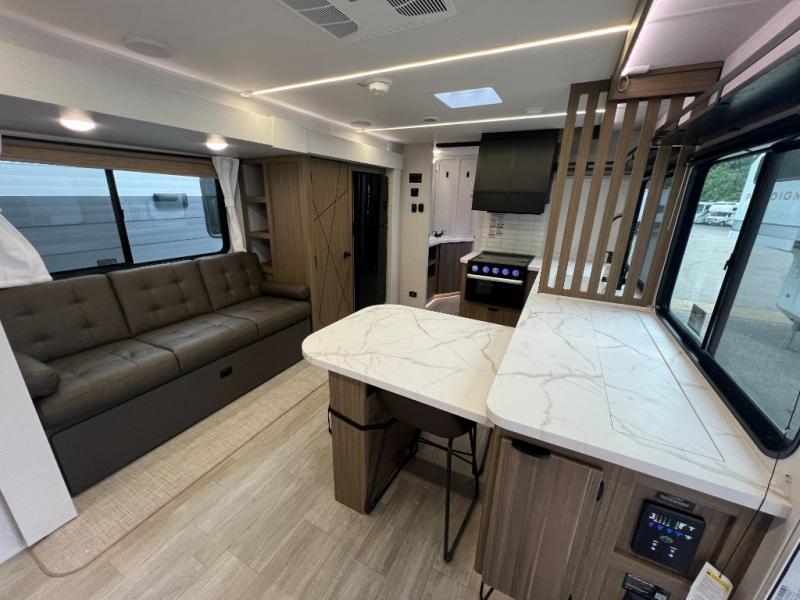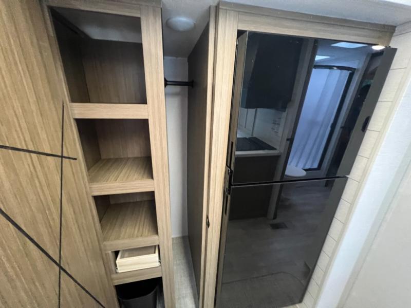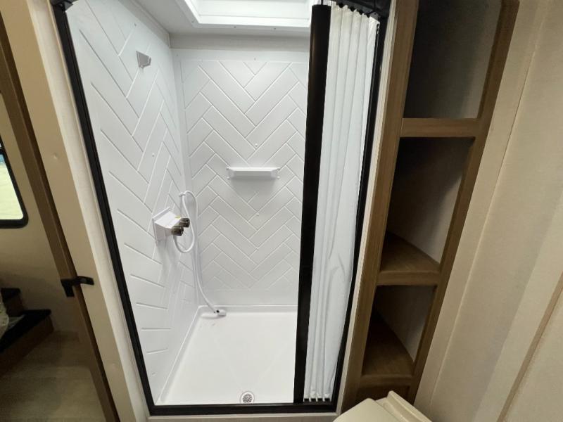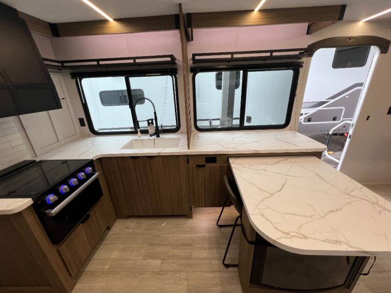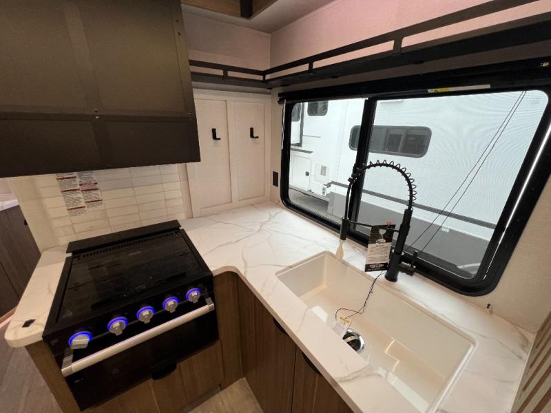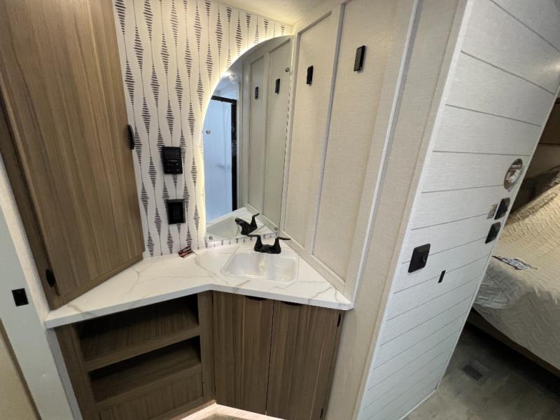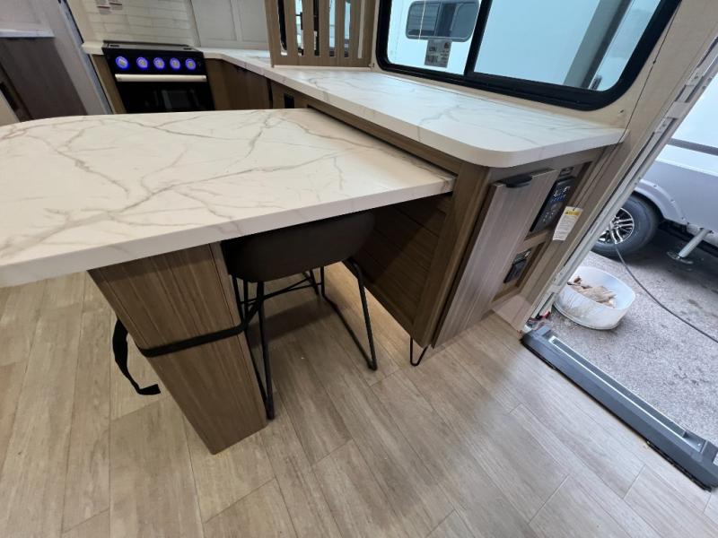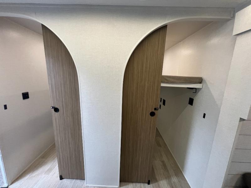 Everyone will enjoy having their own space in this travel trailer thanks to the front master bedroom and the rear bunkhouse. The bunkhouse includes a wall to separate the Versa bunk and fold-down desk on one side and a Versa sofa on the other, perfect for older kids or guests. You'll have the custom king bed with Versa Tilt all to yourselves, and the walk-thru bath will be easily accessible for everyone. In the combined kitchen and living room, a jackknife sofa slide sits across from the fireplace/entertainment center, and there is a pull-out table here so you can dine together.