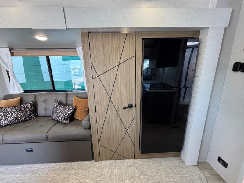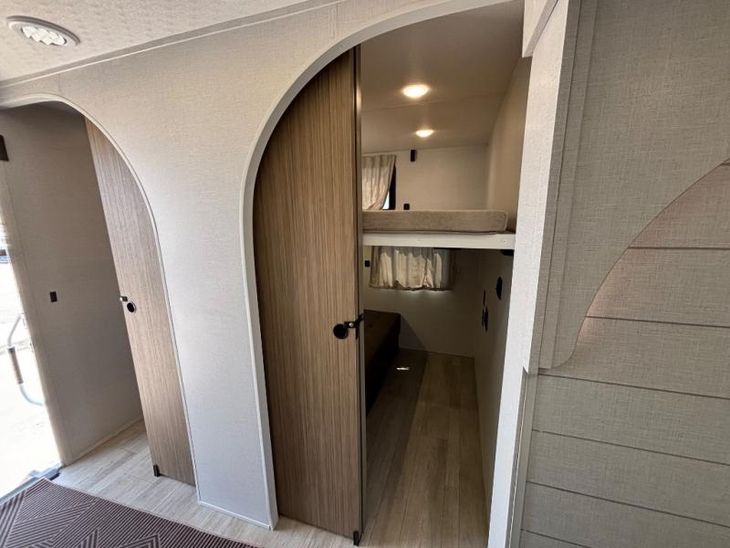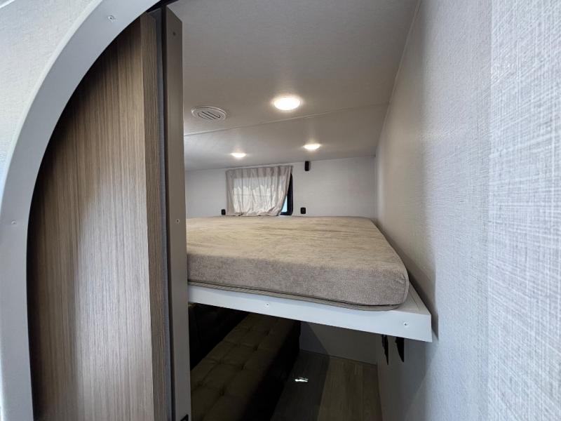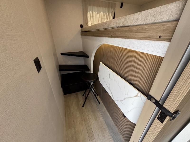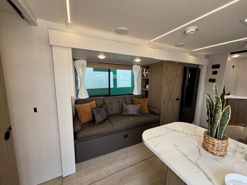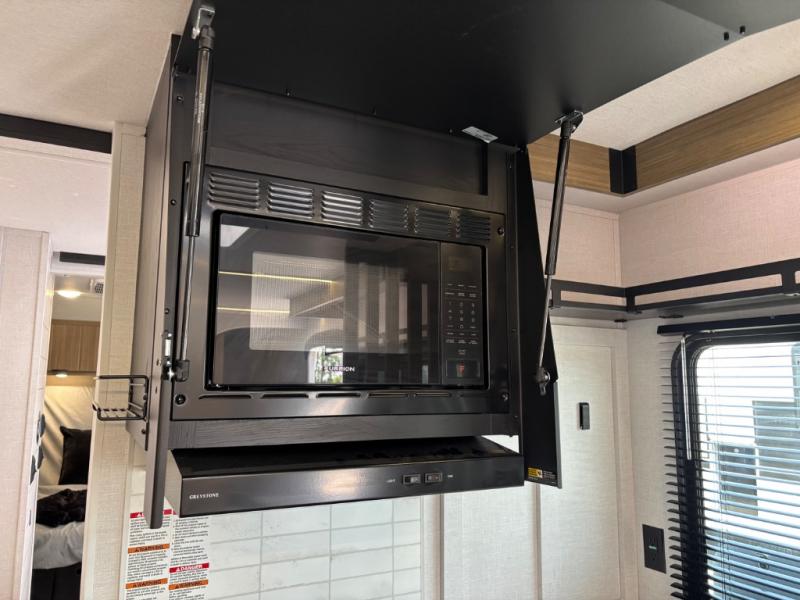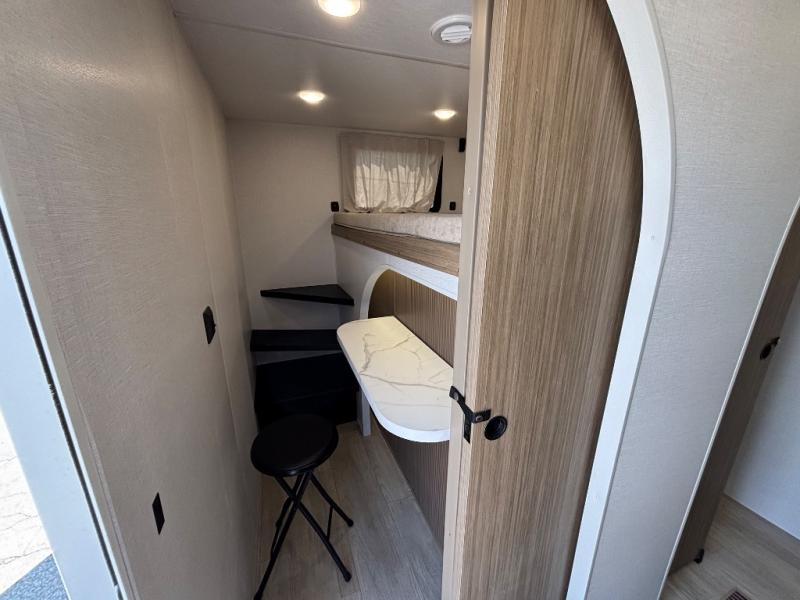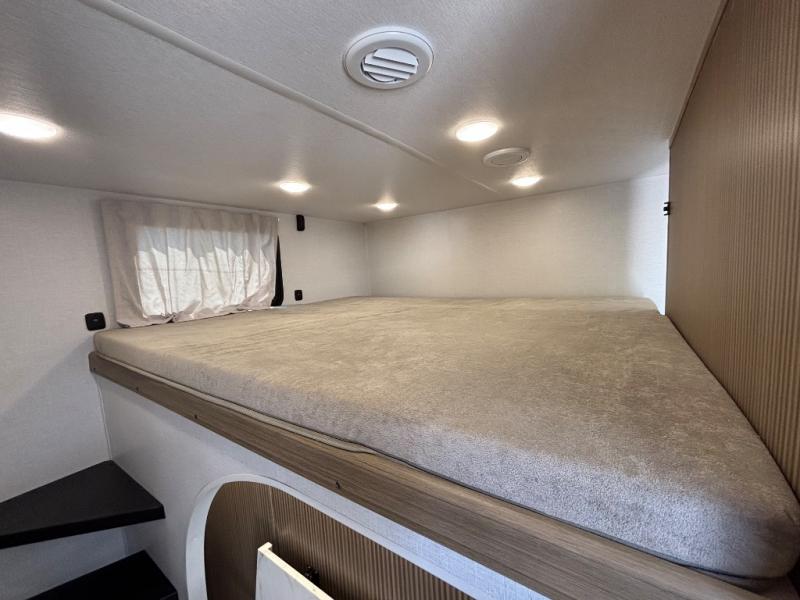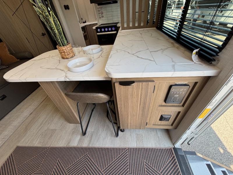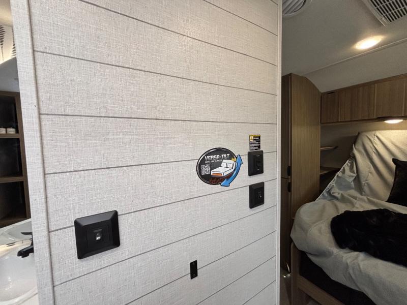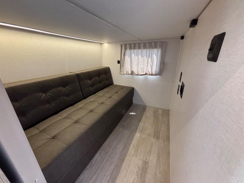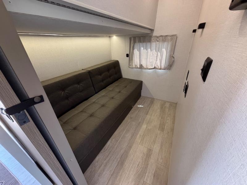 Everyone will enjoy having their own space in this travel trailer thanks to the front master bedroom and the rear bunkhouse. The bunkhouse includes a wall to separate the Versa bunk and fold-down desk on one side and a Versa sofa on the other, perfect for older kids or guests. You'll have the custom king bed with Versa Tilt all to yourselves, and the walk-thru bath will be easily accessible for everyone. In the combined kitchen and living room, a jackknife sofa slide sits across from the fireplace/entertainment center, and there is a pull-out table here so you can dine together.