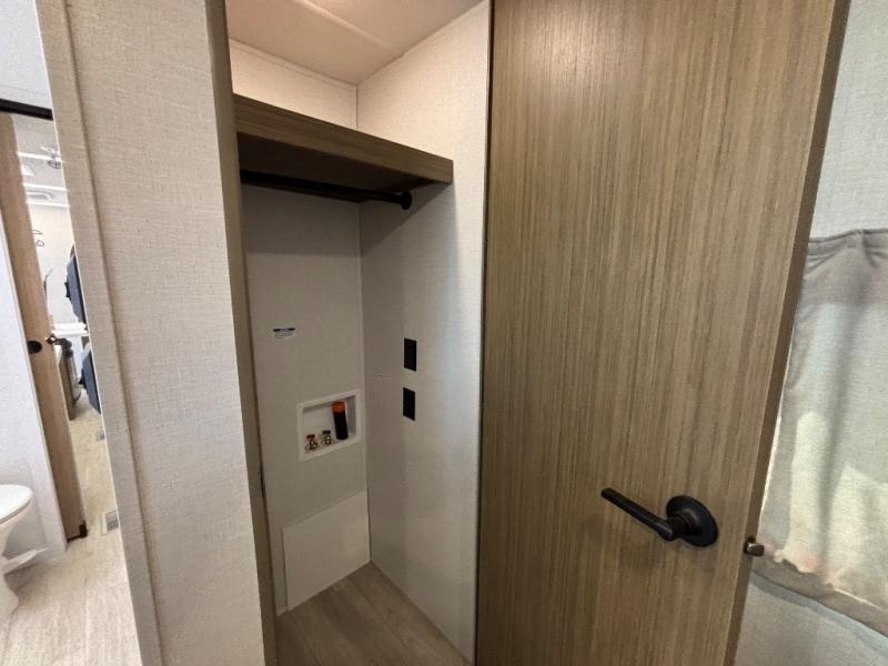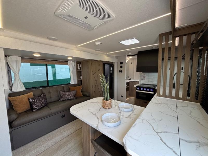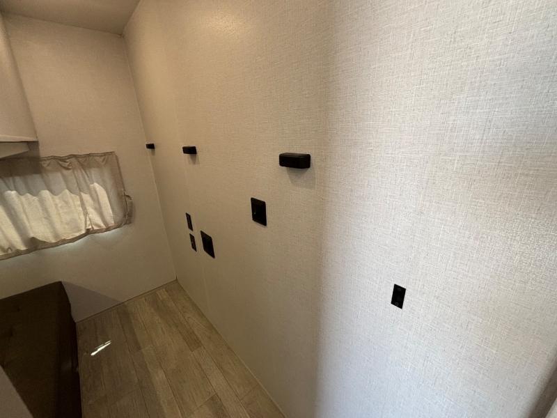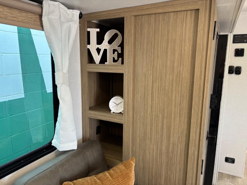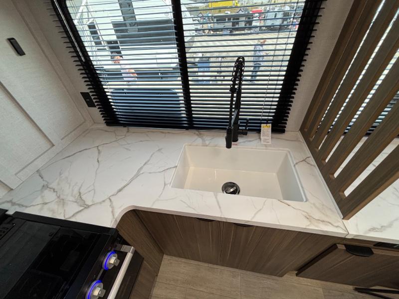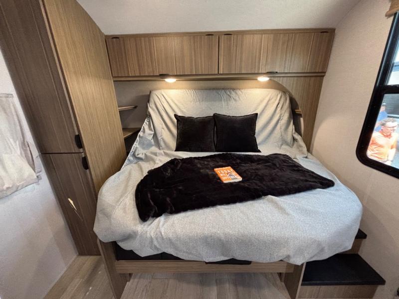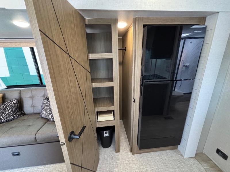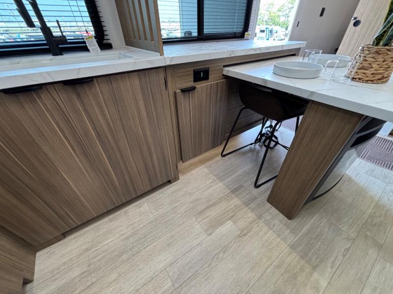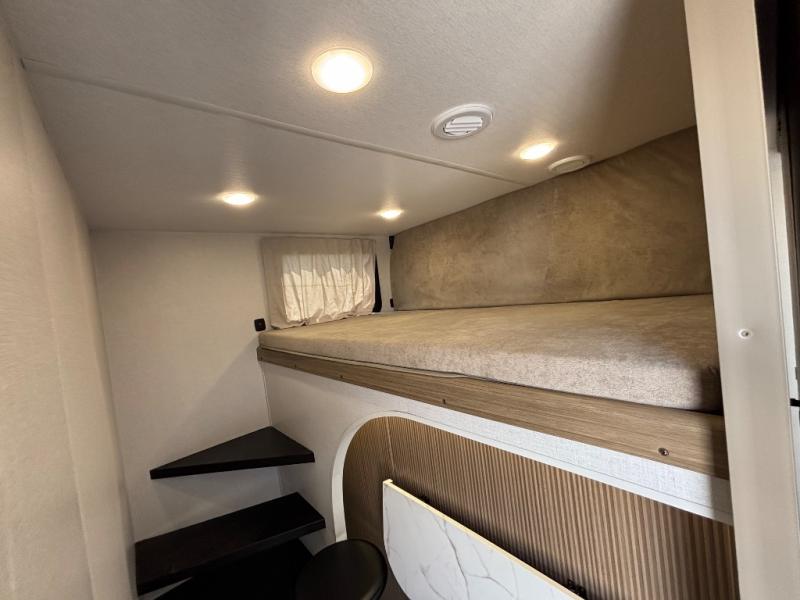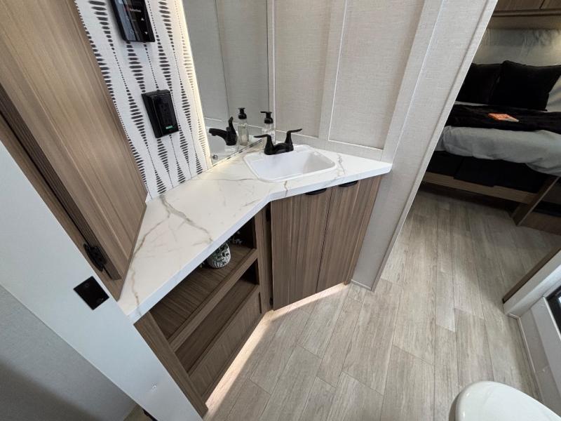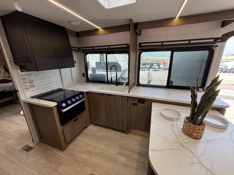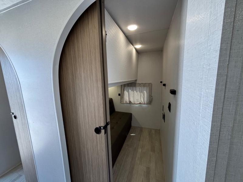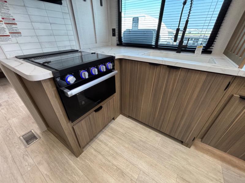 Everyone will enjoy having their own space in this travel trailer thanks to the front master bedroom and the rear bunkhouse. The bunkhouse includes a wall to separate the Versa bunk and fold-down desk on one side and a Versa sofa on the other, perfect for older kids or guests. You'll have the custom king bed with Versa Tilt all to yourselves, and the walk-thru bath will be easily accessible for everyone. In the combined kitchen and living room, a jackknife sofa slide sits across from the fireplace/entertainment center, and there is a pull-out table here so you can dine together.