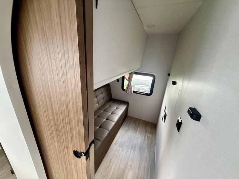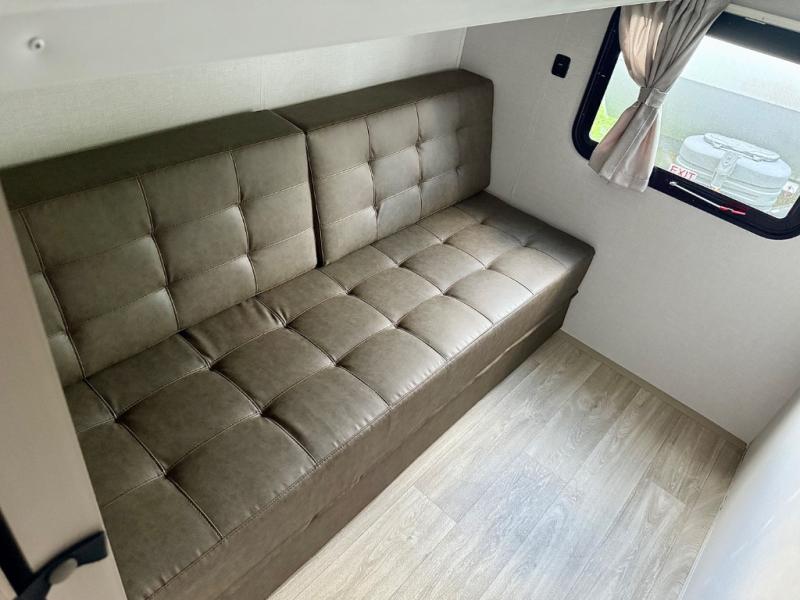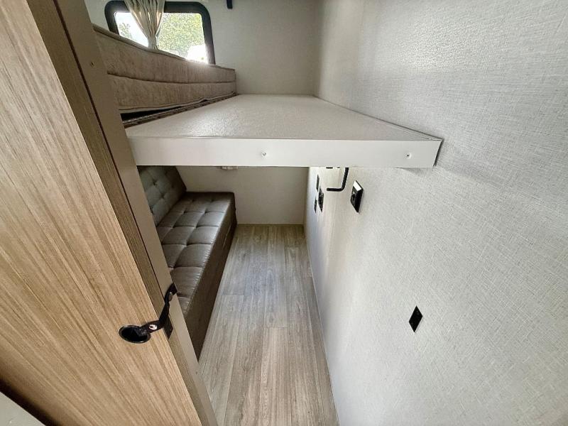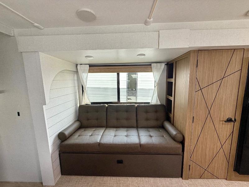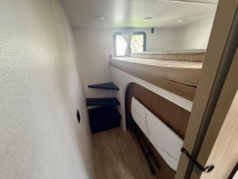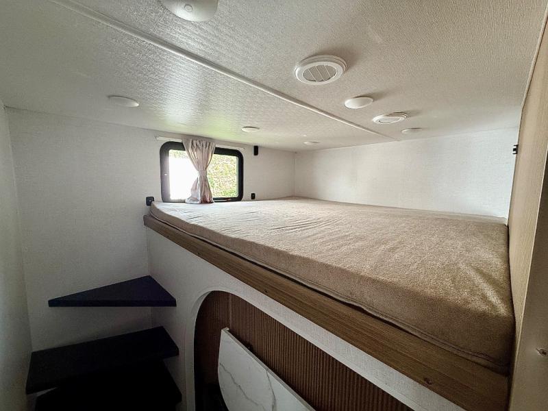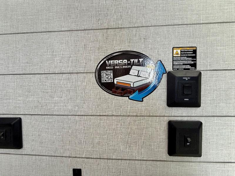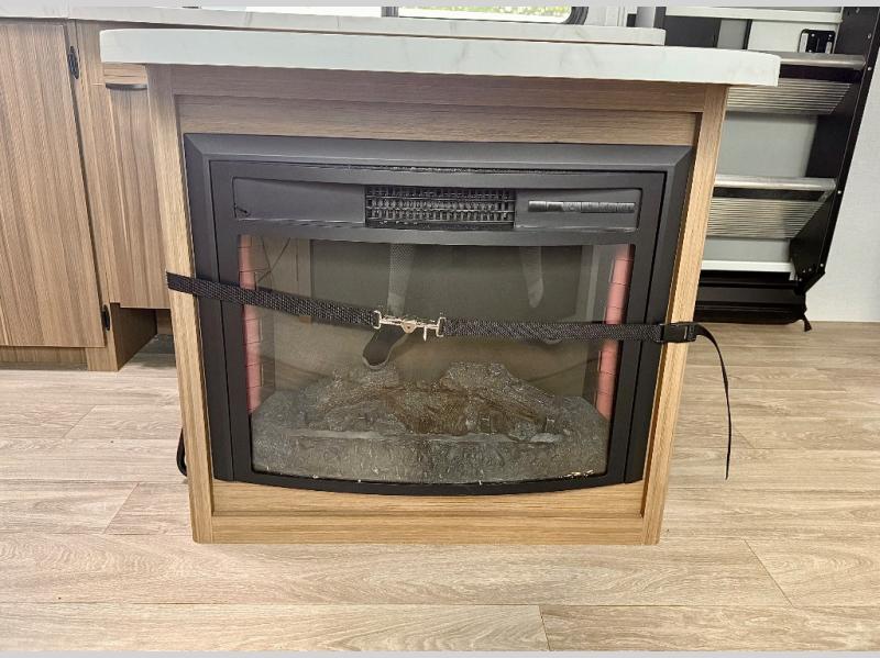 Everyone will enjoy having their own space in this travel trailer thanks to the front master bedroom and the rear bunkhouse. The bunkhouse includes a wall to separate the Versa bunk and fold-down desk on one side and a Versa sofa on the other, perfect for older kids or guests. You'll have the custom king bed with Versa Tilt all to yourselves, and the walk-thru bath will be easily accessible for everyone. In the combined kitchen and living room, a jackknife sofa slide sits across from the fireplace/entertainment center, and there is a pull-out table here so you can dine together.