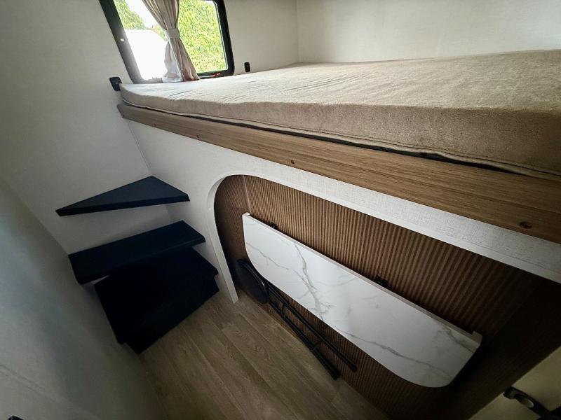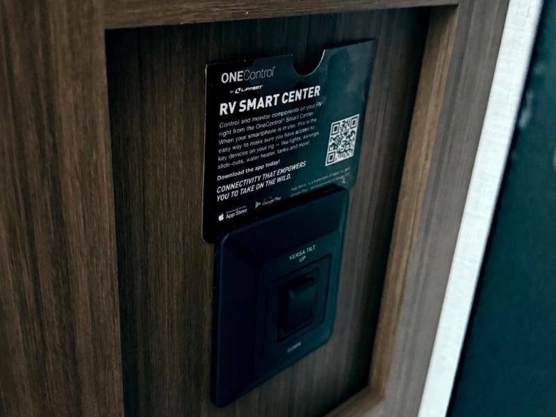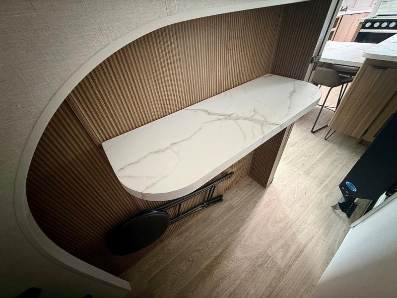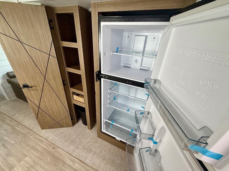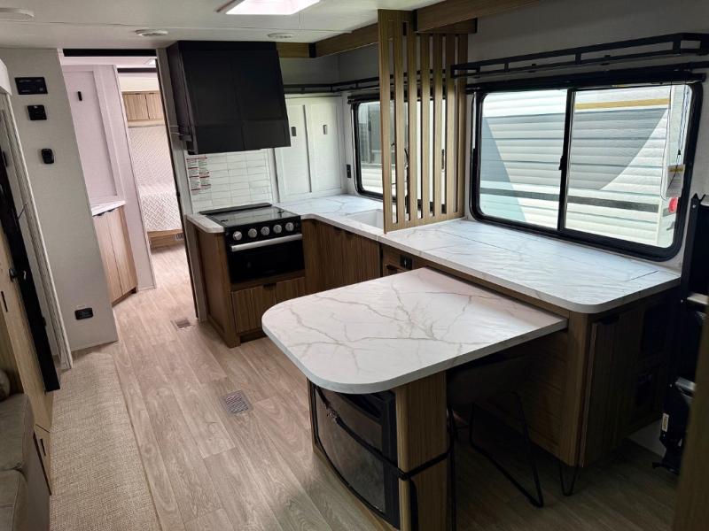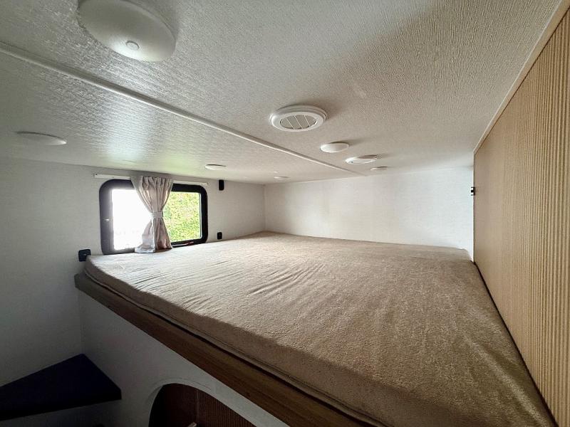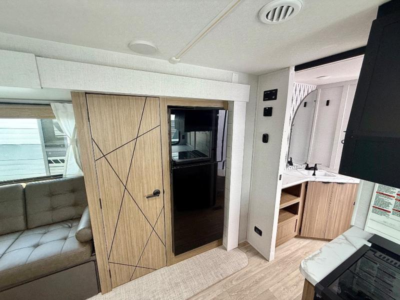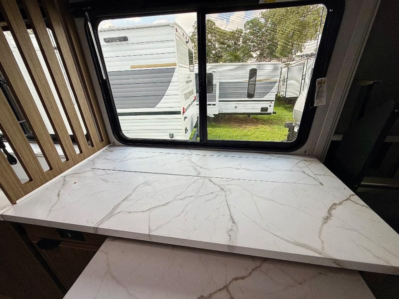 Everyone will enjoy having their own space in this travel trailer thanks to the front master bedroom and the rear bunkhouse. The bunkhouse includes a wall to separate the Versa bunk and fold-down desk on one side and a Versa sofa on the other, perfect for older kids or guests. You'll have the custom king bed with Versa Tilt all to yourselves, and the walk-thru bath will be easily accessible for everyone. In the combined kitchen and living room, a jackknife sofa slide sits across from the fireplace/entertainment center, and there is a pull-out table here so you can dine together.