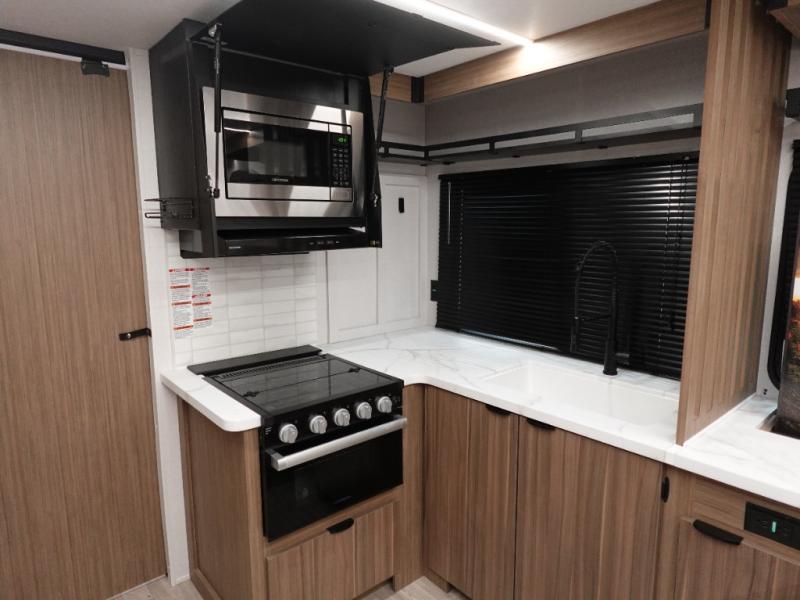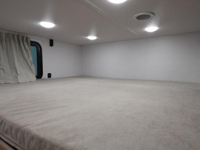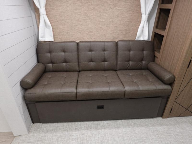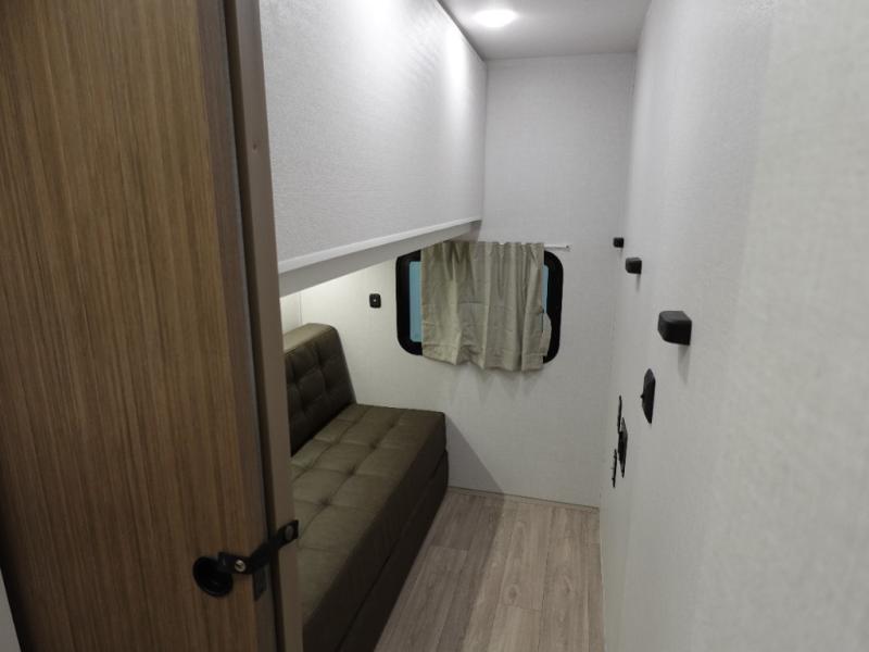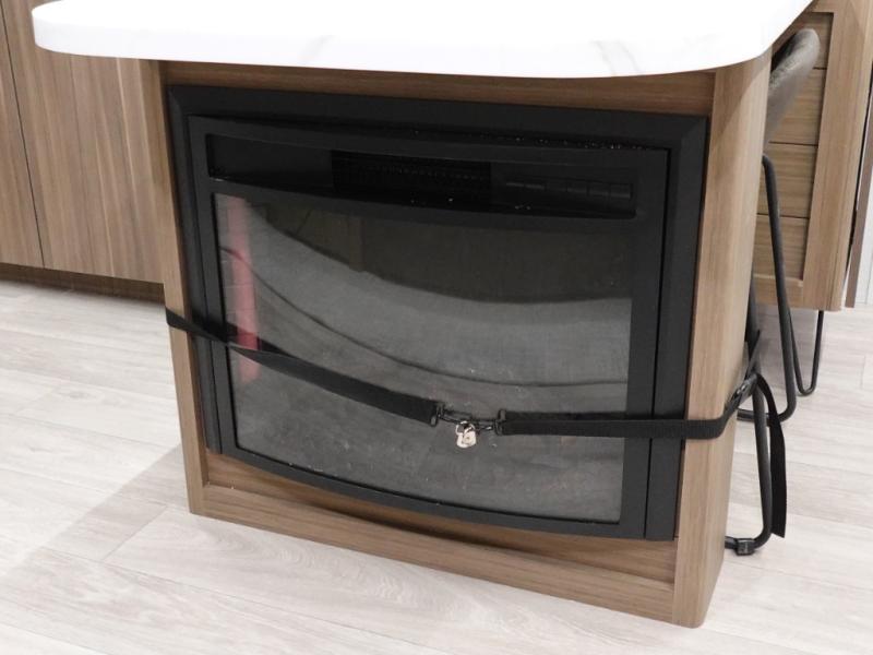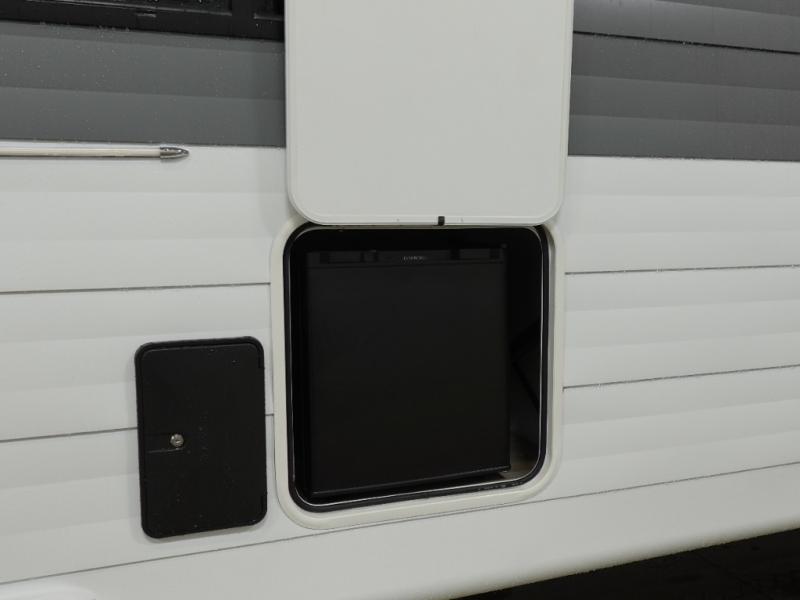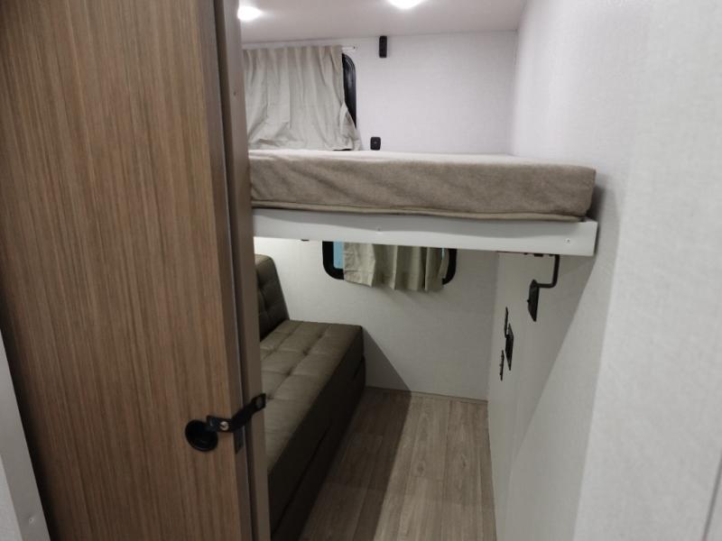 Everyone will enjoy having their own space in this travel trailer thanks to the front master bedroom and the rear bunkhouse. The bunkhouse includes a wall to separate the Versa bunk and fold-down desk on one side and a Versa sofa on the other, perfect for older kids or guests. You'll have the custom king bed with Versa Tilt all to yourselves, and the walk-thru bath will be easily accessible for everyone. In the combined kitchen and living room, a jackknife sofa slide sits across from the fireplace/entertainment center, and there is a pull-out table here so you can dine together.