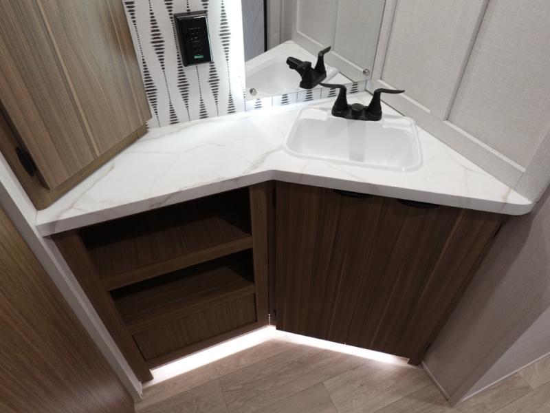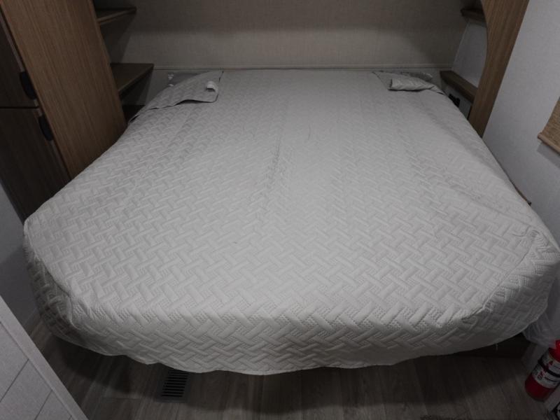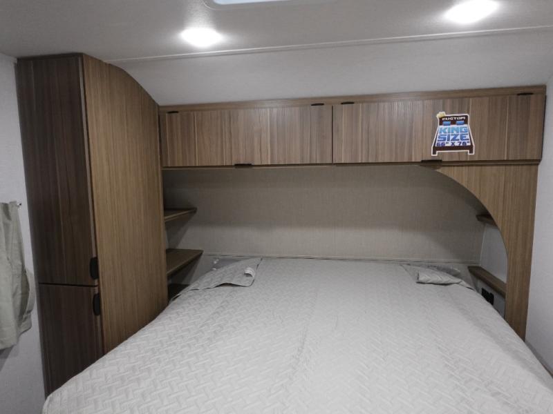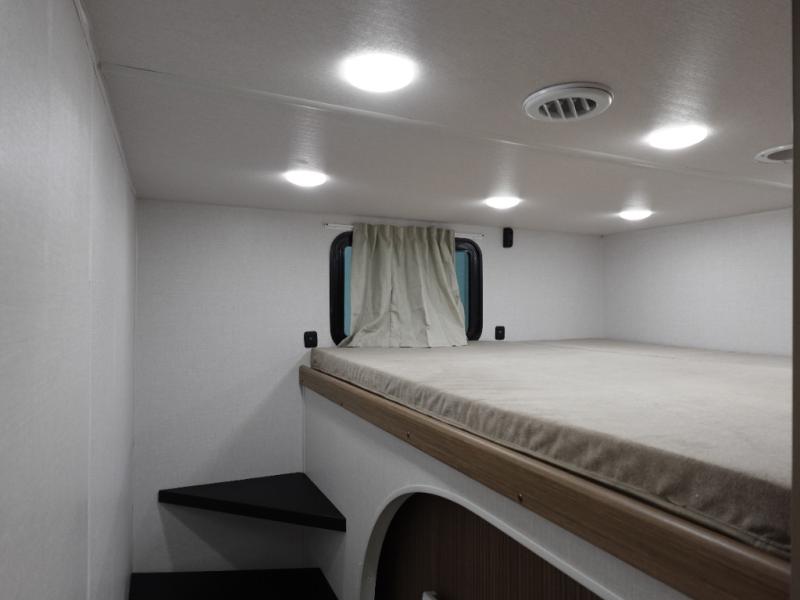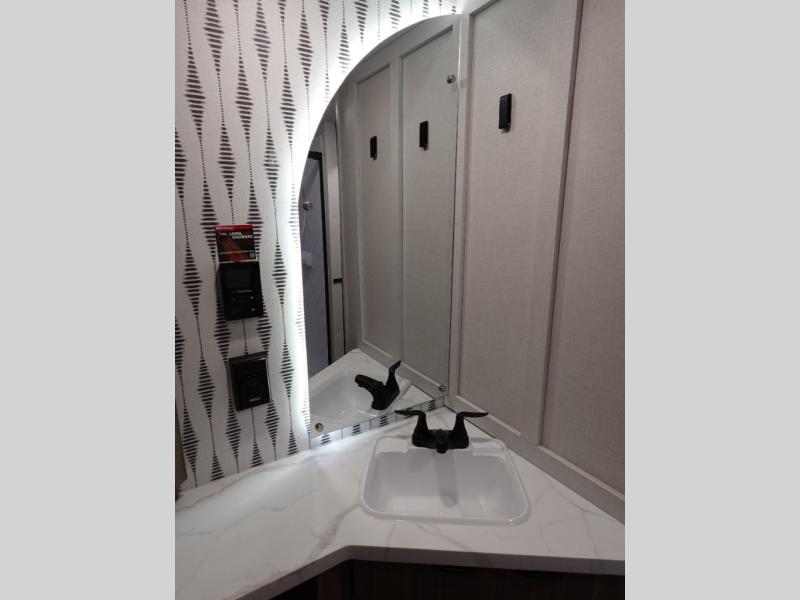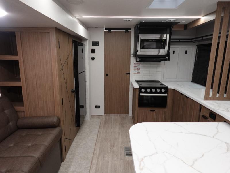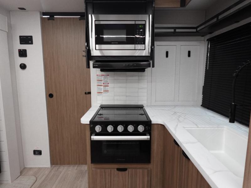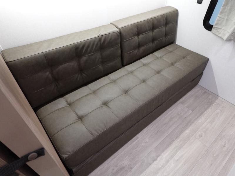 Everyone will enjoy having their own space in this travel trailer thanks to the front master bedroom and the rear bunkhouse. The bunkhouse includes a wall to separate the Versa bunk and fold-down desk on one side and a Versa sofa on the other, perfect for older kids or guests. You'll have the custom king bed with Versa Tilt all to yourselves, and the walk-thru bath will be easily accessible for everyone. In the combined kitchen and living room, a jackknife sofa slide sits across from the fireplace/entertainment center, and there is a pull-out table here so you can dine together.