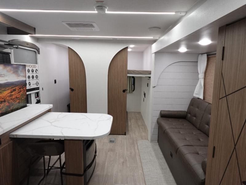 The Wildwood travel trailers are packed with hassle-free camping amenities! The heated and enclosed Accessibelly will help protect against the elements and debris during transport, and the exterior retro/metal redesign is sure to be eye-catching! There are stylish roller shades inside, along with updated backsplash, elegant curtain rods and curtains, plus many more interior comforts! Choose a Wildwood travel trailer today for quality and value!