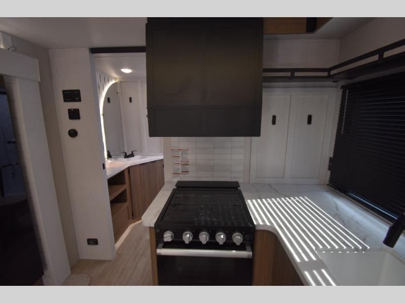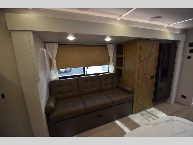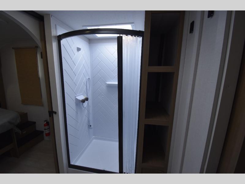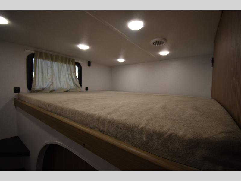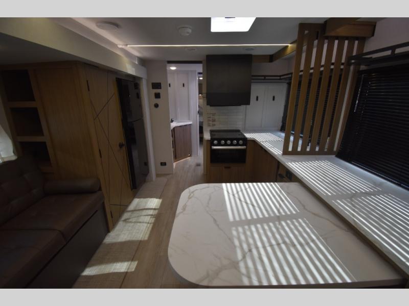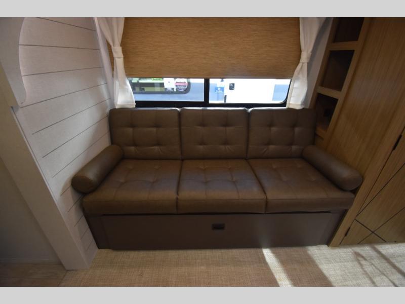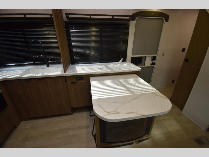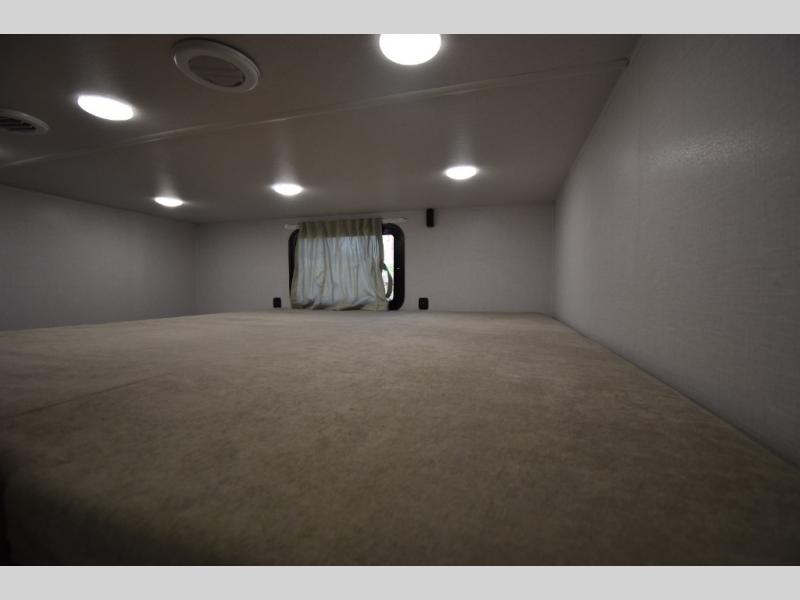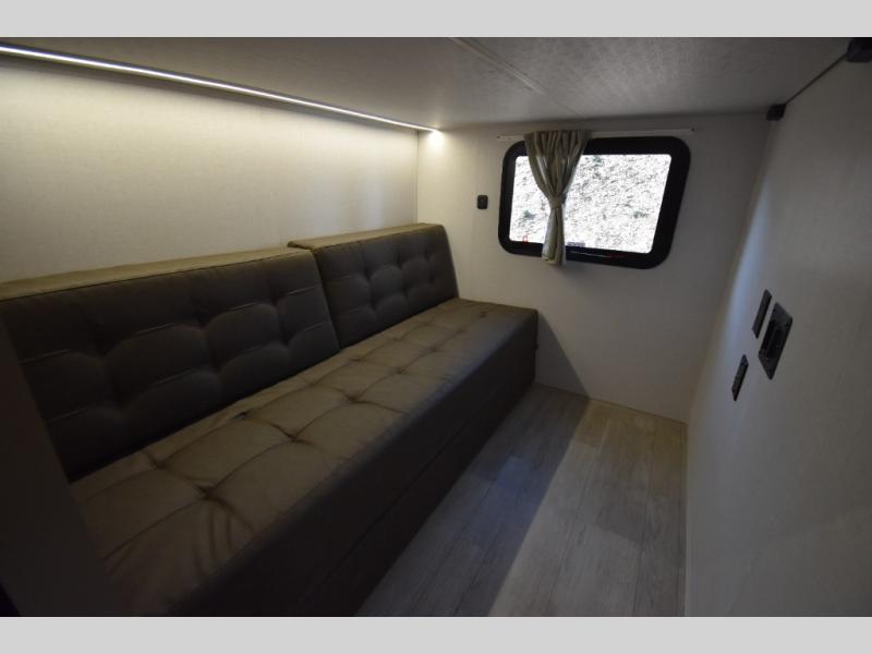 Everyone will enjoy having their own space in this travel trailer thanks to the front master bedroom and the rear bunkhouse. The bunkhouse includes a wall to separate the Versa bunk and fold-down desk on one side and a Versa sofa on the other, perfect for older kids or guests. You'll have the custom king bed with Versa Tilt all to yourselves, and the walk-thru bath will be easily accessible for everyone. In the combined kitchen and living room, a jackknife sofa slide sits across from the fireplace/entertainment center, and there is a pull-out table here so you can dine together.