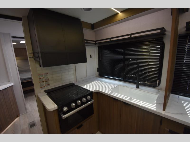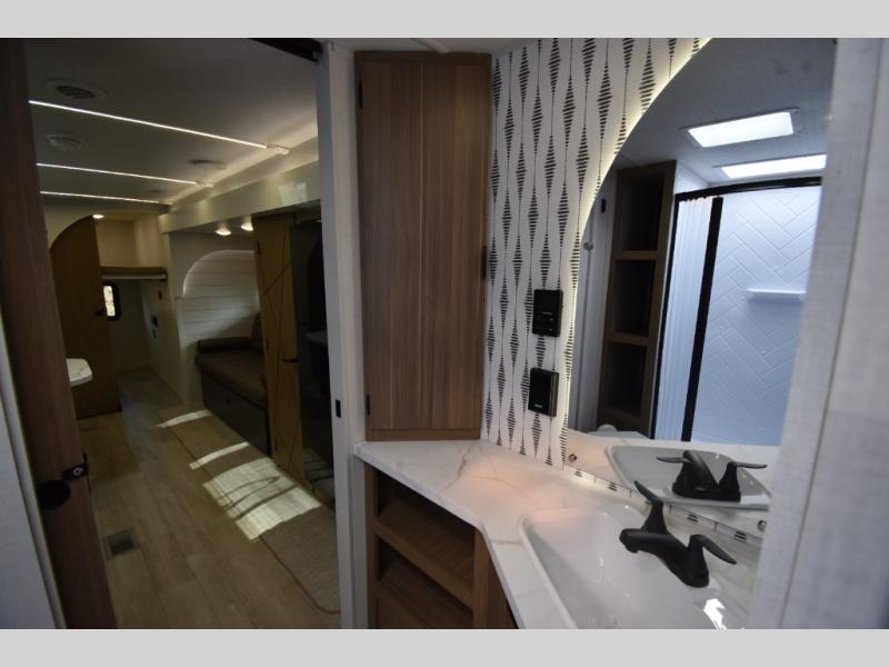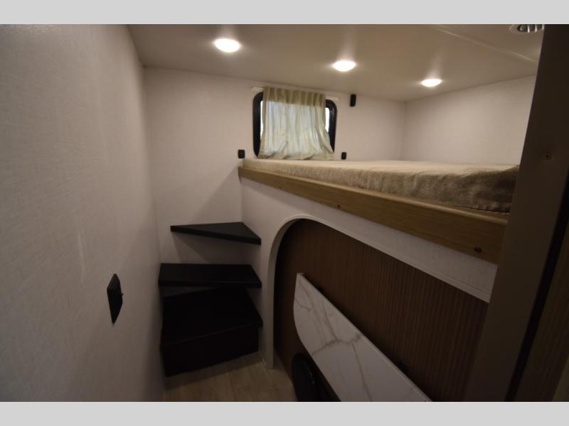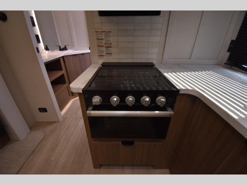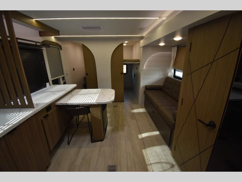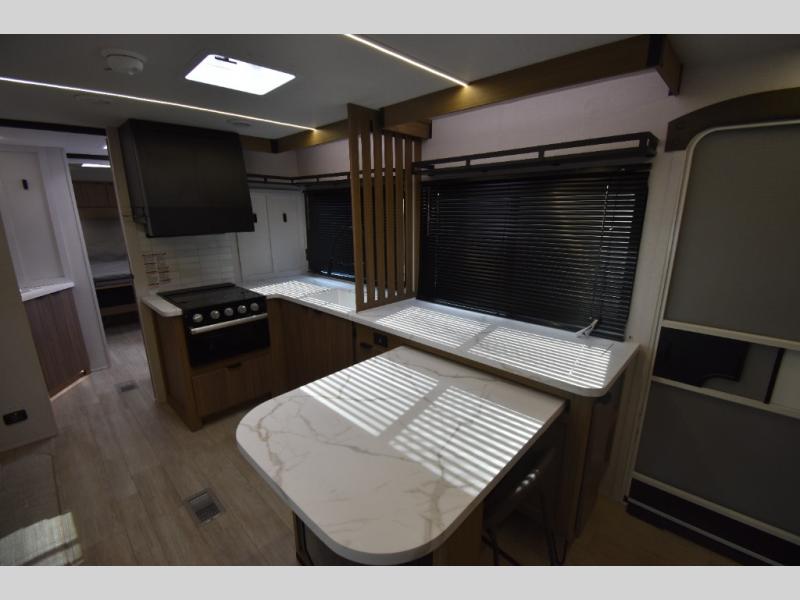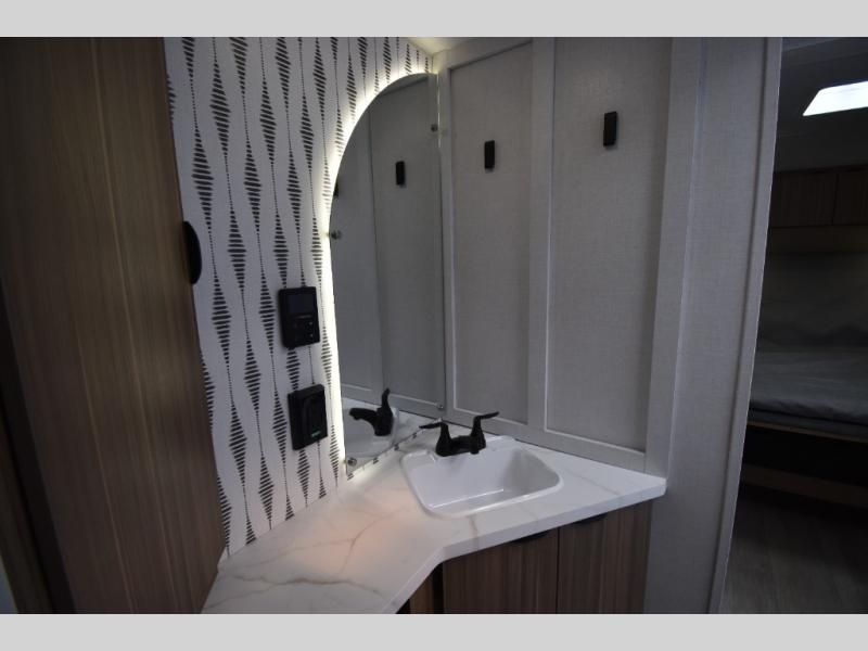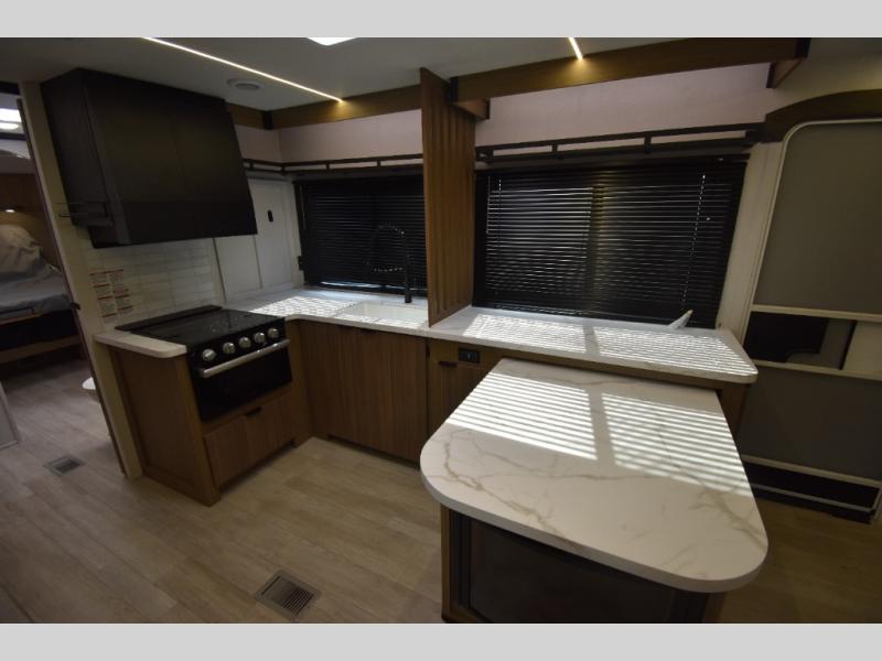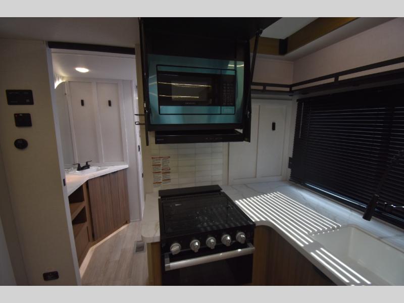 Everyone will enjoy having their own space in this travel trailer thanks to the front master bedroom and the rear bunkhouse. The bunkhouse includes a wall to separate the Versa bunk and fold-down desk on one side and a Versa sofa on the other, perfect for older kids or guests. You'll have the custom king bed with Versa Tilt all to yourselves, and the walk-thru bath will be easily accessible for everyone. In the combined kitchen and living room, a jackknife sofa slide sits across from the fireplace/entertainment center, and there is a pull-out table here so you can dine together.