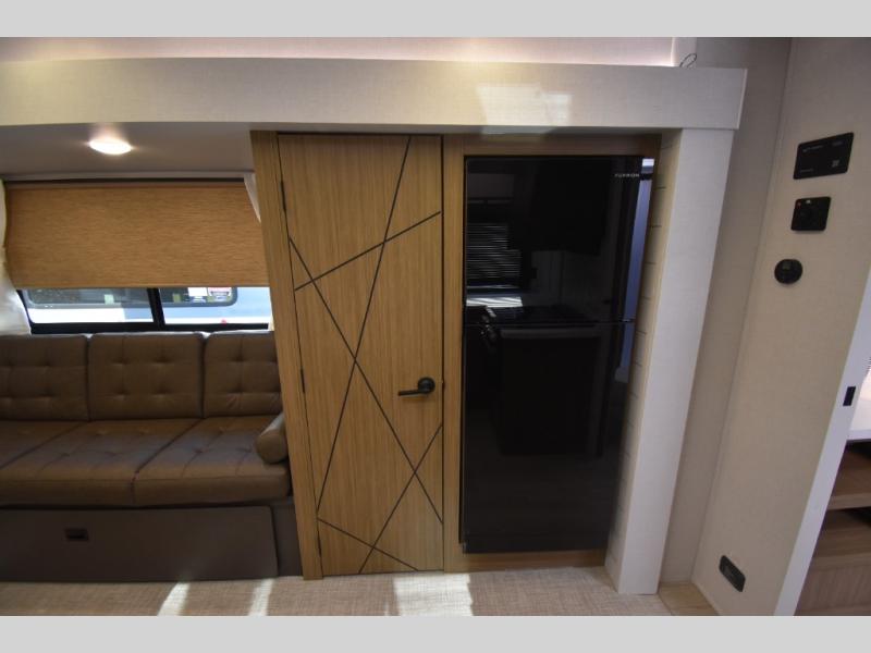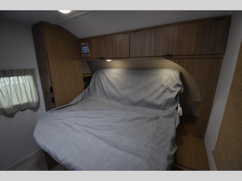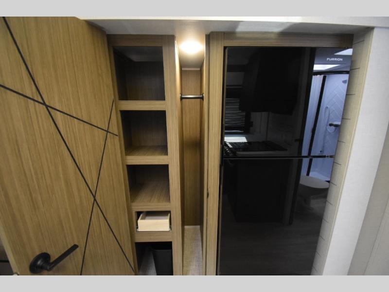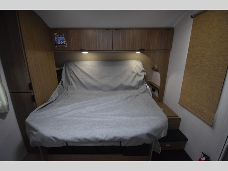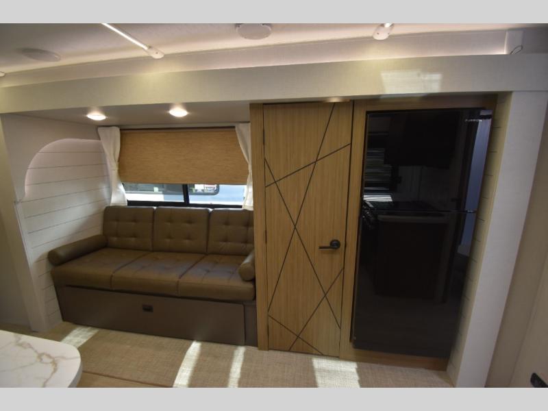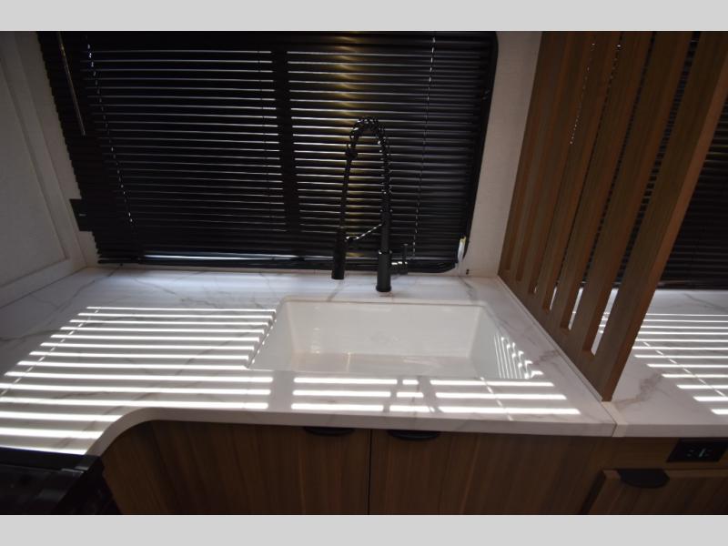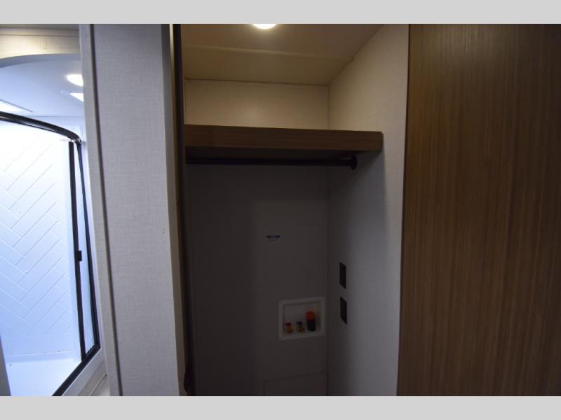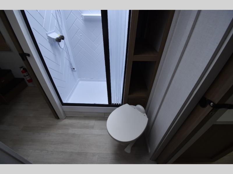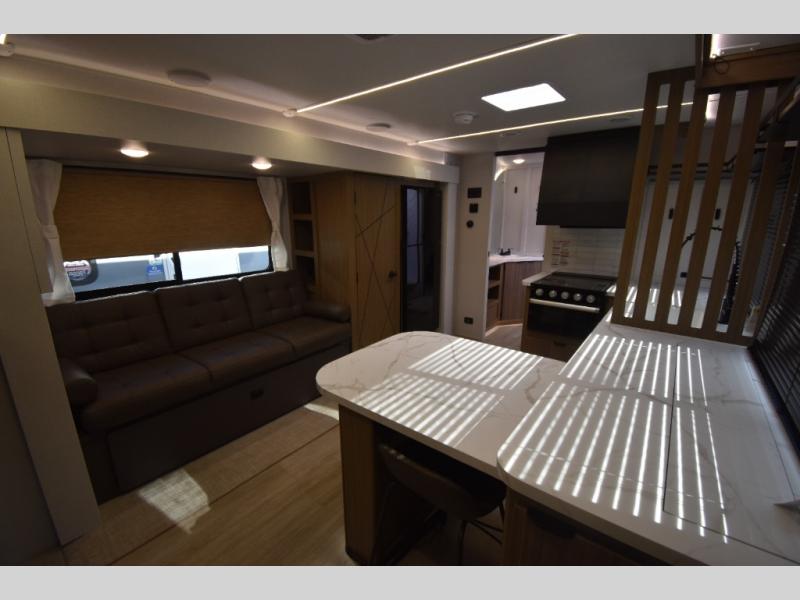 Everyone will enjoy having their own space in this travel trailer thanks to the front master bedroom and the rear bunkhouse. The bunkhouse includes a wall to separate the Versa bunk and fold-down desk on one side and a Versa sofa on the other, perfect for older kids or guests. You'll have the custom king bed with Versa Tilt all to yourselves, and the walk-thru bath will be easily accessible for everyone. In the combined kitchen and living room, a jackknife sofa slide sits across from the fireplace/entertainment center, and there is a pull-out table here so you can dine together.