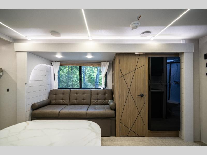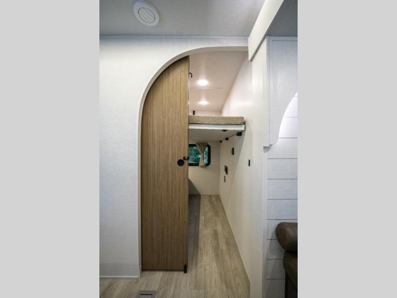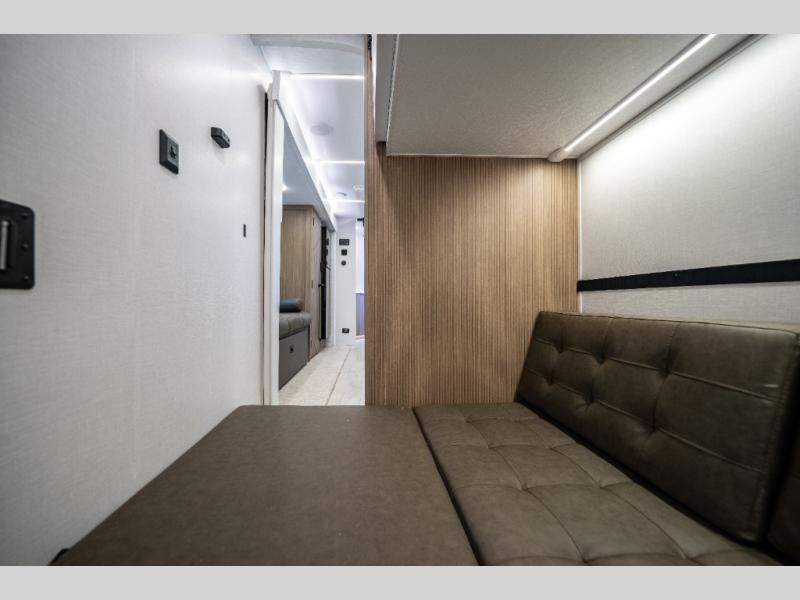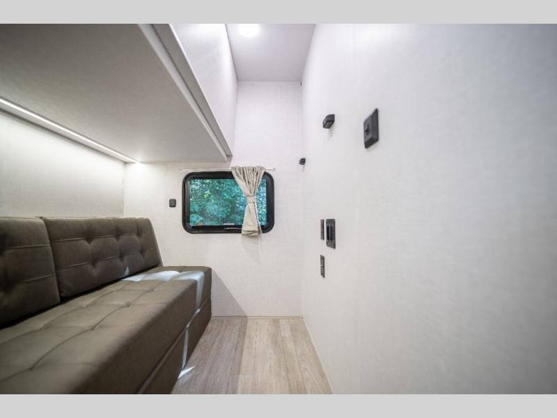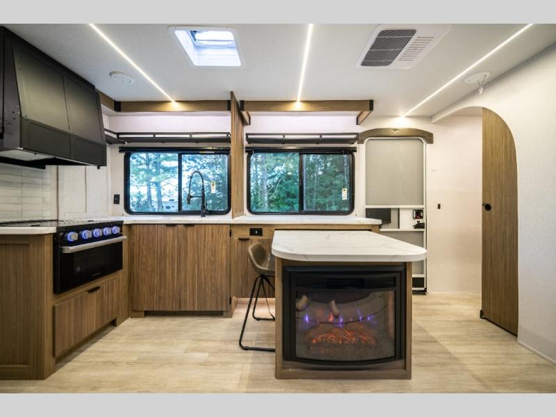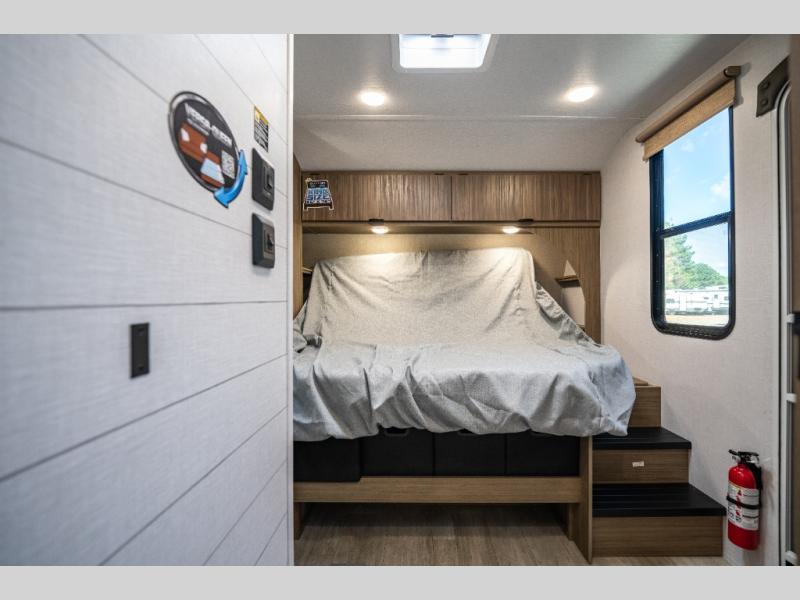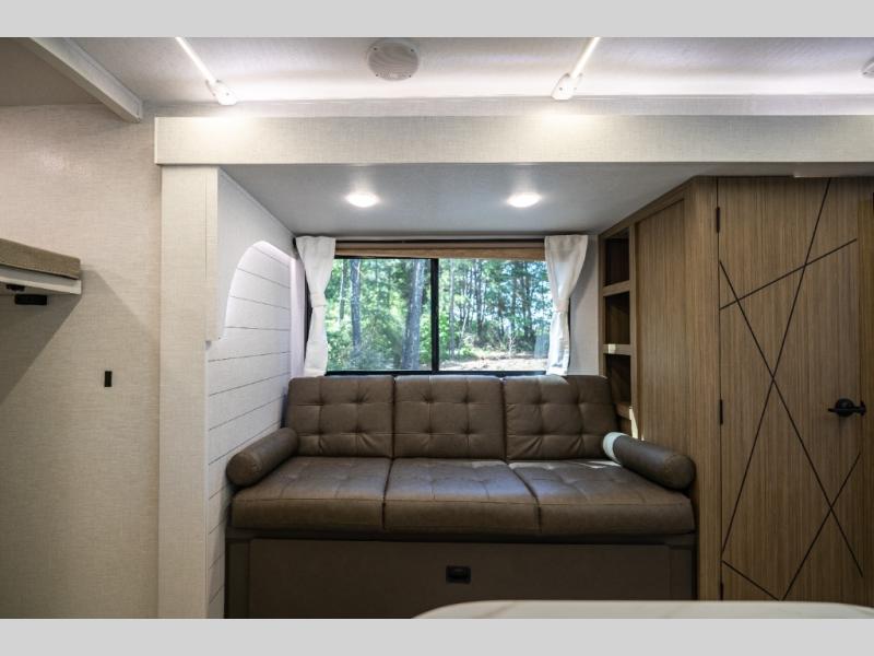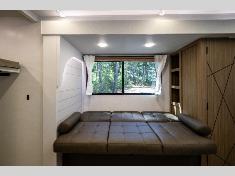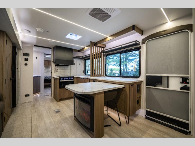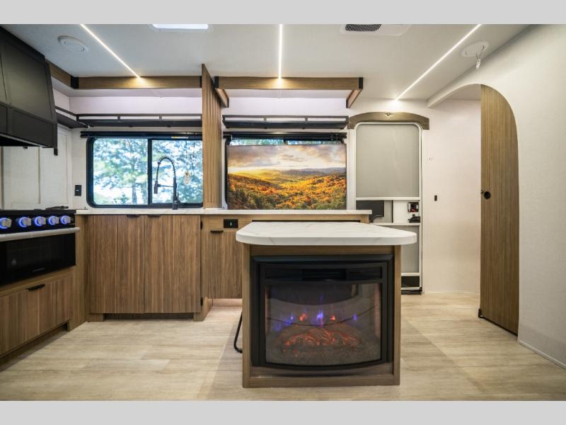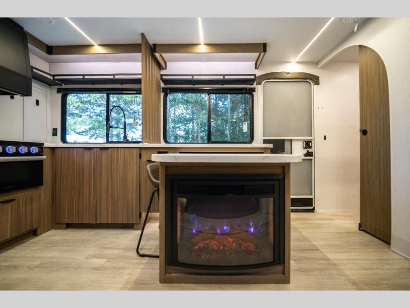 Everyone will enjoy having their own space in this travel trailer thanks to the front master bedroom and the rear bunkhouse. The bunkhouse includes a wall to separate the Versa bunk and fold-down desk on one side and a Versa sofa on the other, perfect for older kids or guests. You'll have the custom king bed with Versa Tilt all to yourselves, and the walk-thru bath will be easily accessible for everyone. In the combined kitchen and living room, a jackknife sofa slide sits across from the fireplace/entertainment center, and there is a pull-out table here so you can dine together.