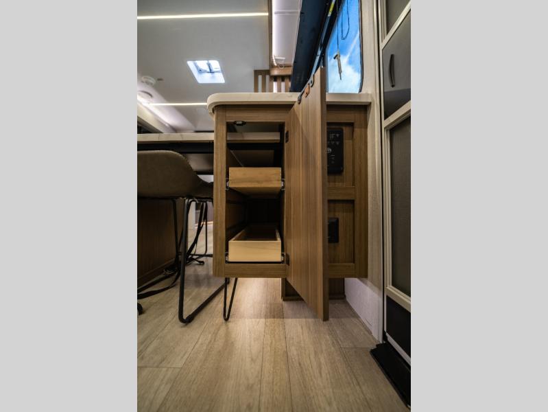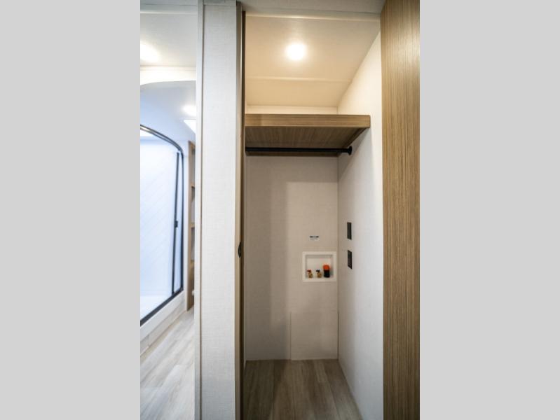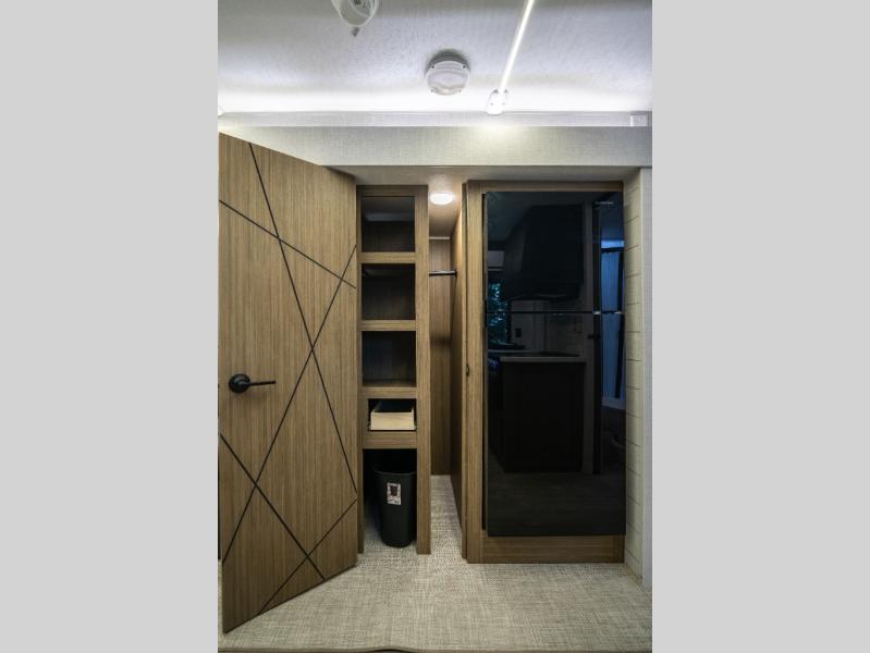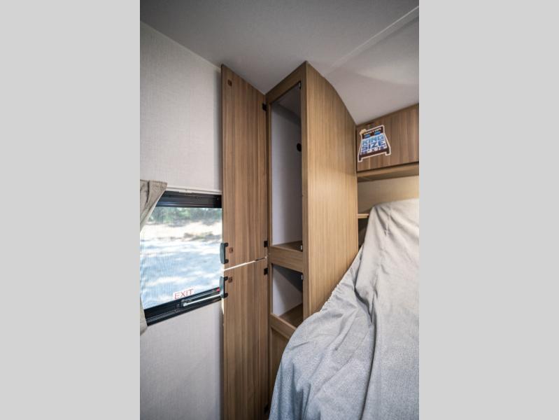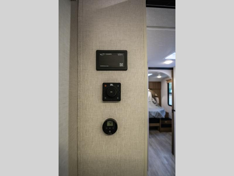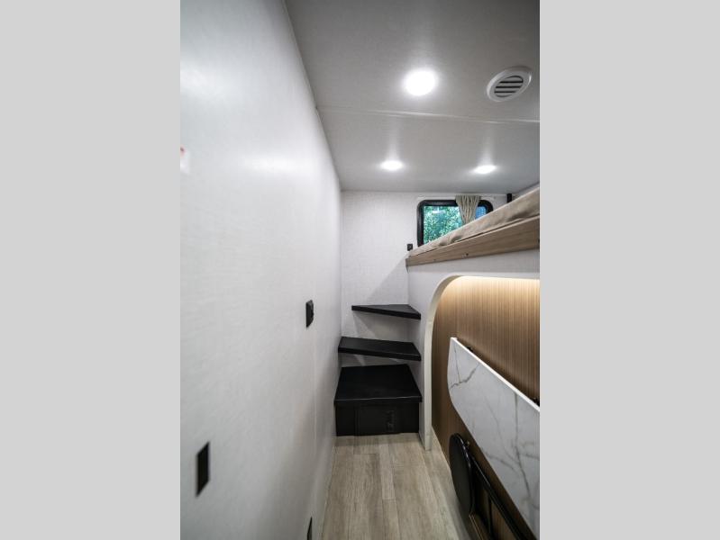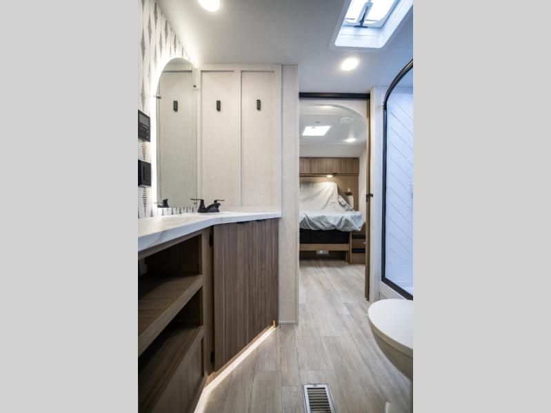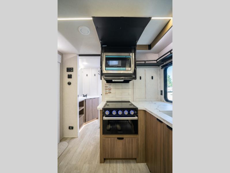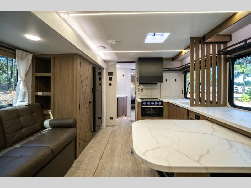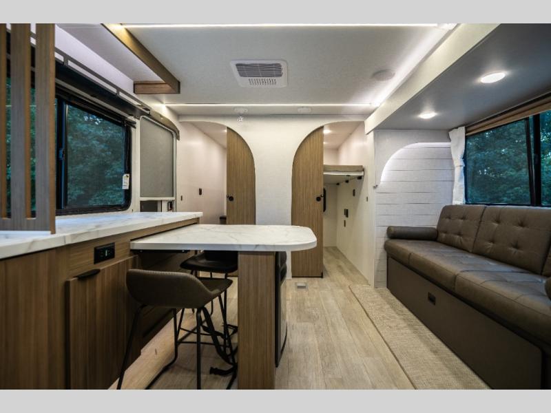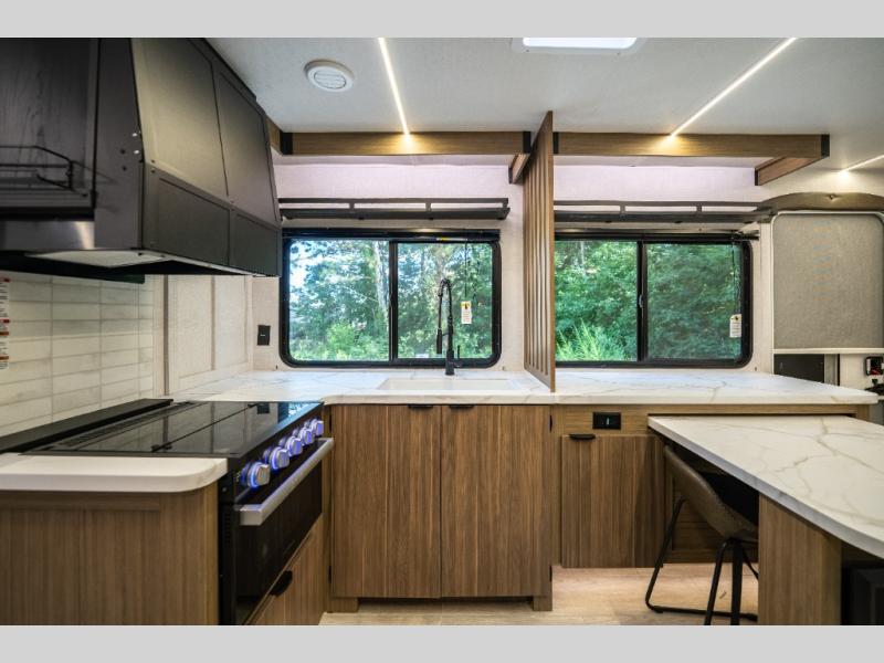 Everyone will enjoy having their own space in this travel trailer thanks to the front master bedroom and the rear bunkhouse. The bunkhouse includes a wall to separate the Versa bunk and fold-down desk on one side and a Versa sofa on the other, perfect for older kids or guests. You'll have the custom king bed with Versa Tilt all to yourselves, and the walk-thru bath will be easily accessible for everyone. In the combined kitchen and living room, a jackknife sofa slide sits across from the fireplace/entertainment center, and there is a pull-out table here so you can dine together.