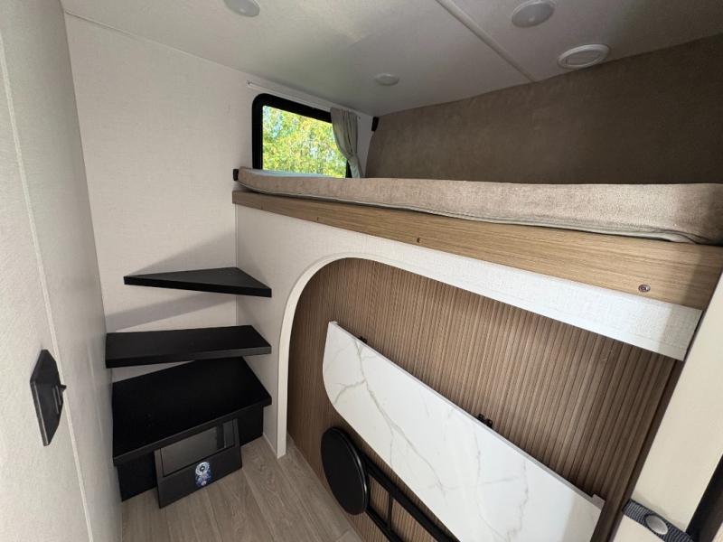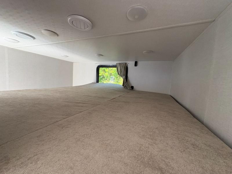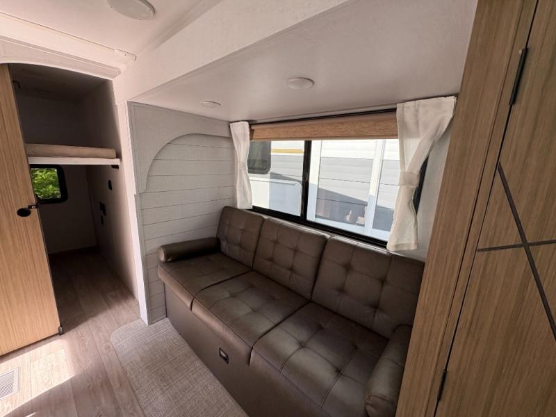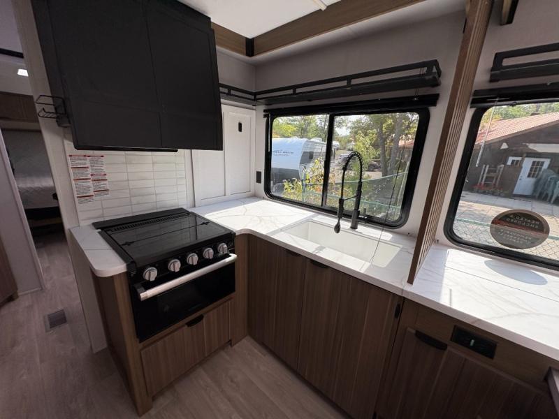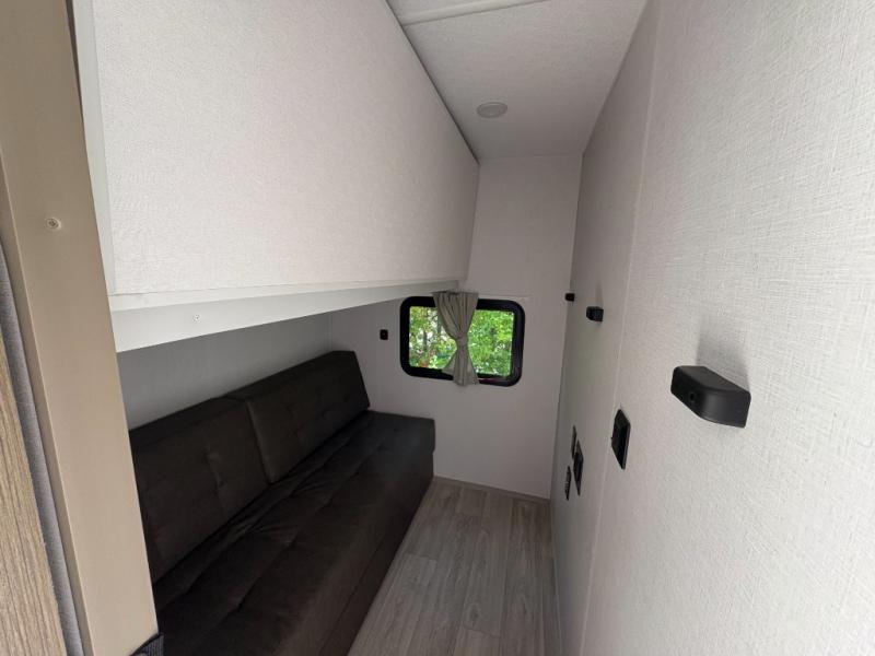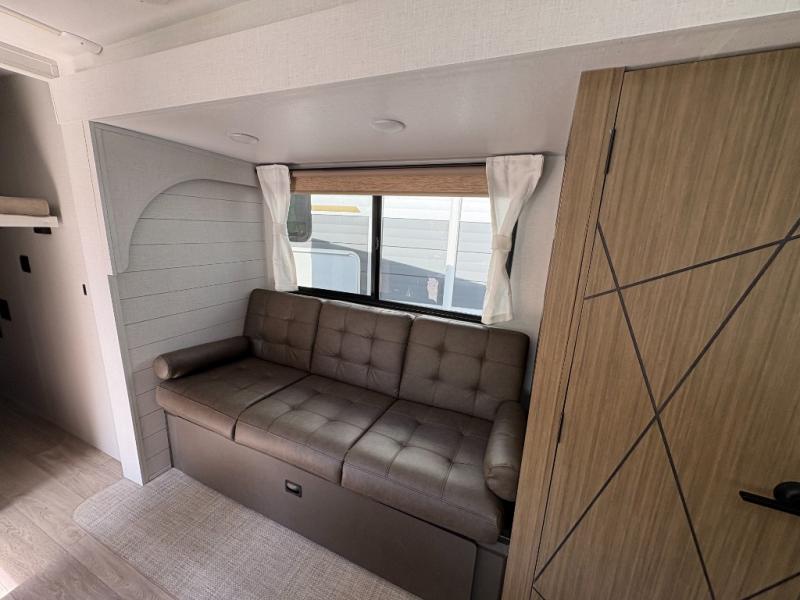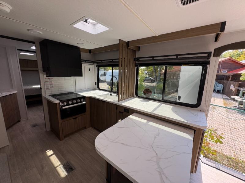 Everyone will enjoy having their own space in this travel trailer thanks to the front master bedroom and the rear bunkhouse. The bunkhouse includes a wall to separate the Versa bunk and fold-down desk on one side and a Versa sofa on the other, perfect for older kids or guests. You'll have the custom king bed with Versa Tilt all to yourselves, and the walk-thru bath will be easily accessible for everyone. In the combined kitchen and living room, a jackknife sofa slide sits across from the fireplace/entertainment center, and there is a pull-out table here so you can dine together.