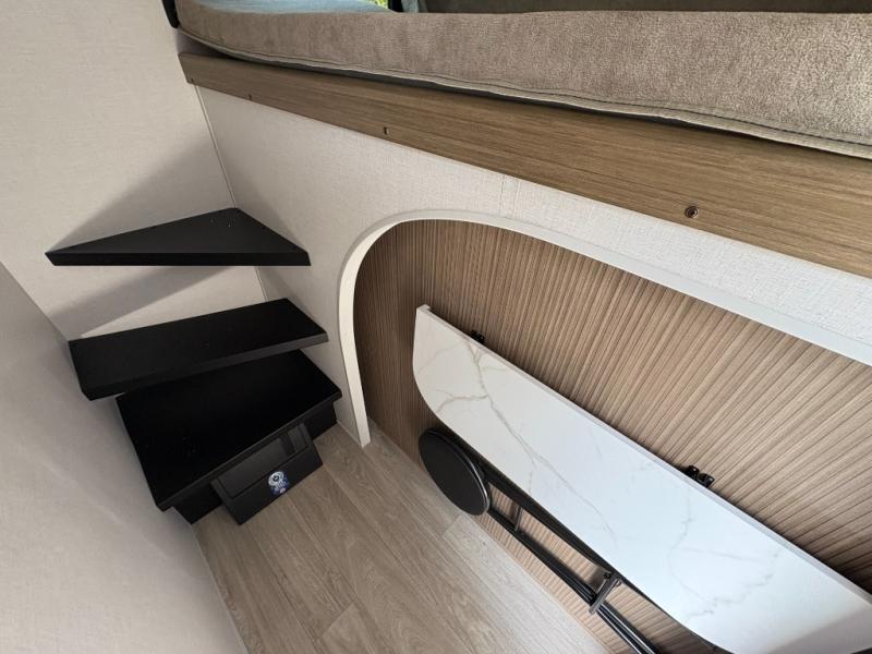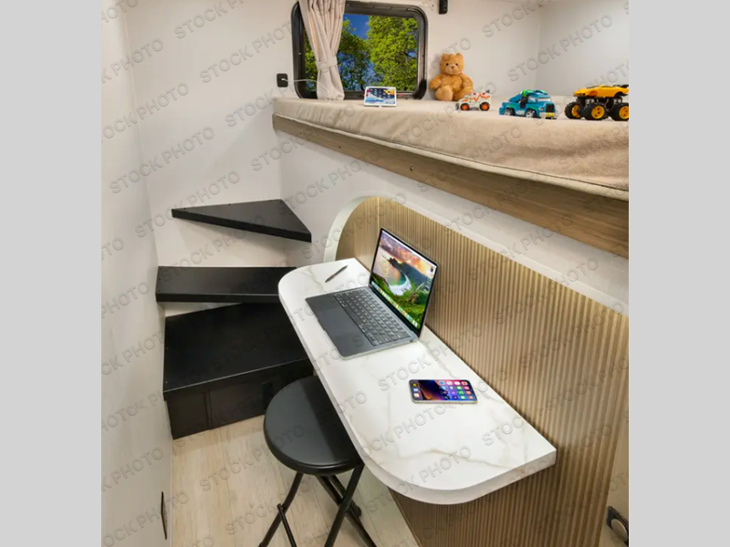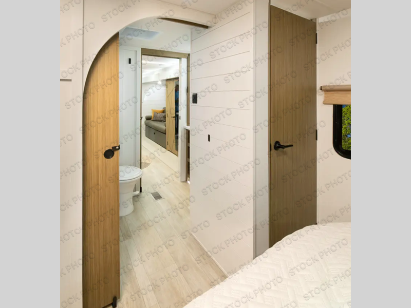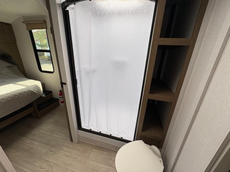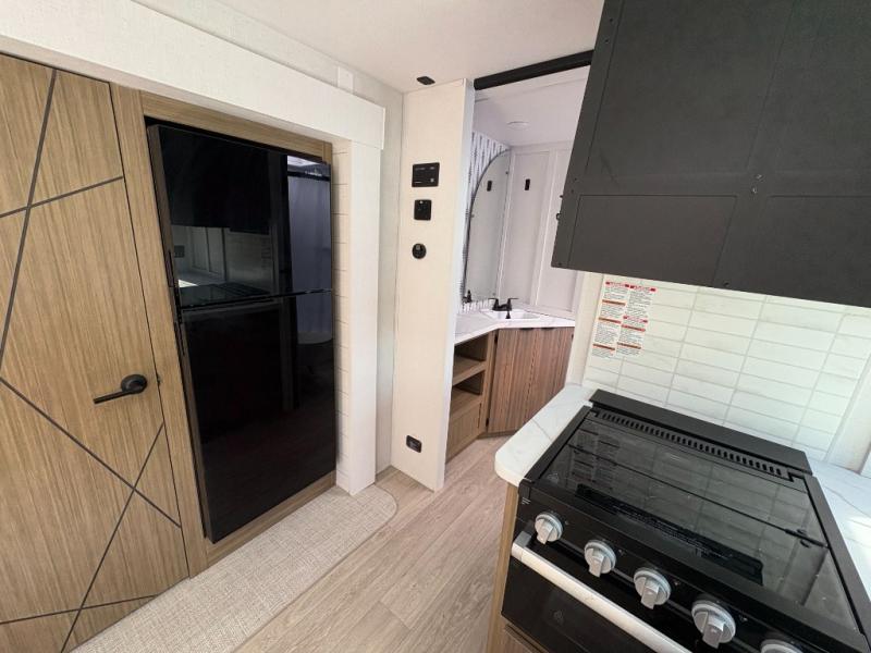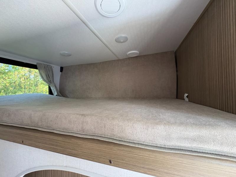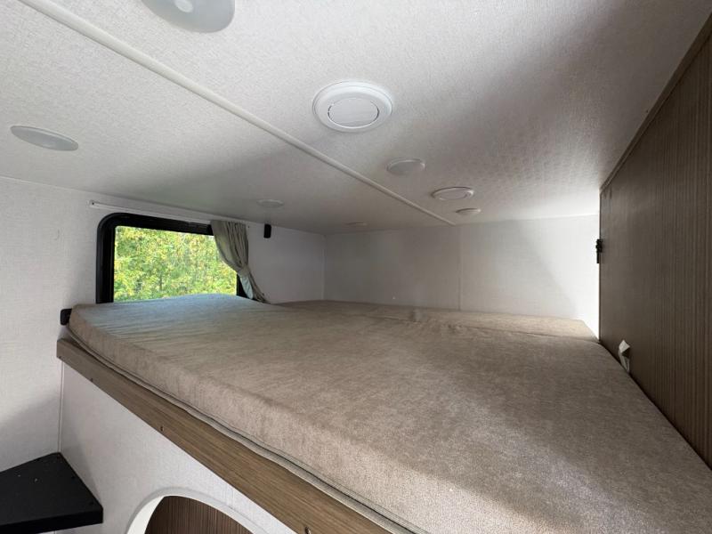 Everyone will enjoy having their own space in this travel trailer thanks to the front master bedroom and the rear bunkhouse. The bunkhouse includes a wall to separate the Versa bunk and fold-down desk on one side and a Versa sofa on the other, perfect for older kids or guests. You'll have the custom king bed with Versa Tilt all to yourselves, and the walk-thru bath will be easily accessible for everyone. In the combined kitchen and living room, a jackknife sofa slide sits across from the fireplace/entertainment center, and there is a pull-out table here so you can dine together.