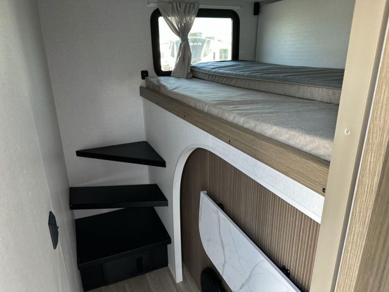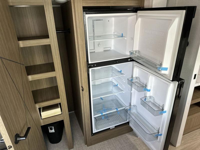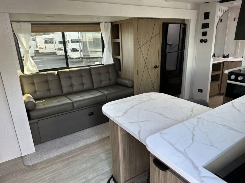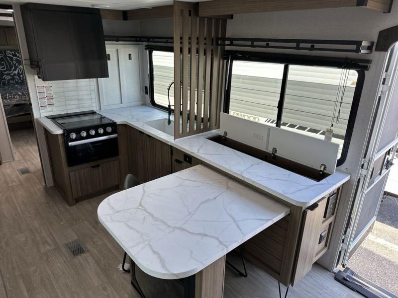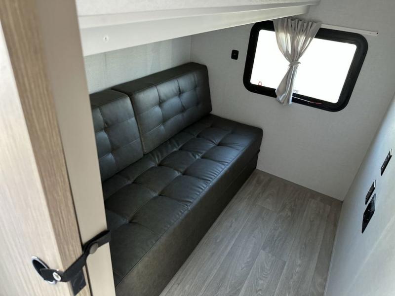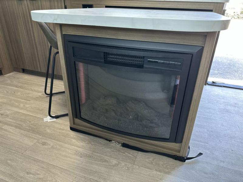 Everyone will enjoy having their own space in this travel trailer thanks to the front master bedroom and the rear bunkhouse. The bunkhouse includes a wall to separate the Versa bunk and fold-down desk on one side and a Versa sofa on the other, perfect for older kids or guests. You'll have the custom king bed with Versa Tilt all to yourselves, and the walk-thru bath will be easily accessible for everyone. In the combined kitchen and living room, a jackknife sofa slide sits across from the fireplace/entertainment center, and there is a pull-out table here so you can dine together.
