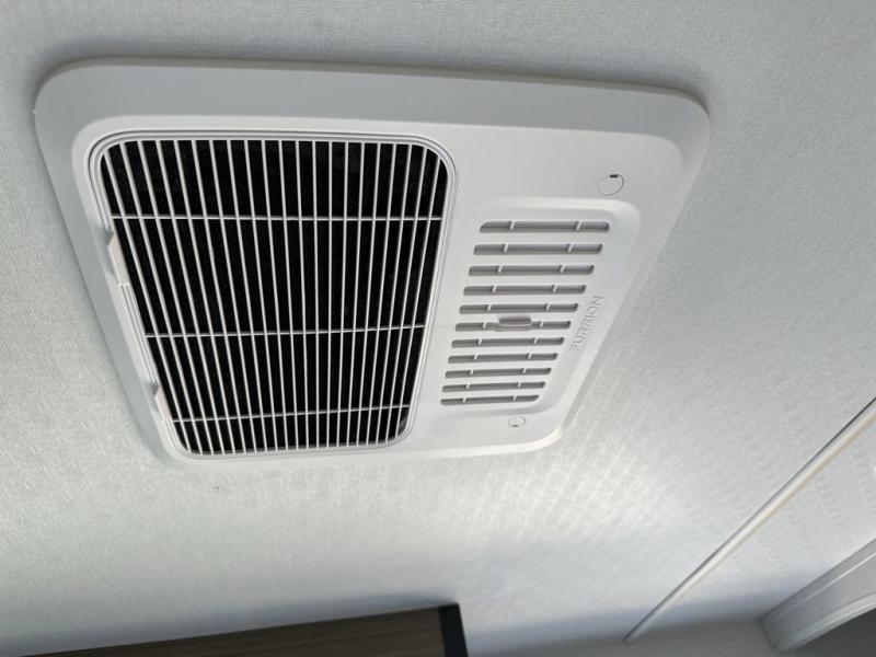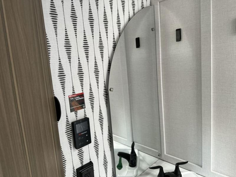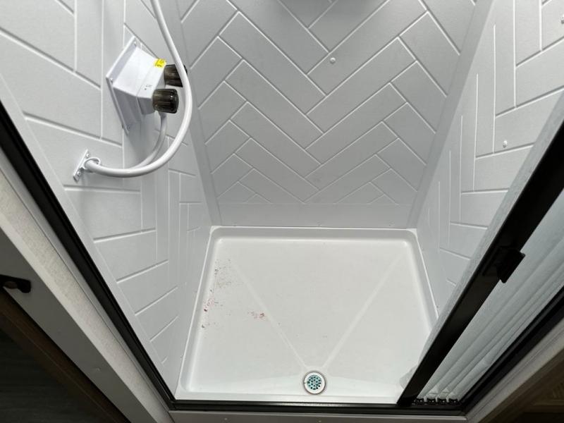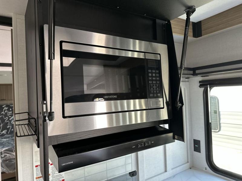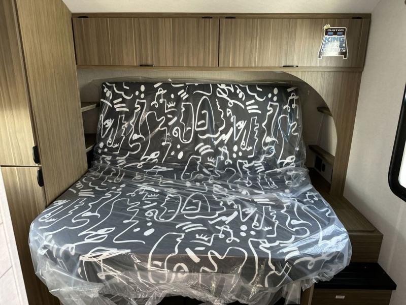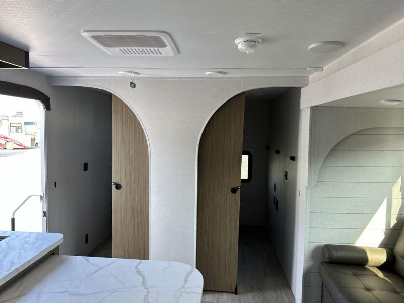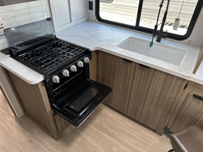 Everyone will enjoy having their own space in this travel trailer thanks to the front master bedroom and the rear bunkhouse. The bunkhouse includes a wall to separate the Versa bunk and fold-down desk on one side and a Versa sofa on the other, perfect for older kids or guests. You'll have the custom king bed with Versa Tilt all to yourselves, and the walk-thru bath will be easily accessible for everyone. In the combined kitchen and living room, a jackknife sofa slide sits across from the fireplace/entertainment center, and there is a pull-out table here so you can dine together.