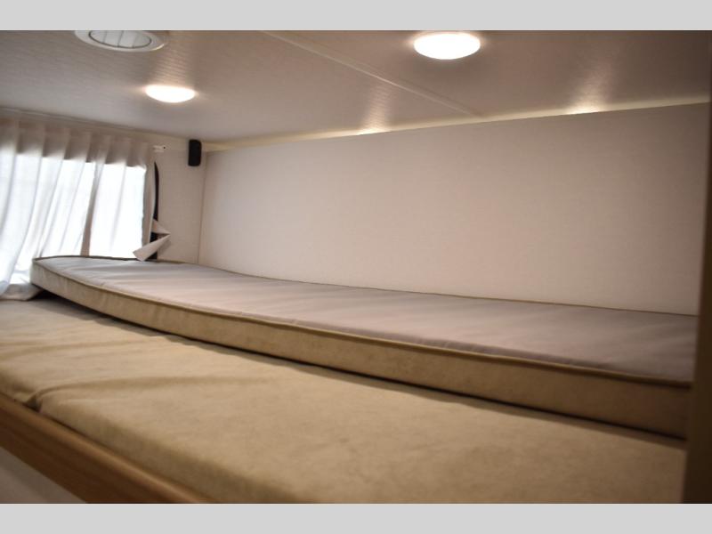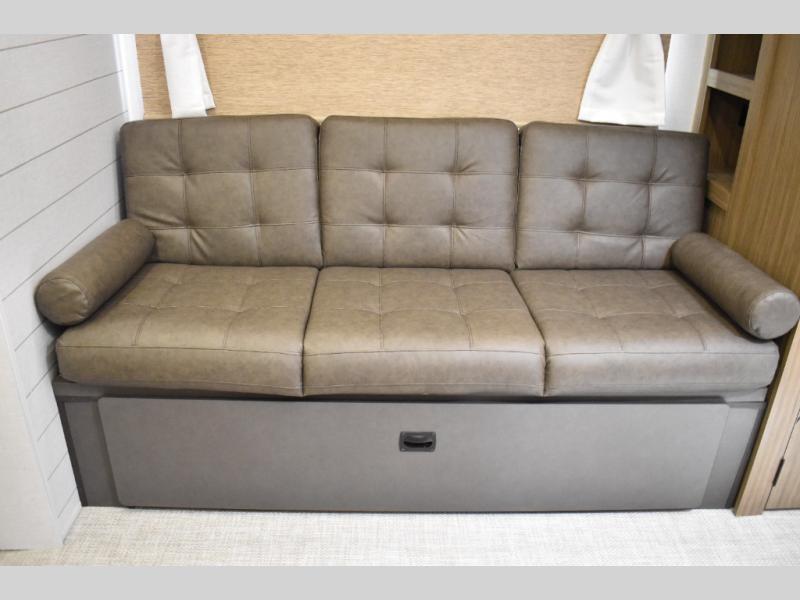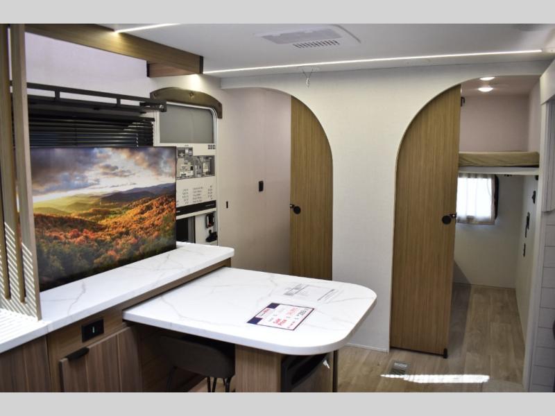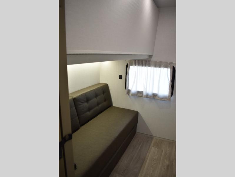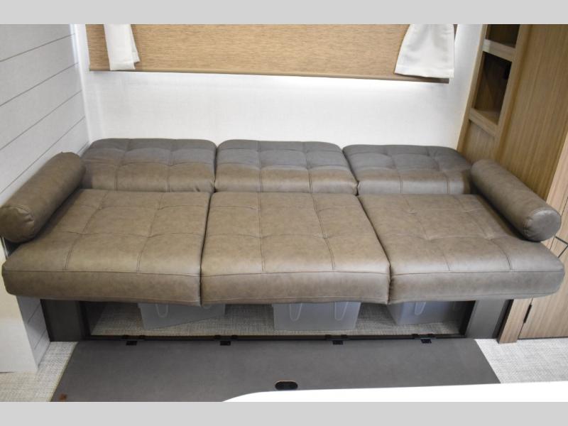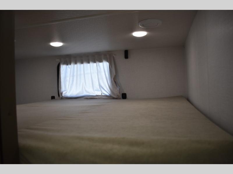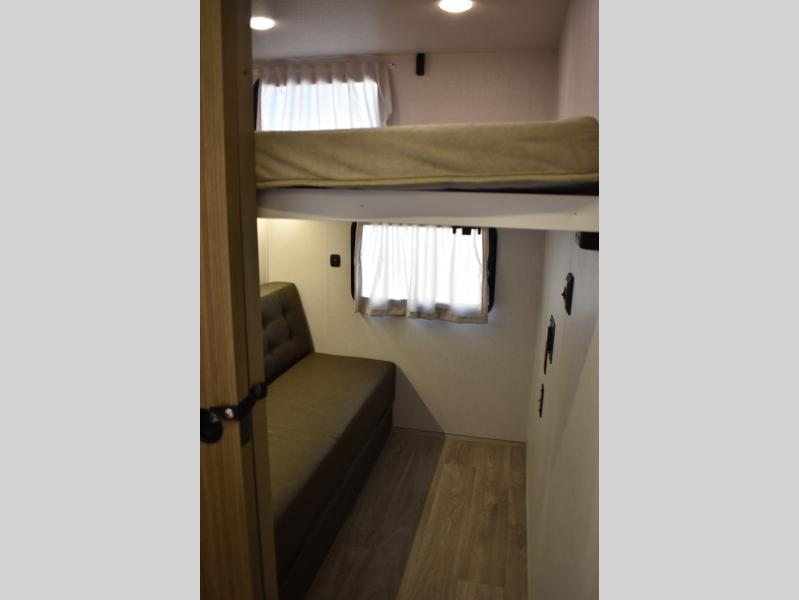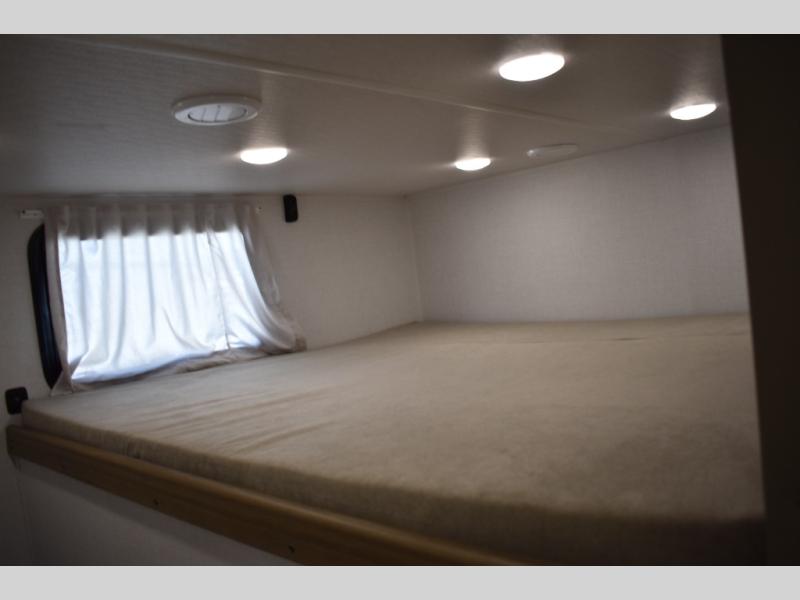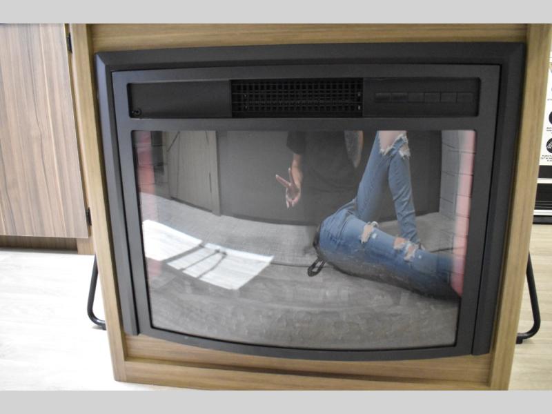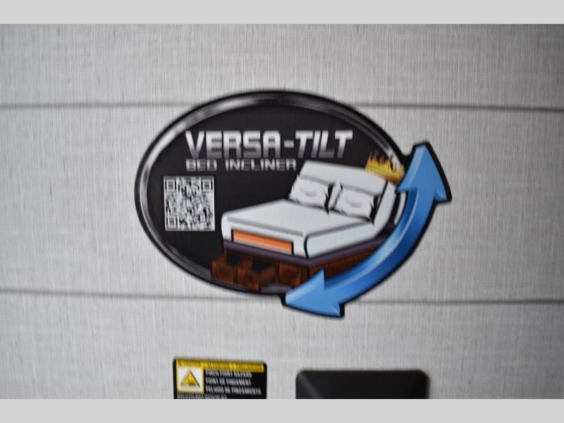 Everyone will enjoy having their own space in this travel trailer thanks to the front master bedroom and the rear bunkhouse. The bunkhouse includes a wall to separate the Versa bunk and fold-down desk on one side and a Versa sofa on the other, perfect for older kids or guests. You'll have the custom king bed with Versa Tilt all to yourselves, and the walk-thru bath will be easily accessible for everyone. In the combined kitchen and living room, a jackknife sofa slide sits across from the fireplace/entertainment center, and there is a pull-out table here so you can dine together.