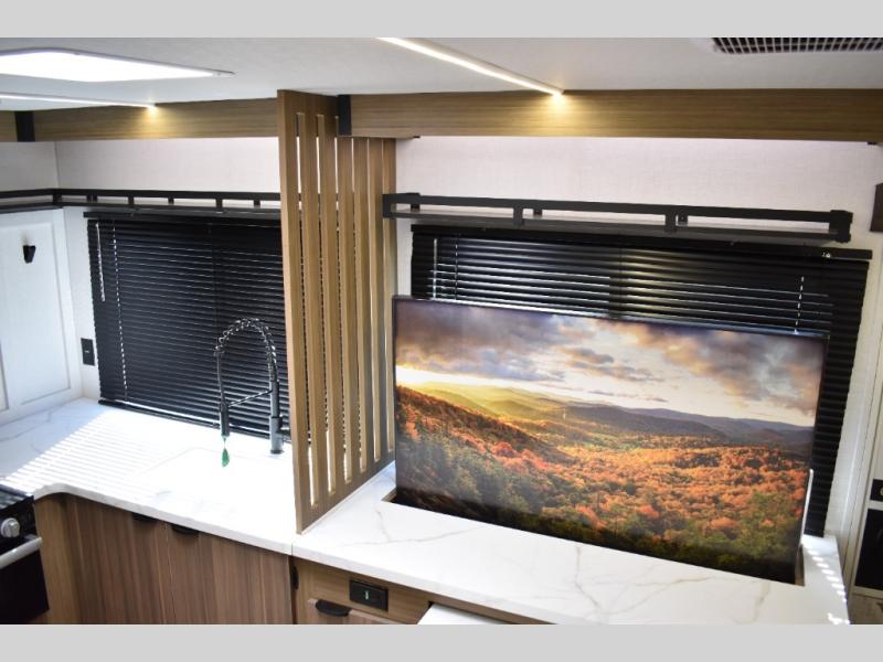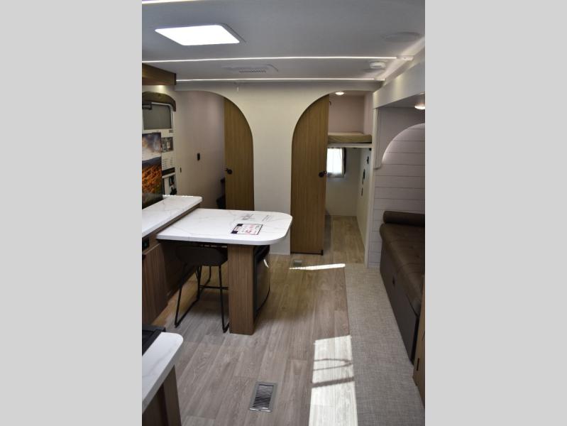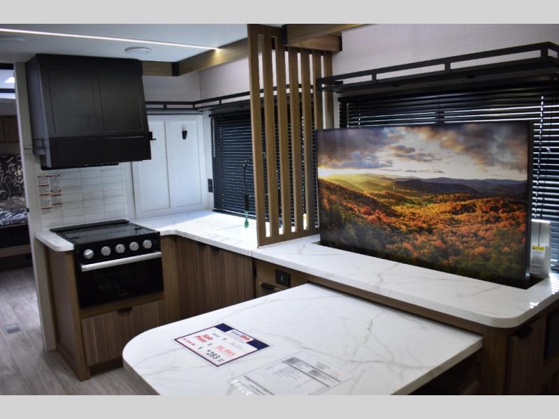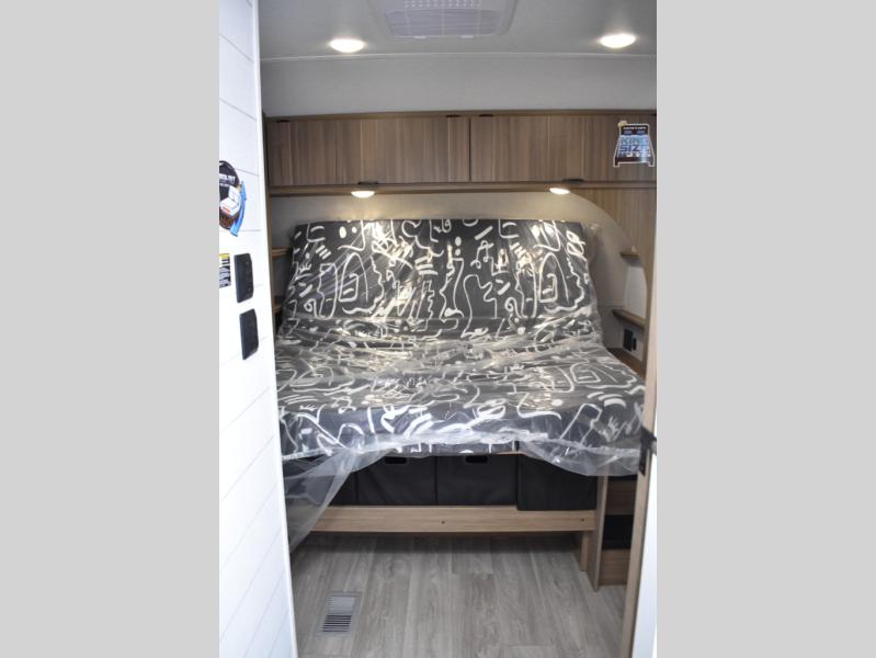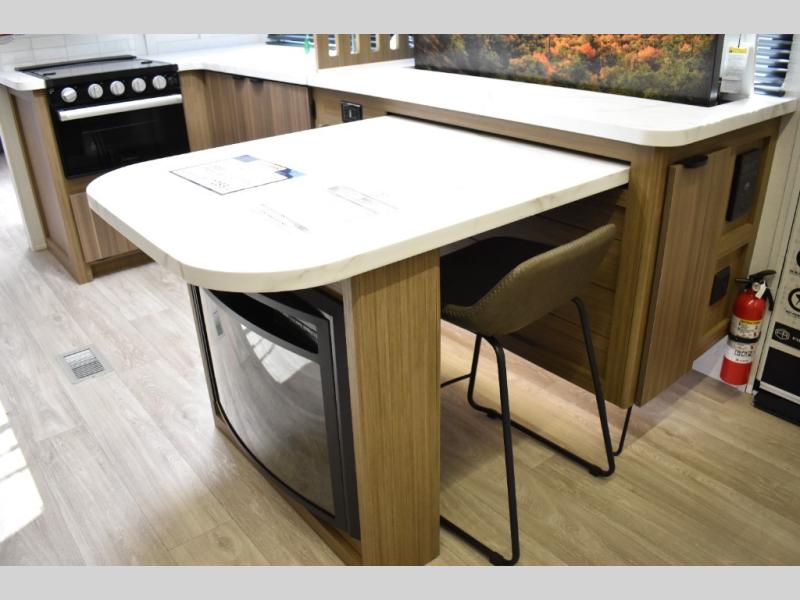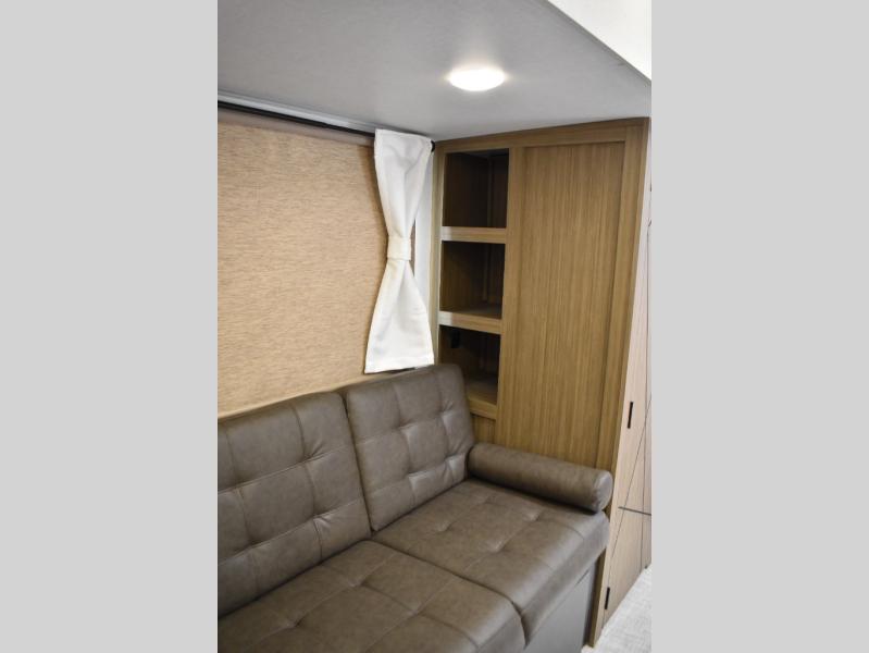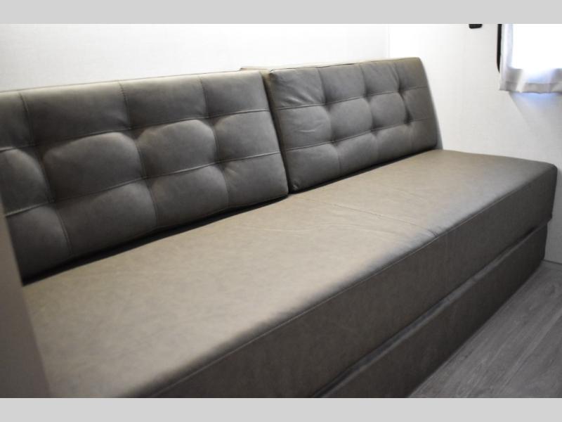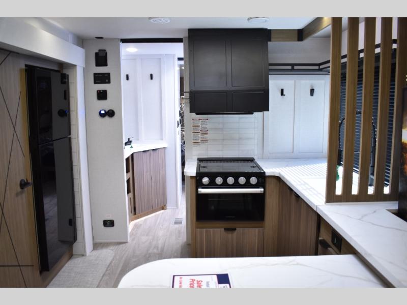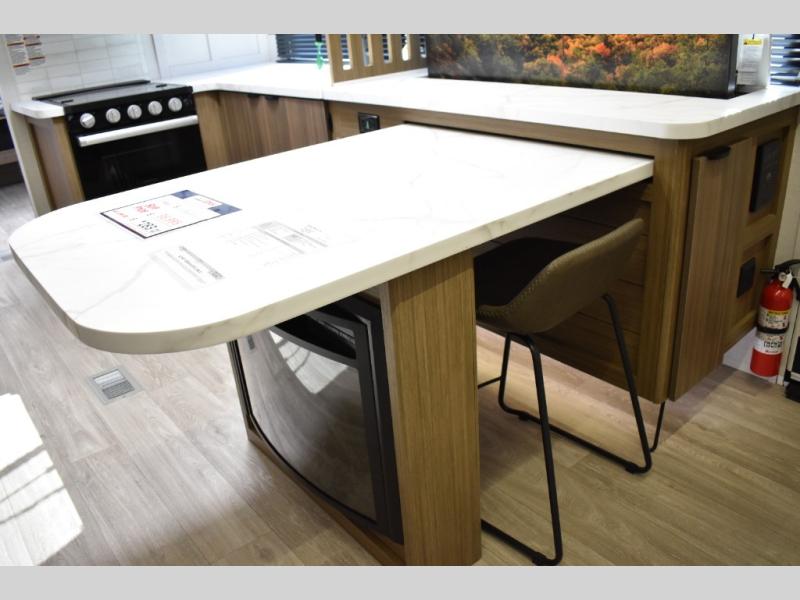Everyone will enjoy having their own space in this travel trailer thanks to the front master bedroom and the rear bunkhouse. The bunkhouse includes a wall to separate the Versa bunk and fold-down desk on one side and a Versa sofa on the other, perfect for older kids or guests. You'll have the custom king bed with Versa Tilt all to yourselves, and the walk-thru bath will be easily accessible for everyone. In the combined kitchen and living room, a jackknife sofa slide sits across from the fireplace/entertainment center, and there is a pull-out table here so you can dine together.