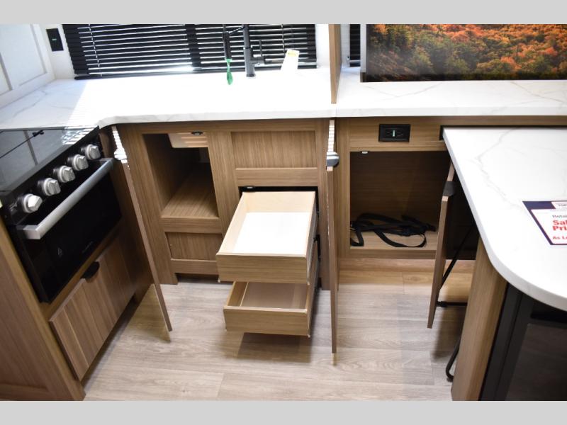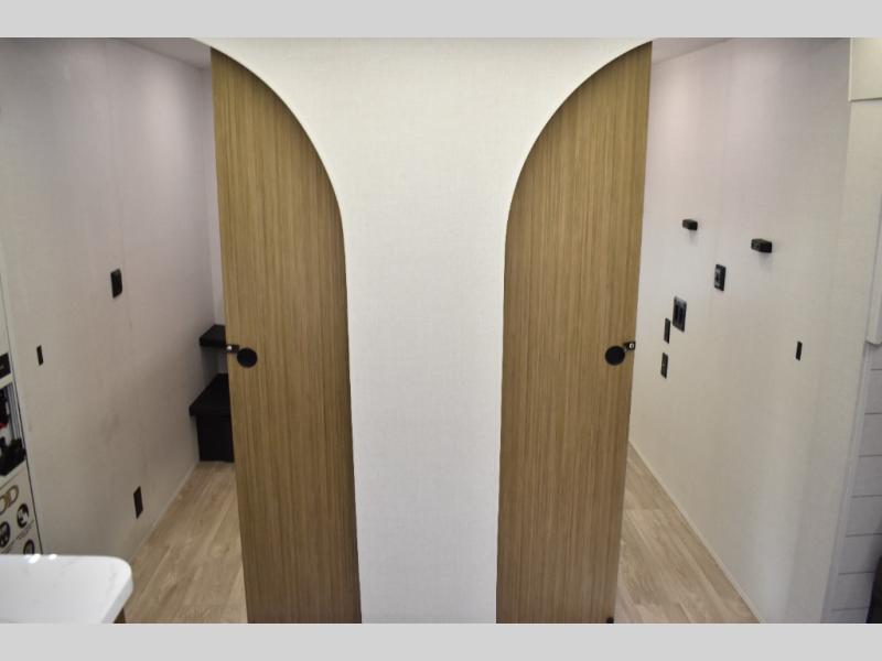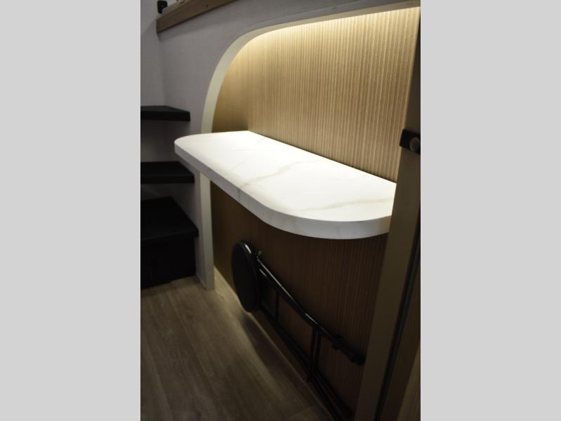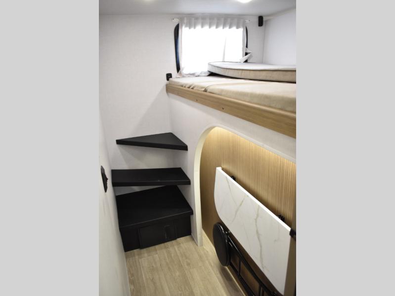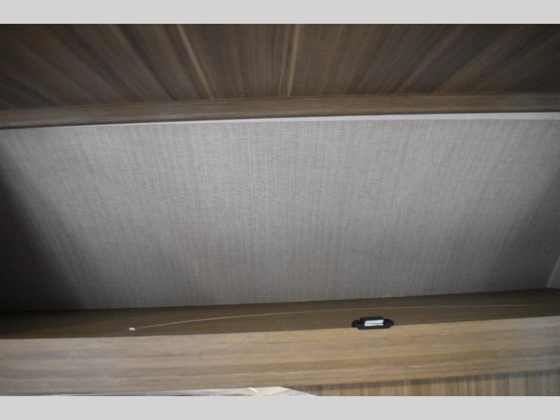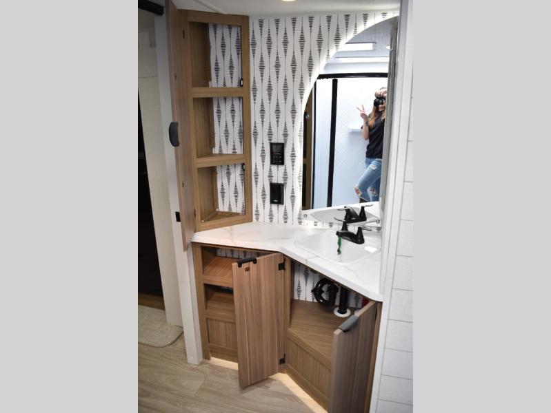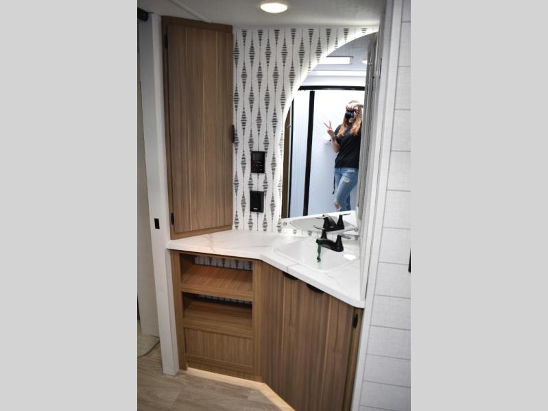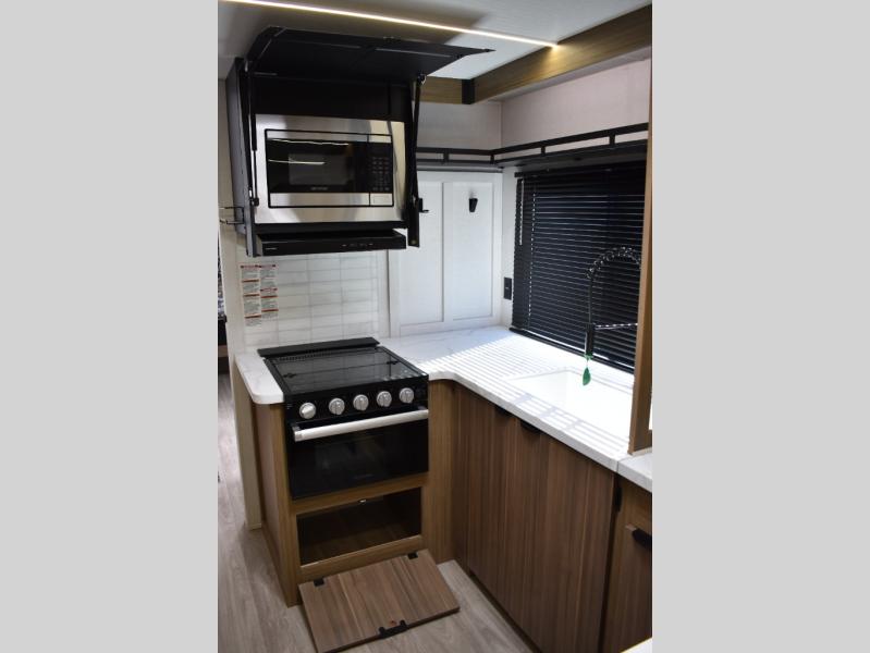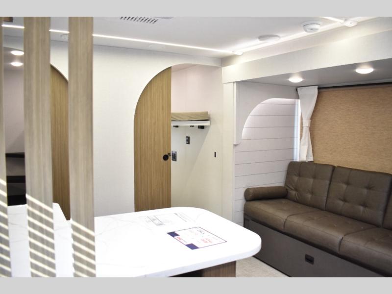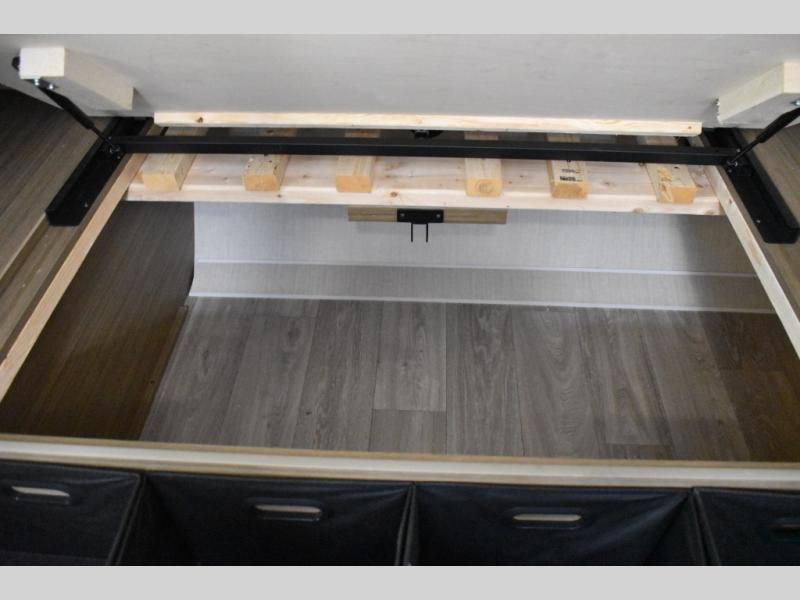 Everyone will enjoy having their own space in this travel trailer thanks to the front master bedroom and the rear bunkhouse. The bunkhouse includes a wall to separate the Versa bunk and fold-down desk on one side and a Versa sofa on the other, perfect for older kids or guests. You'll have the custom king bed with Versa Tilt all to yourselves, and the walk-thru bath will be easily accessible for everyone. In the combined kitchen and living room, a jackknife sofa slide sits across from the fireplace/entertainment center, and there is a pull-out table here so you can dine together.