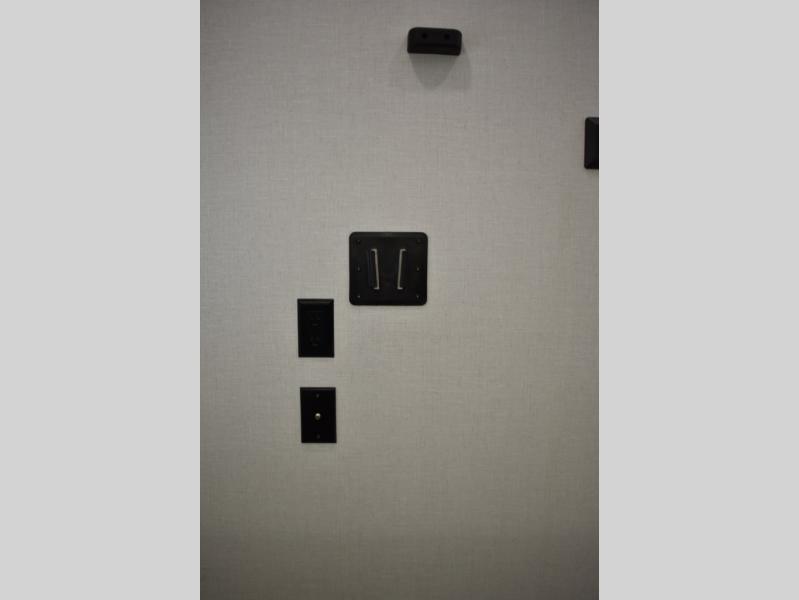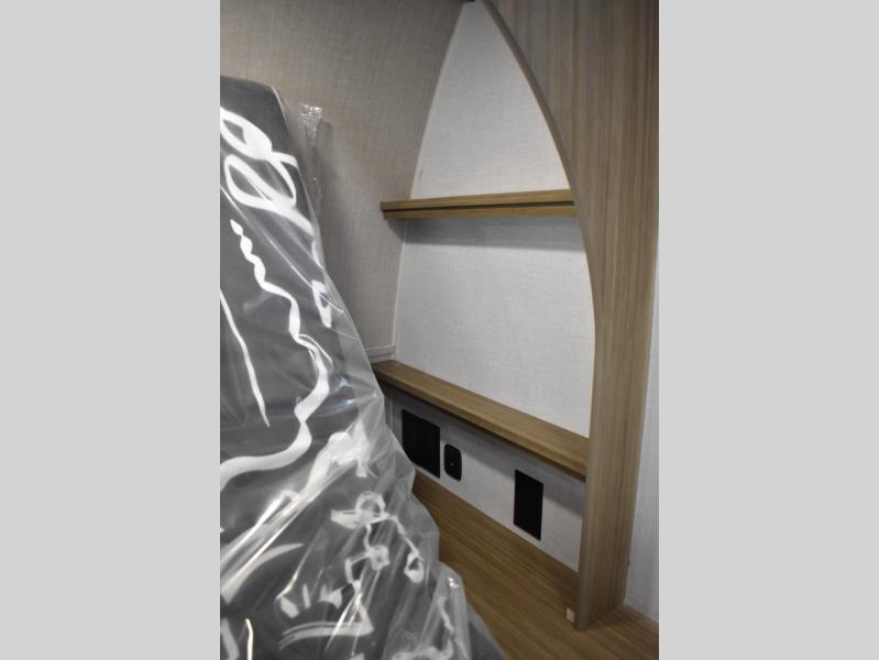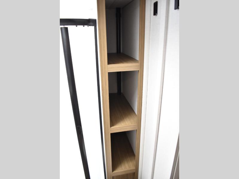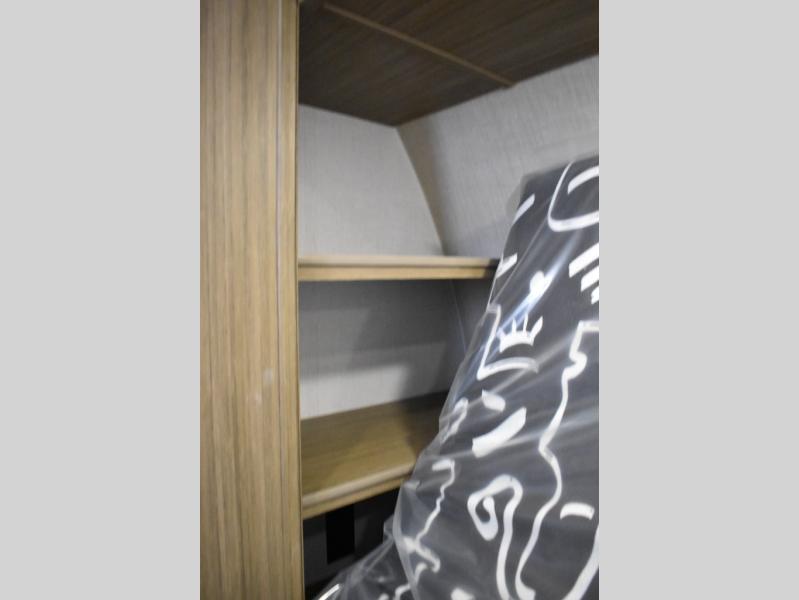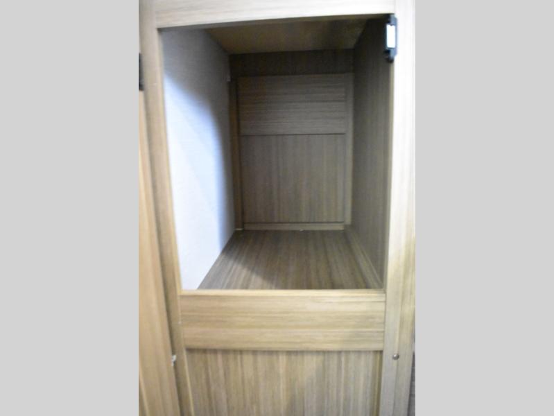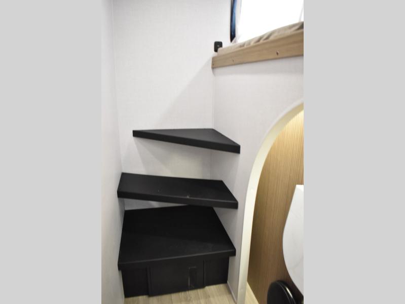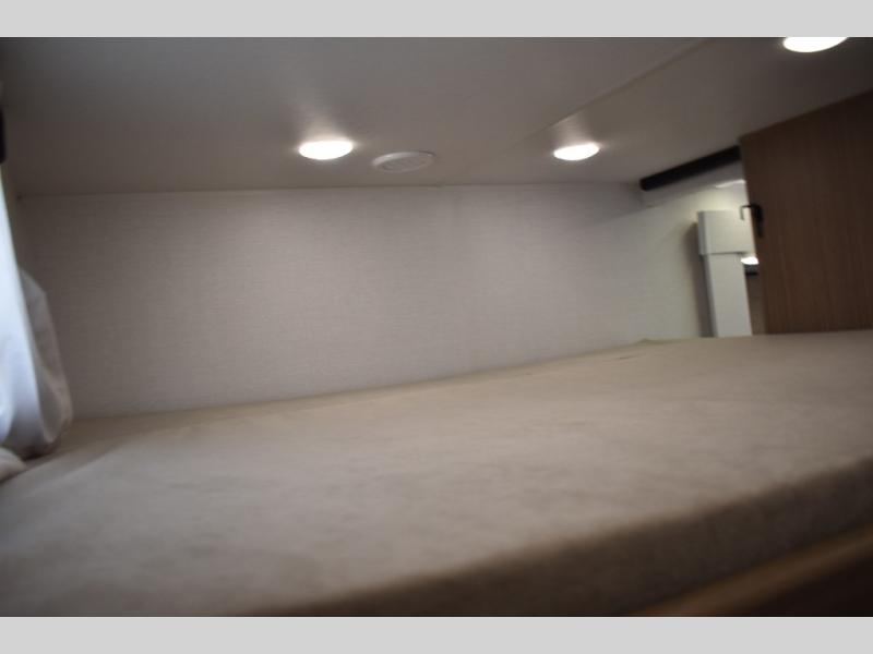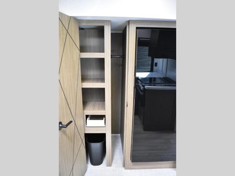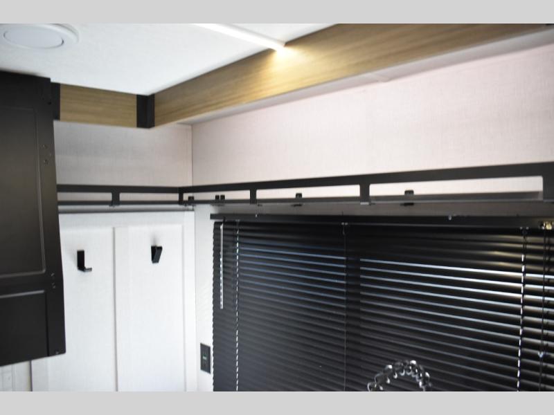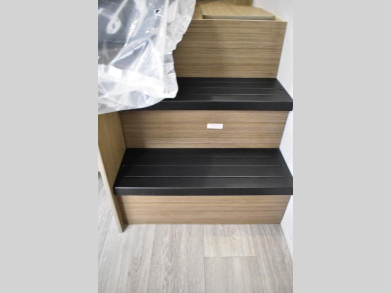 Everyone will enjoy having their own space in this travel trailer thanks to the front master bedroom and the rear bunkhouse. The bunkhouse includes a wall to separate the Versa bunk and fold-down desk on one side and a Versa sofa on the other, perfect for older kids or guests. You'll have the custom king bed with Versa Tilt all to yourselves, and the walk-thru bath will be easily accessible for everyone. In the combined kitchen and living room, a jackknife sofa slide sits across from the fireplace/entertainment center, and there is a pull-out table here so you can dine together.