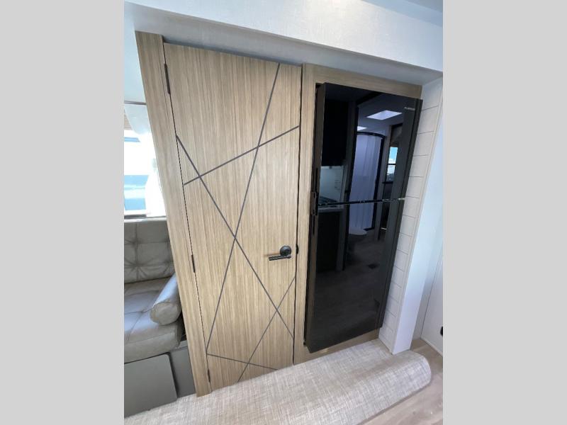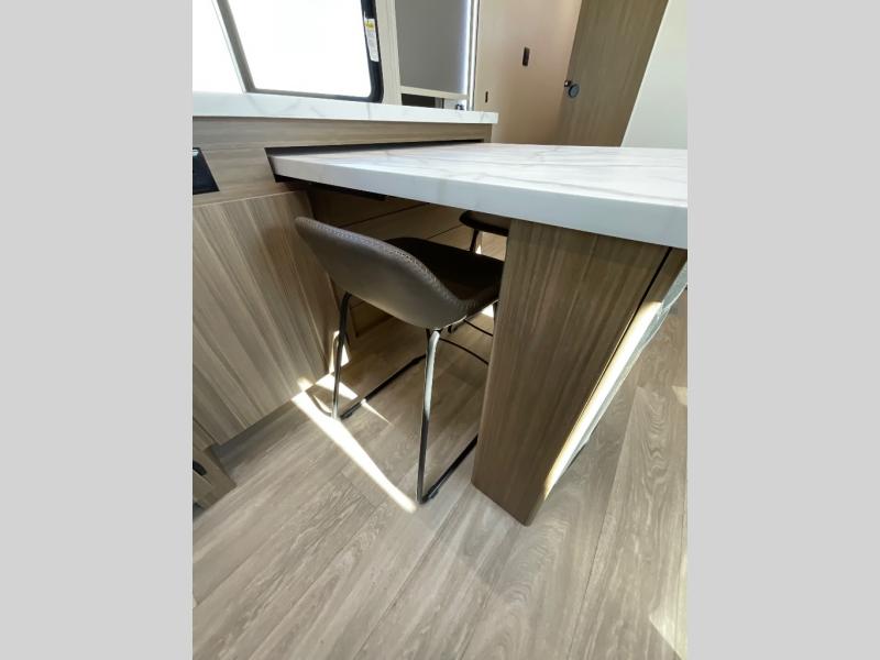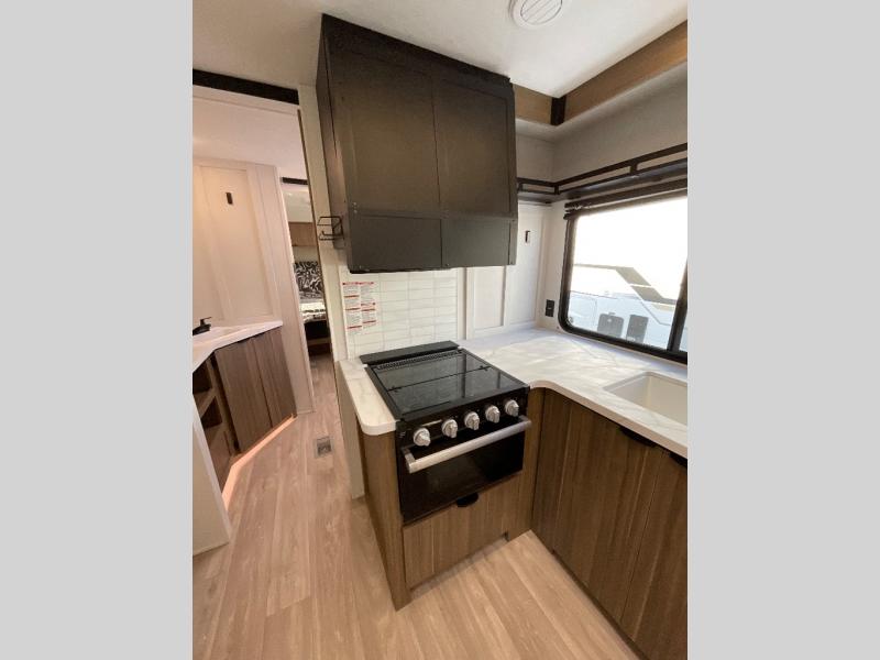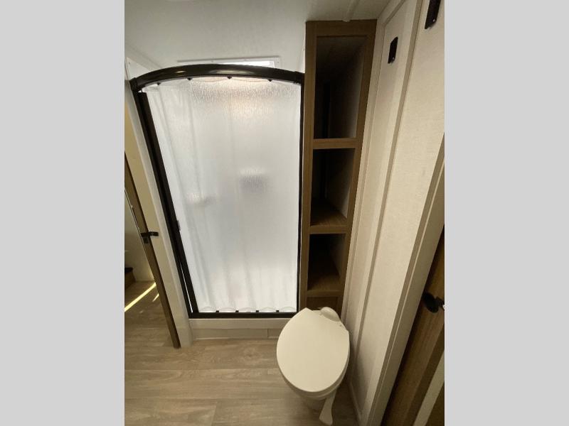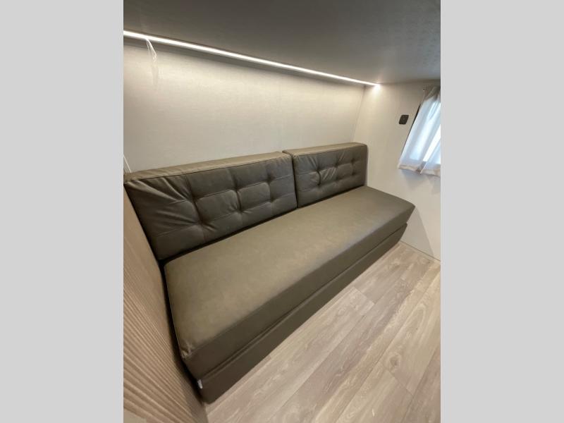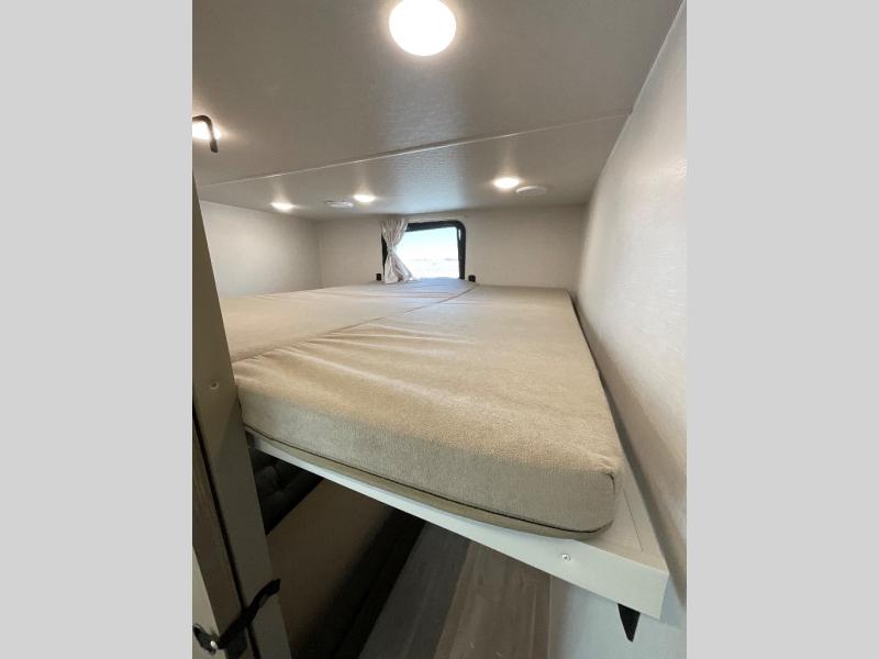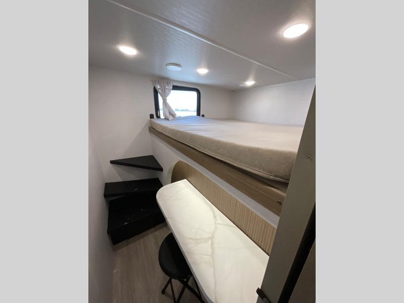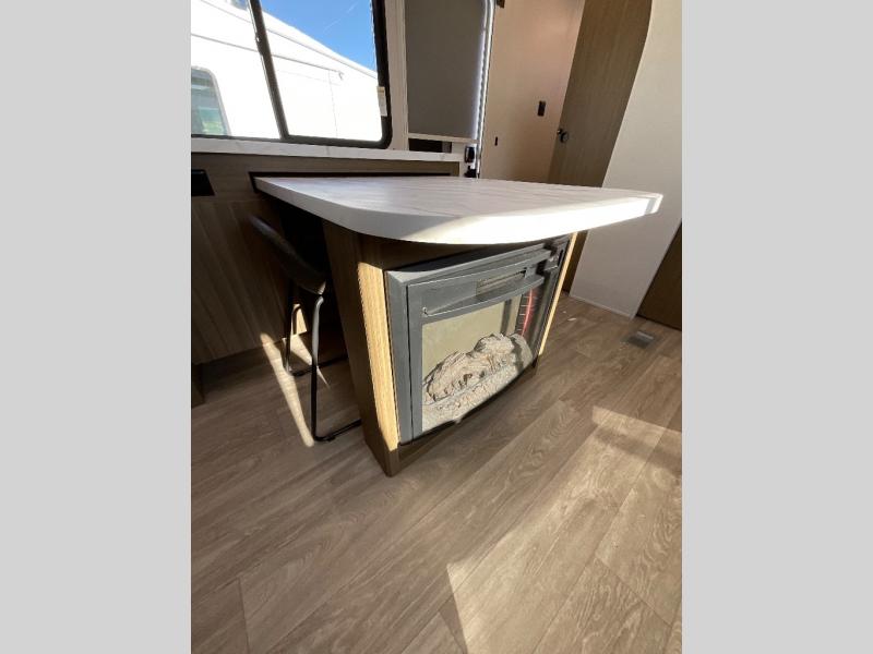 Everyone will enjoy having their own space in this travel trailer thanks to the front master bedroom and the rear bunkhouse. The bunkhouse includes a wall to separate the Versa bunk and fold-down desk on one side and a Versa sofa on the other, perfect for older kids or guests. You'll have the custom king bed with Versa Tilt all to yourselves, and the walk-thru bath will be easily accessible for everyone. In the combined kitchen and living room, a jackknife sofa slide sits across from the fireplace/entertainment center, and there is a pull-out table here so you can dine together.