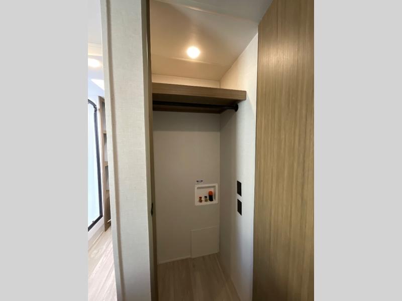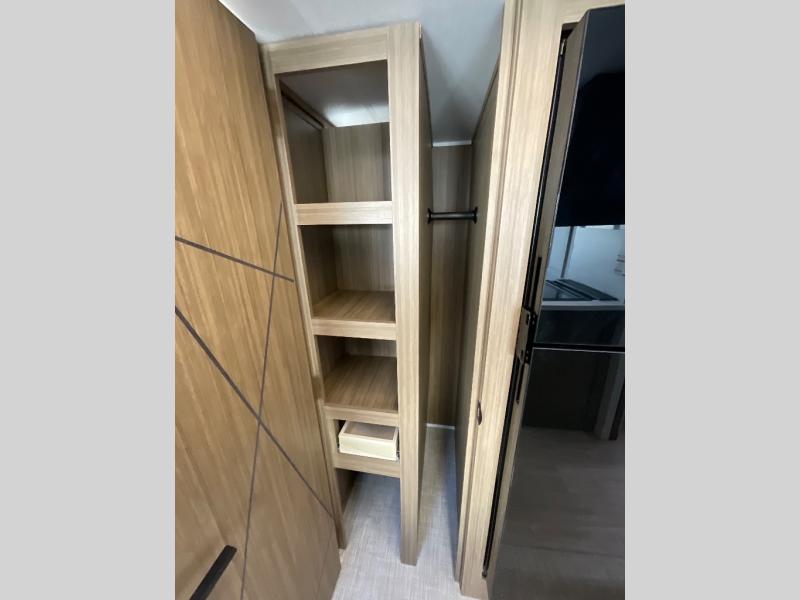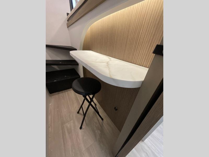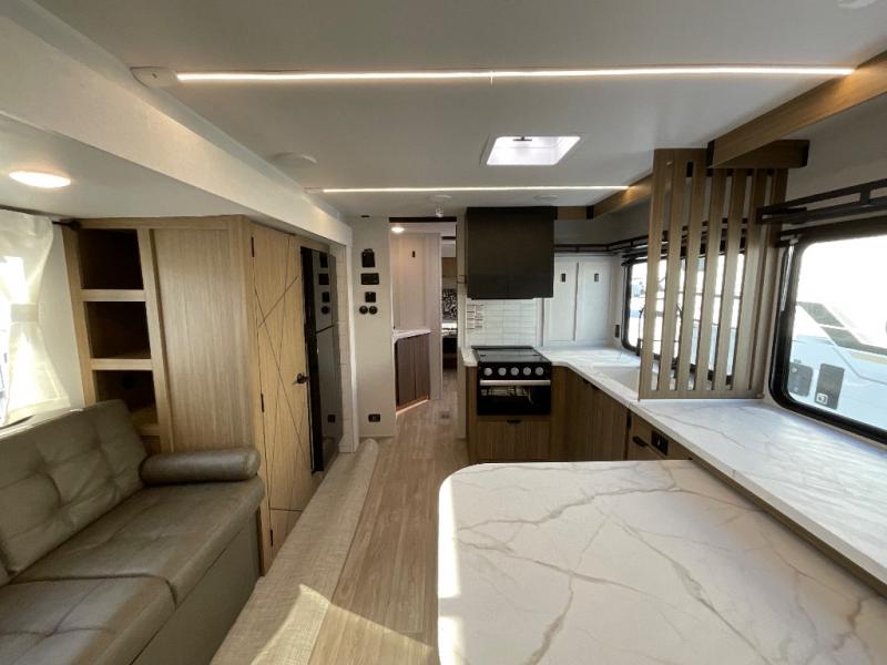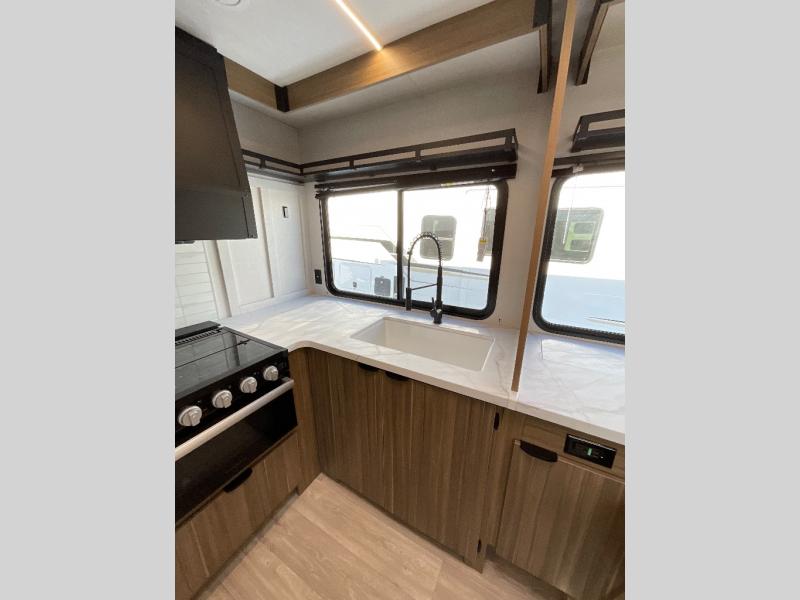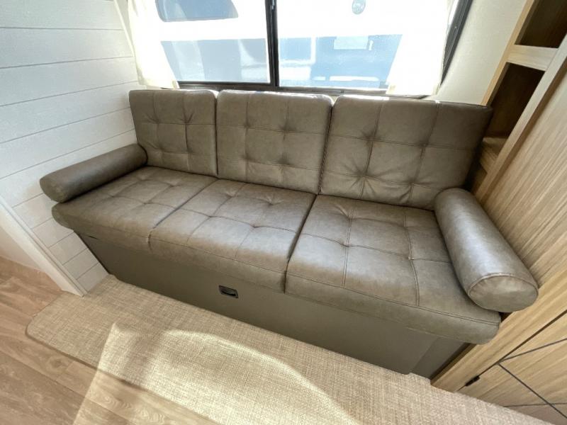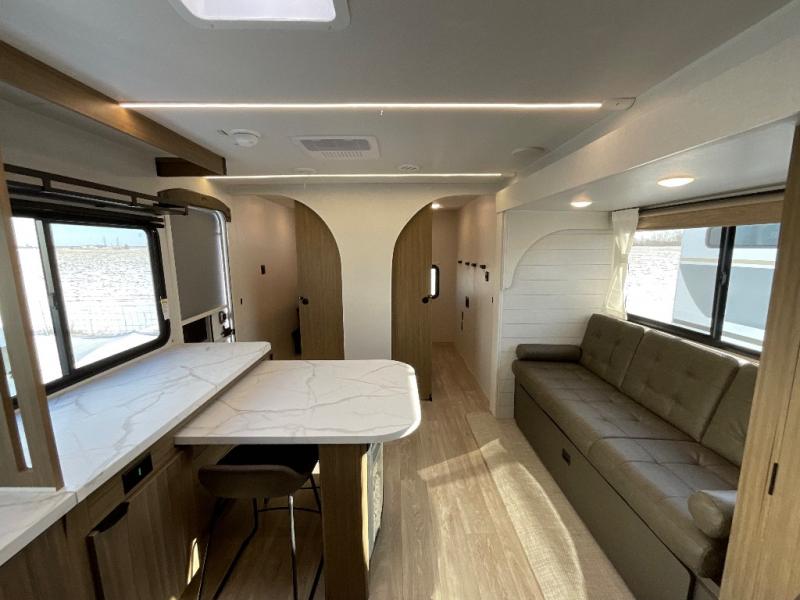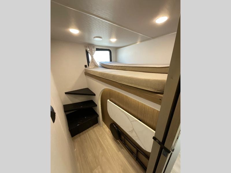 Everyone will enjoy having their own space in this travel trailer thanks to the front master bedroom and the rear bunkhouse. The bunkhouse includes a wall to separate the Versa bunk and fold-down desk on one side and a Versa sofa on the other, perfect for older kids or guests. You'll have the custom king bed with Versa Tilt all to yourselves, and the walk-thru bath will be easily accessible for everyone. In the combined kitchen and living room, a jackknife sofa slide sits across from the fireplace/entertainment center, and there is a pull-out table here so you can dine together.
