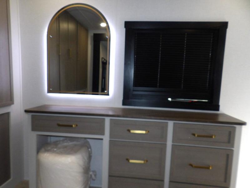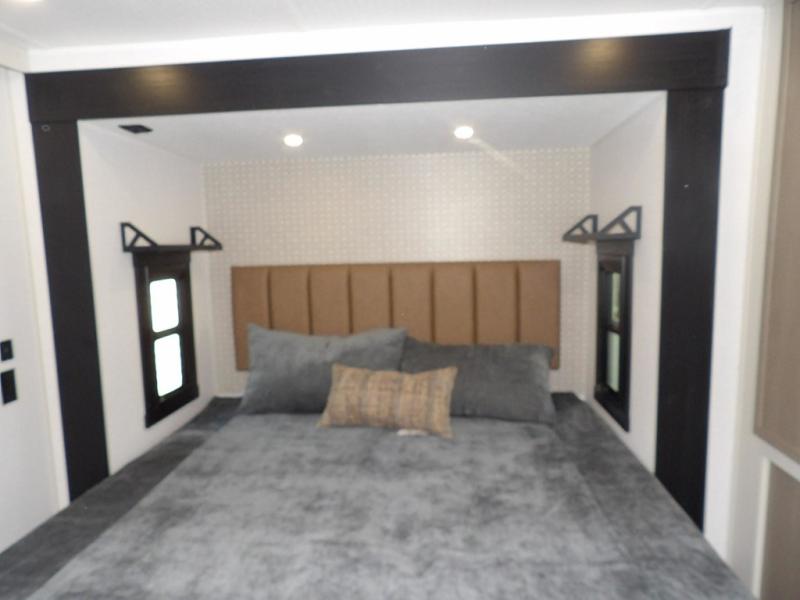 You are going to love the spacious private bedroom with a space-saving door, custom king bed slide, a dresser, and a full-width wardrobe with washer and dryer prep. If you ever decide to get out of bed, you can enjoy a relaxing shower in the residential shower with a skylight and a wide-open kitchen and living area with dual opposing slide outs. The cook will love having a kitchen island, a hutch, a large pantry, plus a 12V refrigerator. There is an entertainment center with a 50" TV and fireplace plus plenty of seating on the furniture. You can dine at the booth dinette or choose to add the free-standing dinette option if you prefer having your own seat. And don't forget about the natural lighting and views you will receive from the panoramic windows.