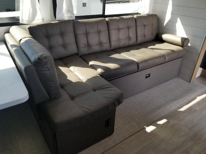 With this triple-slide Wildwood Platinum travel trailer, everyone can have their own space! The private bunkhouse features dual opposing slides that provide tons of space for the kids to play. The large slide in the living area opens up the whole space, and here you'll find a Versa Lounge with a Versa Flex table which is perfect for meal times and relaxing. You'll love the front private bedroom with a custom king bed with Versa Tilt, and everyone will appreciate the full bath with walk-in shower. The chef of the family can cook a meal on the cooktop, or you can prepare hamburgers at the outside kitchen that you are sure to love!
