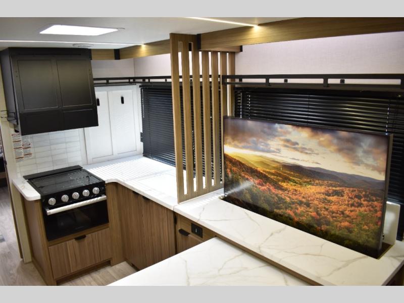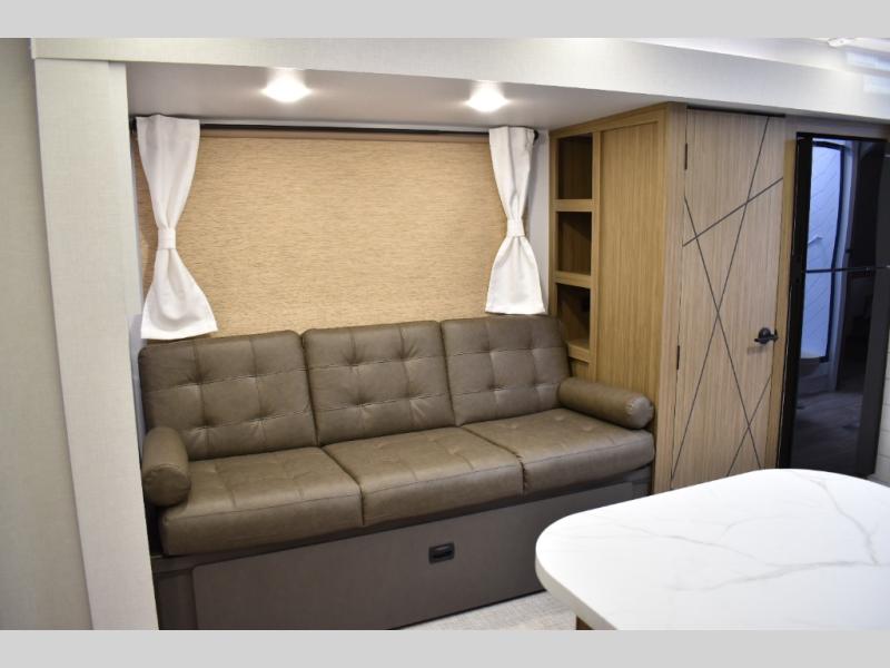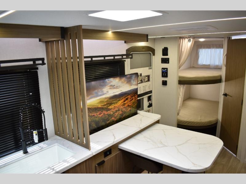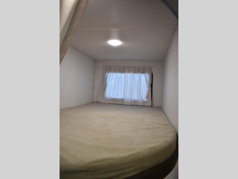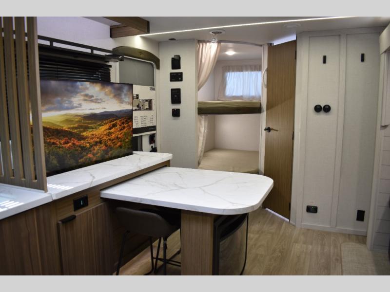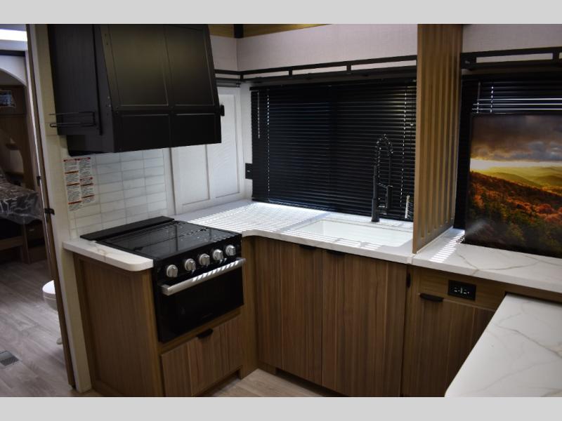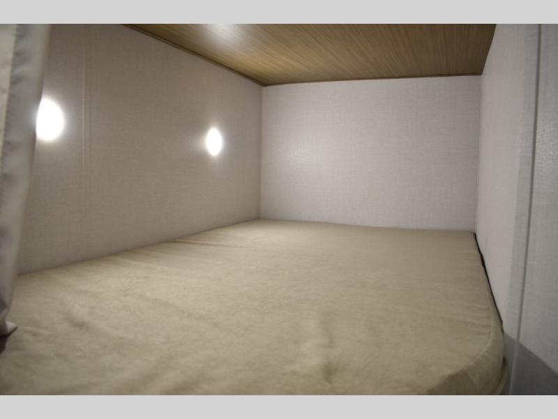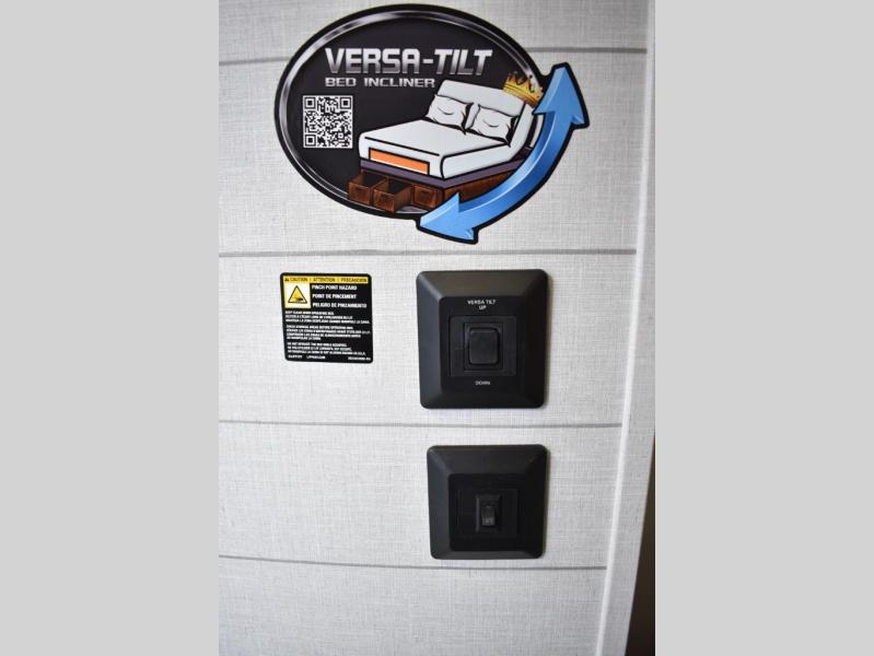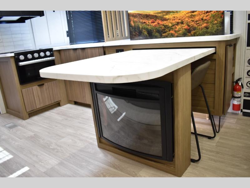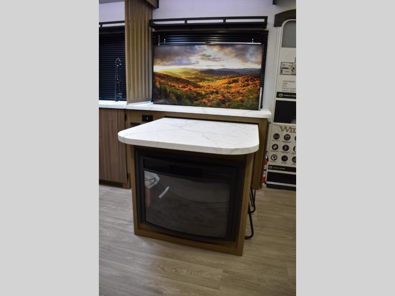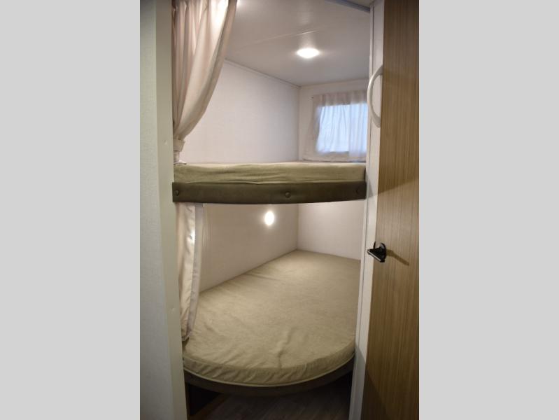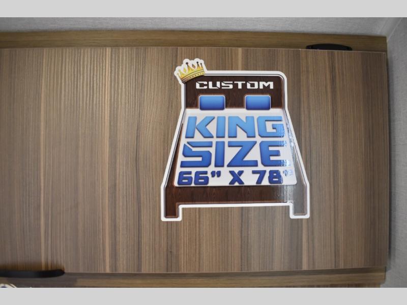 Everyone will love camping in this spacious travel trailer with double-size bunks and a large slide out for more space. You'll have the custom king bed with Versa Tilt all to yourselves, and the walk-thru bath will be easily accessible for everyone. In the combined kitchen and living room, a sofa slide sits across from the fireplace/entertainment center, and there is a pull-out table here so you can dine together.