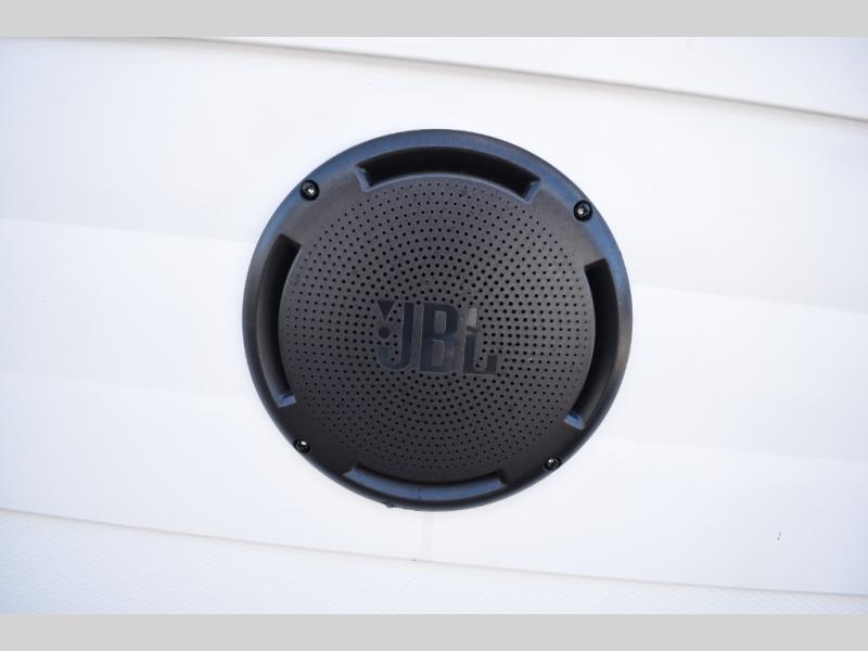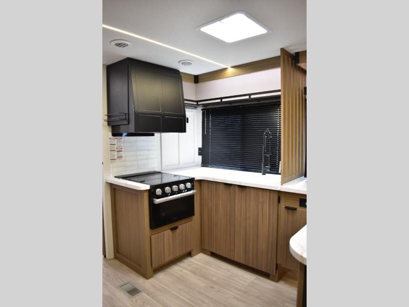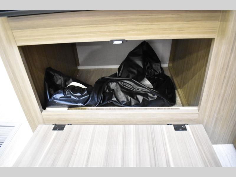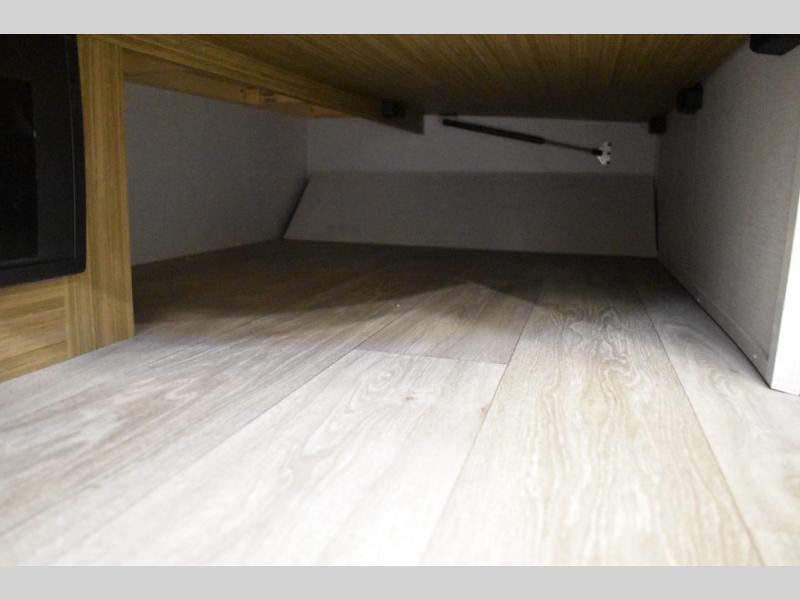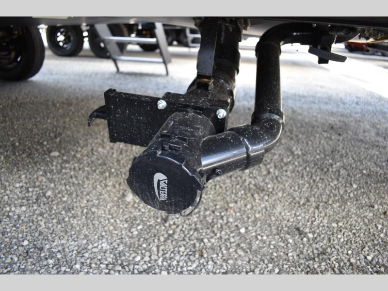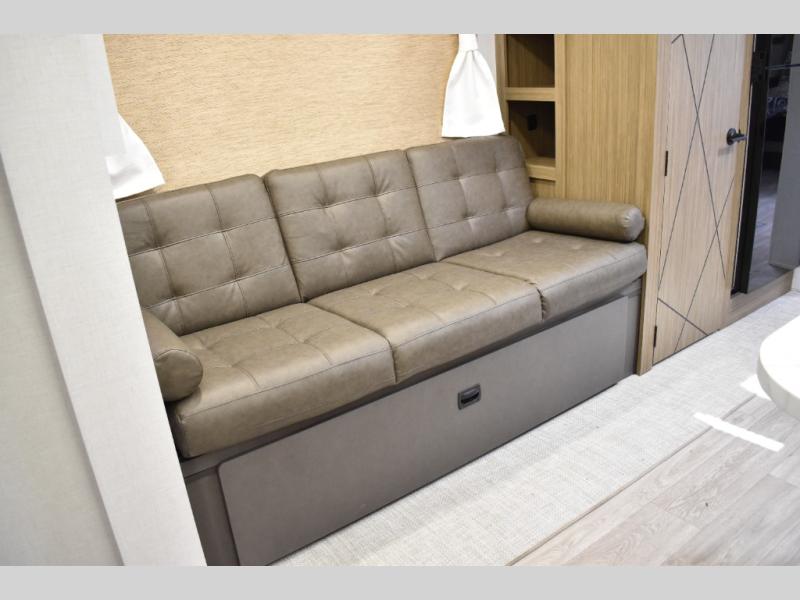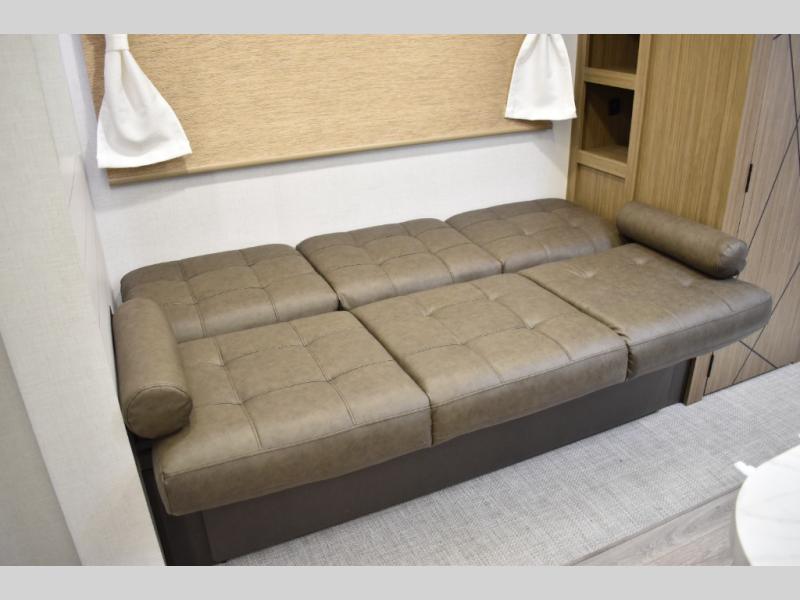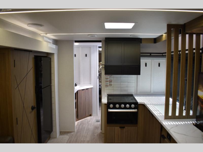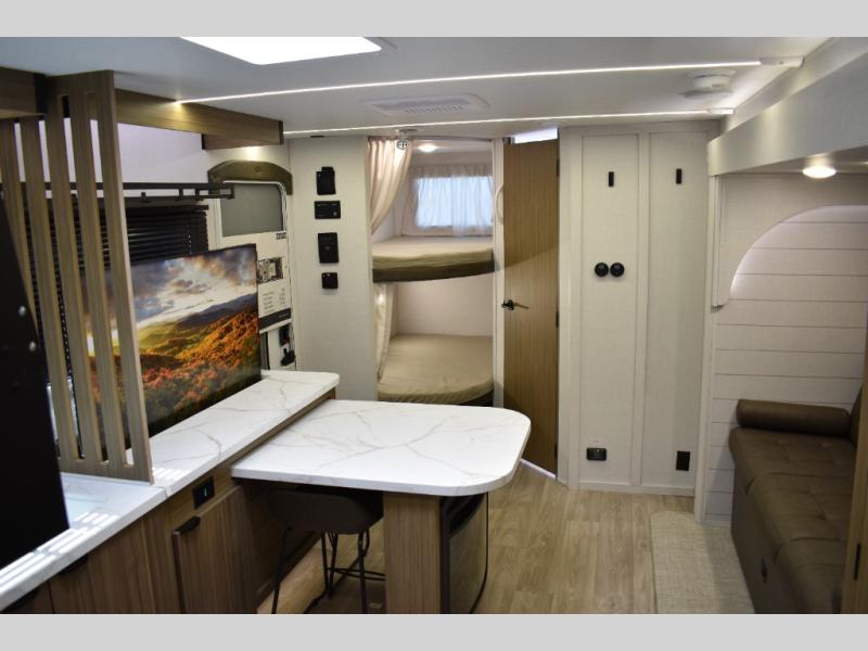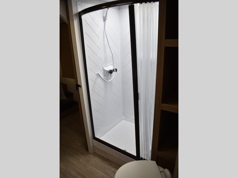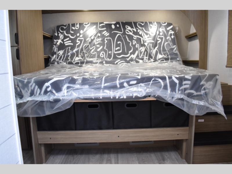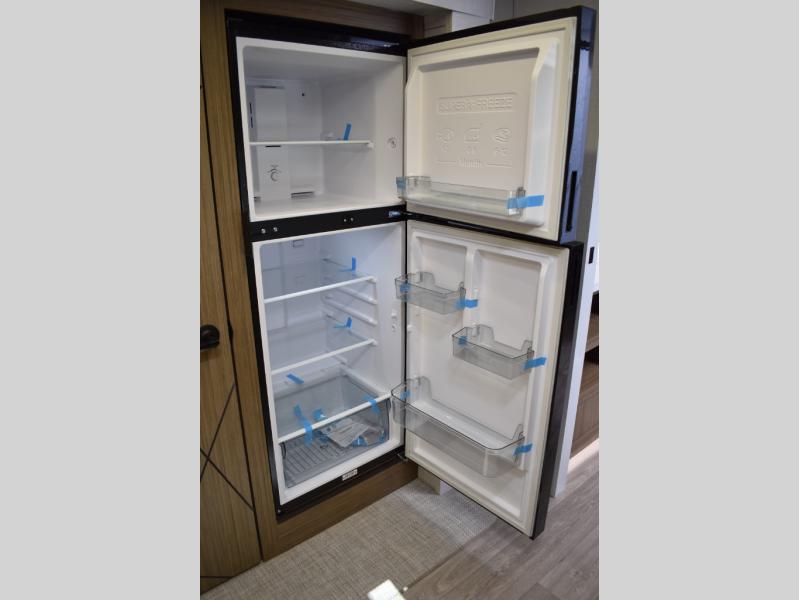 Everyone will love camping in this spacious travel trailer with double-size bunks and a large slide out for more space. You'll have the custom king bed with Versa Tilt all to yourselves, and the walk-thru bath will be easily accessible for everyone. In the combined kitchen and living room, a sofa slide sits across from the fireplace/entertainment center, and there is a pull-out table here so you can dine together.