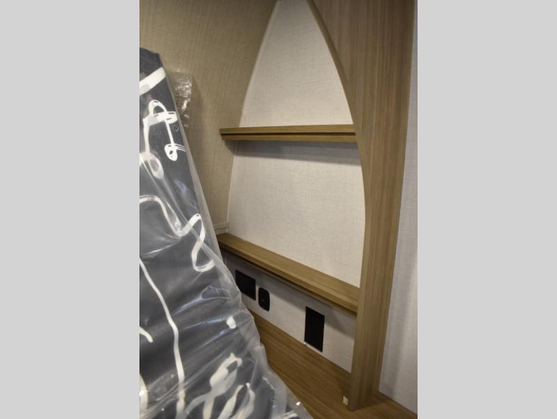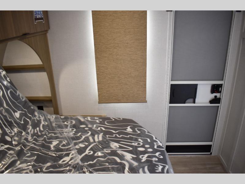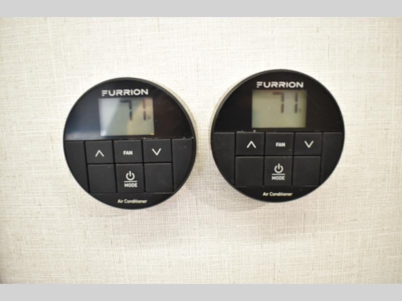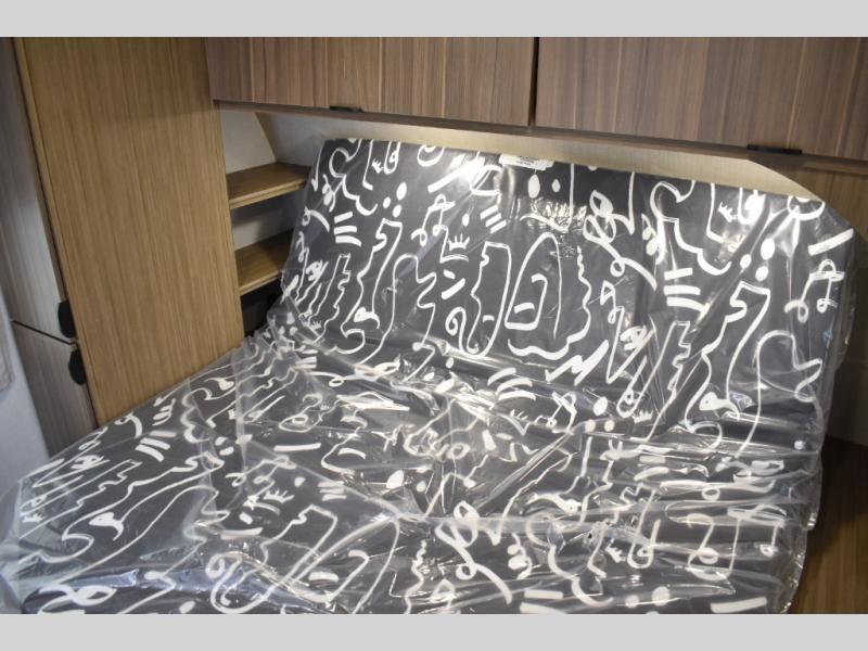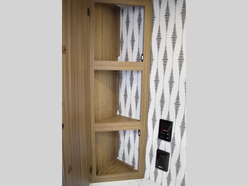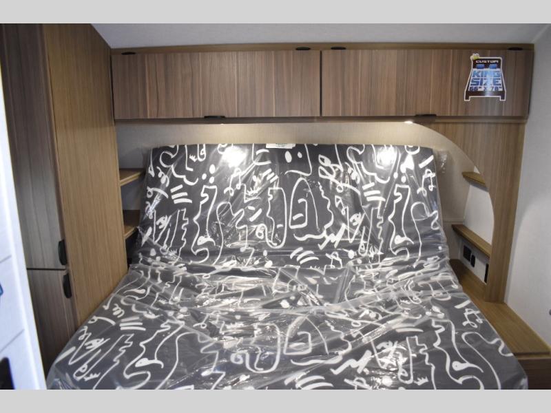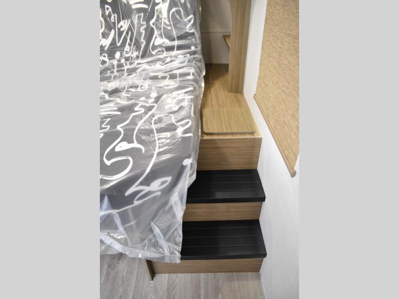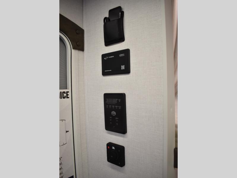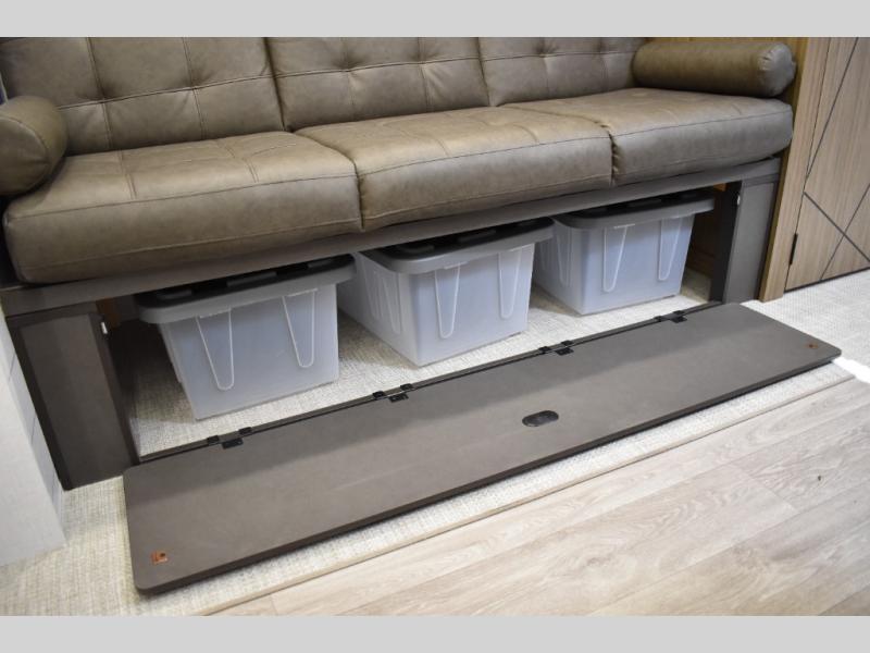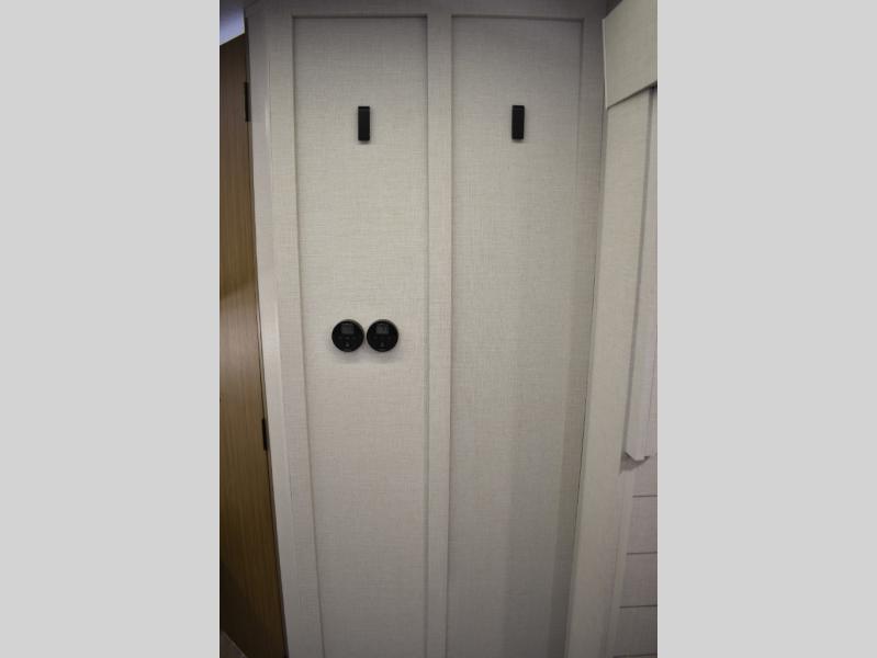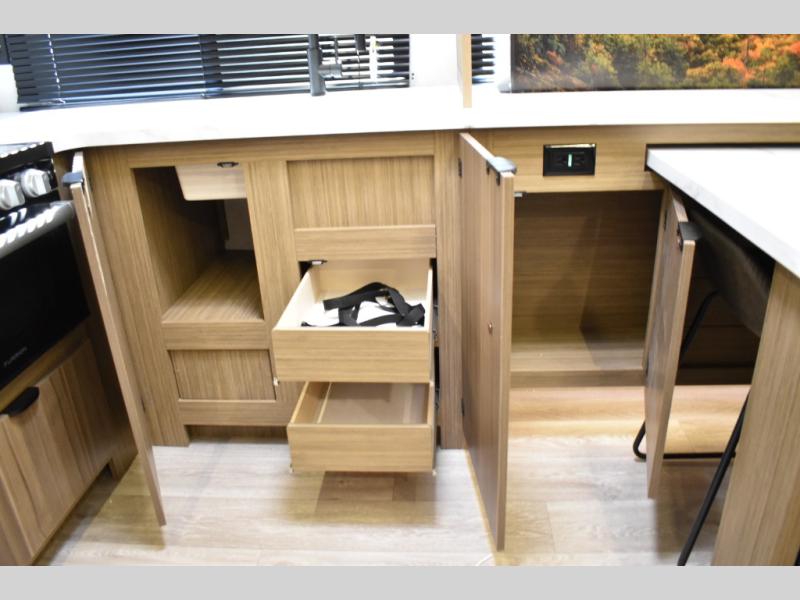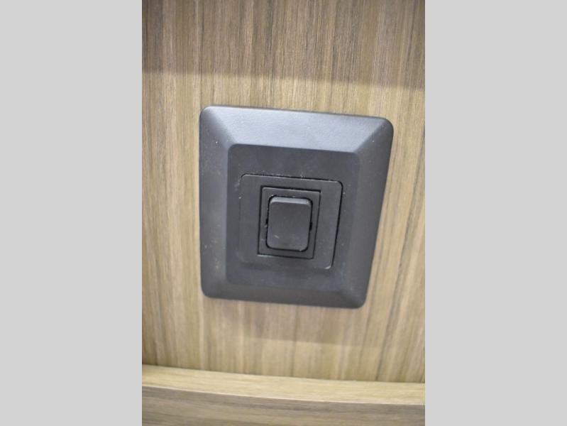 Everyone will love camping in this spacious travel trailer with double-size bunks and a large slide out for more space. You'll have the custom king bed with Versa Tilt all to yourselves, and the walk-thru bath will be easily accessible for everyone. In the combined kitchen and living room, a sofa slide sits across from the fireplace/entertainment center, and there is a pull-out table here so you can dine together.