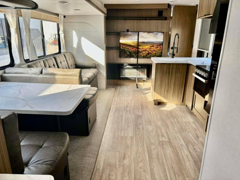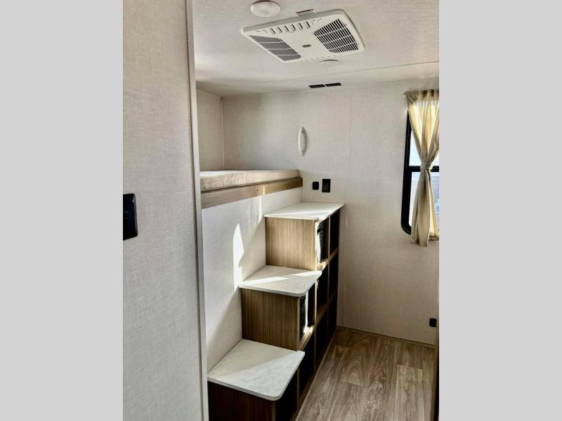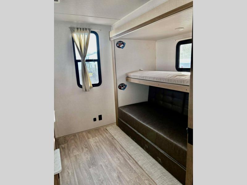 Get ready for your next weekend getaway to your local state park with this double-slide Wildwood travel trailer. The private bunkhouse is perfect for the kids, and you can enjoy the front private bedroom with a custom king bed with Versa-Tilt. This unit also includes a Versa Lounge and Versa Flex table for relaxing, dining, and sleeping. The double-bowl sink is perfect for cleaning up afterward, and you'll love how convenient the full bath is with its own exterior entry door.