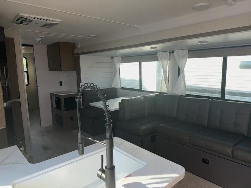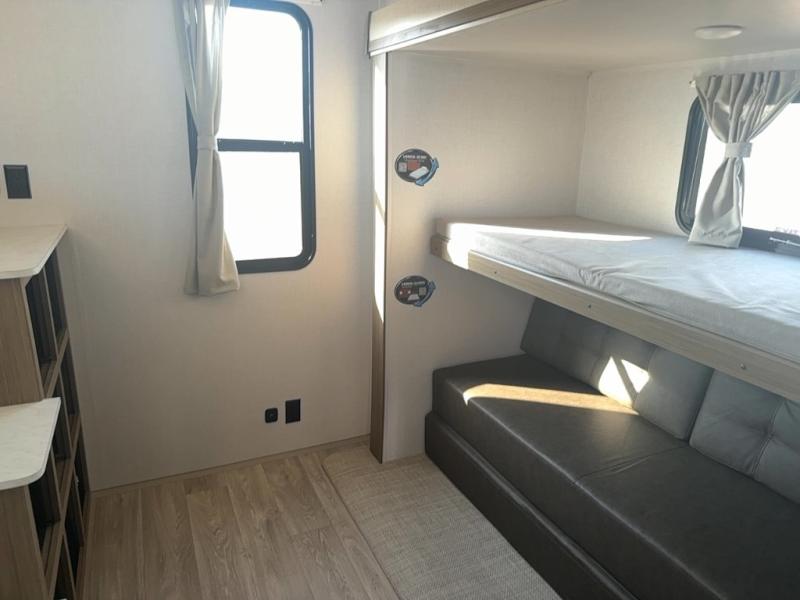 Get ready for your next weekend getaway to your local state park with this double-slide Wildwood travel trailer. The private bunkhouse is perfect for the kids, and you can enjoy the front private bedroom with a custom king bed with Versa-Tilt. This unit also includes a Versa Lounge and Versa Flex table for relaxing, dining, and sleeping. The double-bowl sink is perfect for cleaning up afterward, and you'll love how convenient the full bath is with its own exterior entry door.