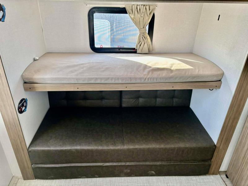 Get ready for your next weekend getaway to your local state park with this double-slide Wildwood travel trailer. The private bunkhouse is perfect for the kids, and you can enjoy the front private bedroom with a custom king bed with Versa-Tilt. This unit also includes a Versa Lounge and Versa Flex table for relaxing, dining, and sleeping. The double-bowl sink is perfect for cleaning up afterward, and you'll love how convenient the full bath is with its own exterior entry door.