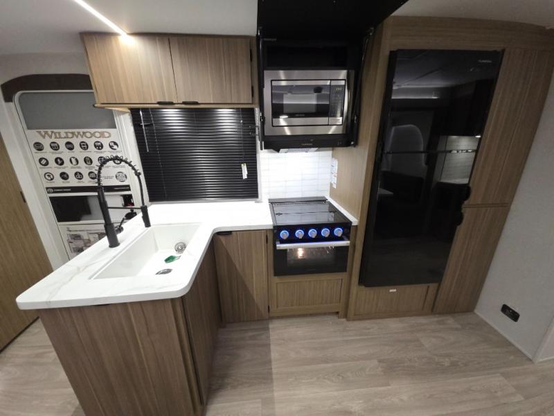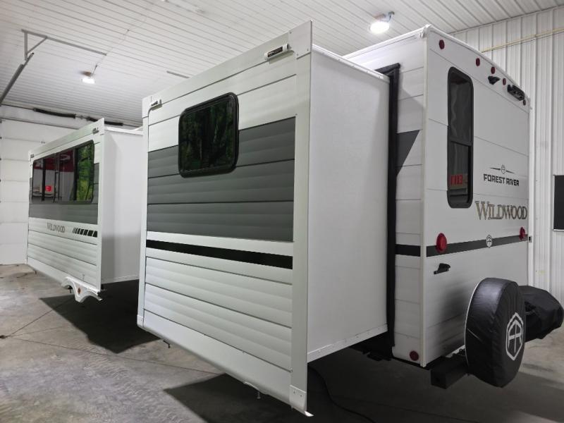 The Wildwood travel trailers are packed with hassle-free camping amenities! There are a variety of floorplans to choose from so you can find the layout that best fits your needs. The heated and enclosed Accessibelly will help protect against the elements and debris during transport, and the exterior retro/metal redesign is sure to be eye-catching! There are stylish roller shades inside, along with updated backsplash, elegant curtain rods and curtains, plus many more interior comforts! Choose a Wildwood travel trailer today for quality and value!