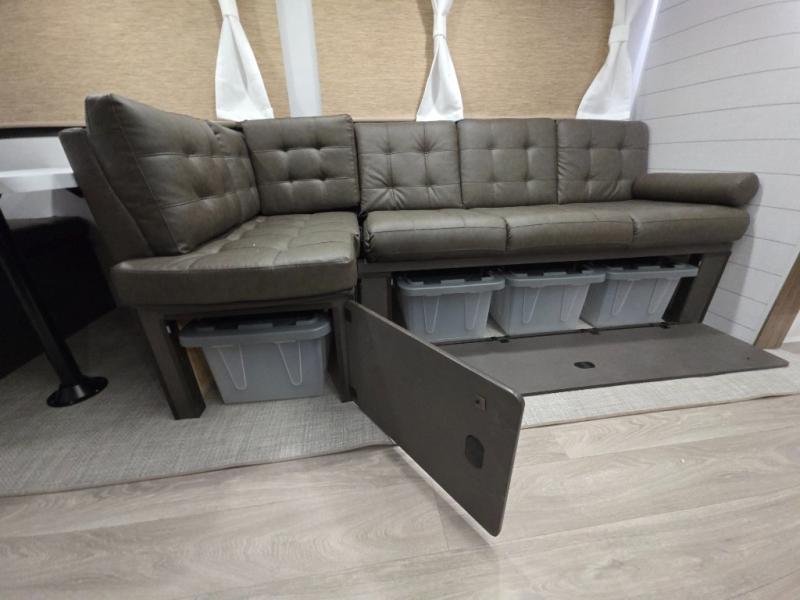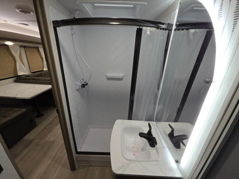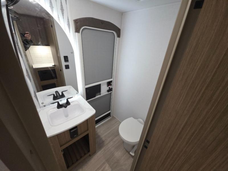 Get ready for your next weekend getaway to your local state park with this double-slide Wildwood travel trailer. The private bunkhouse is perfect for the kids, and you can enjoy the front private bedroom with a custom king bed with Versa-Tilt. This unit also includes a Versa Lounge and booth dinette for relaxing, dining, and sleeping. The sleek single bowl sink is perfect for cleaning up afterward, and you'll love how convenient the full bath is with its own exterior entry door.