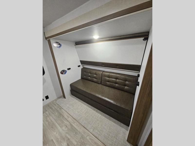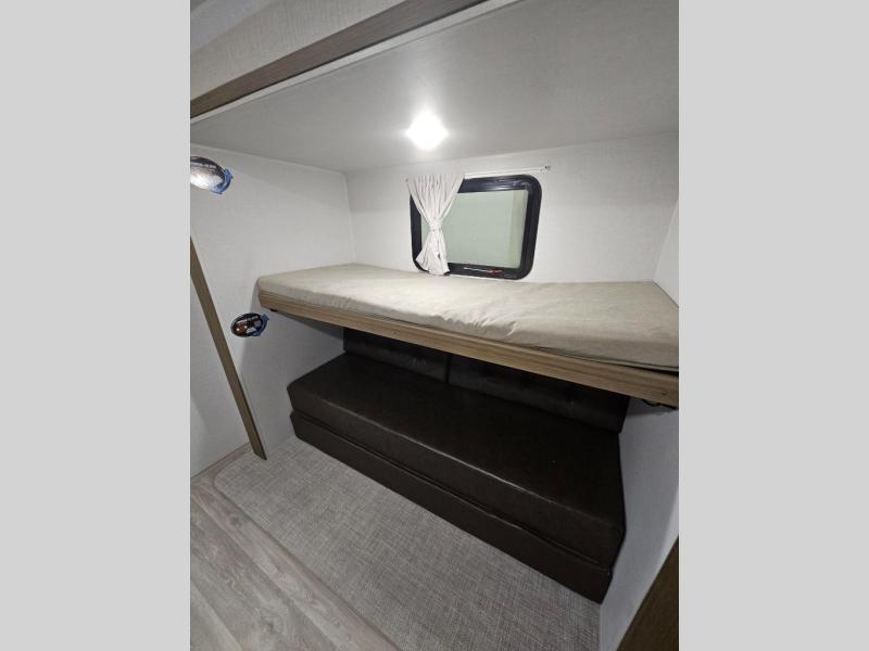 Get ready for your next weekend getaway to your local state park with this double-slide Wildwood travel trailer. The private bunkhouse is perfect for the kids, and you can enjoy the front private bedroom with a custom king bed with Versa-Tilt. This unit also includes a Versa Lounge and booth dinette for relaxing, dining, and sleeping. The sleek single bowl sink is perfect for cleaning up afterward, and you'll love how convenient the full bath is with its own exterior entry door.