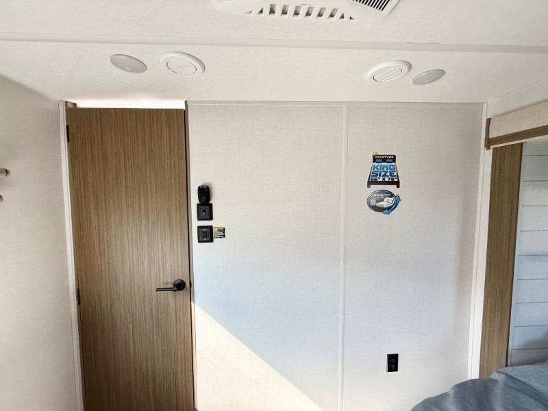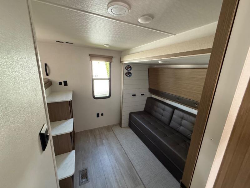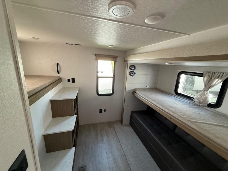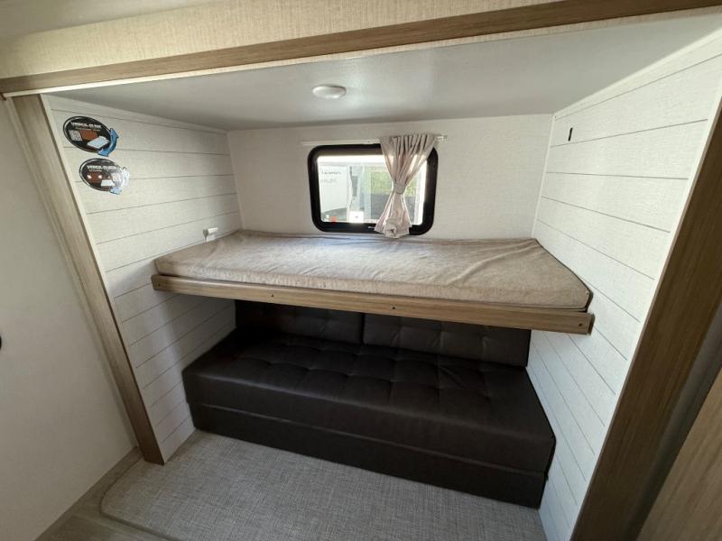 Have you been searching for the perfect travel trailer for your family? This Wildwood might just be the RV you have been looking for. Just imagine hiking, biking and playing horse shoes at your favorite campground to return to plenty of space for everything thanks to the triple slides, one in each room. The kiddos will surely head to the rear private bunkhouse to claim a bunk bed while you take a nap on the custom king bed in the front bedroom. You can make dinner on the outside kitchen or in the full kitchen inside. Everyone can play games or relax on the Versa Lounge before heading outside to see the stars. Check it out!