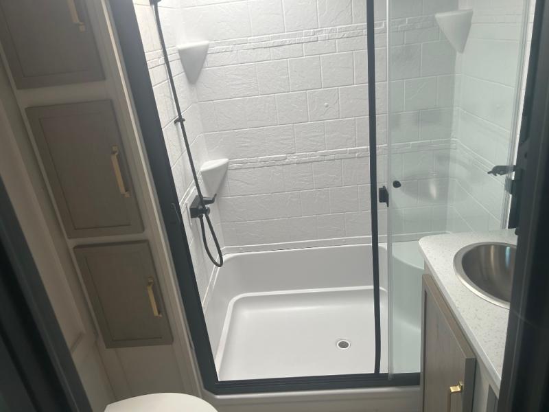 With any Wildwood Heritage Glen fifth wheel by Forest River, the quality construction, attention to detail and design along with a bright and welcoming interior allows you to relax in comfort. You'll love the high-end solid surface countertops included in the Elevated Value Package, along with a JBL sound system, full-length barreled ceilings, and an ultimate interior lighting upgrade. The included Expedition Package features an Accesibelly underbelly panel with 12V tank heaters, nitrogen-filled tires with aluminum rims, and a spacious 30" wide main entry door with a window. The Lippert On-The-Go ladder prep and back-up camera prep let you customize your fifth wheel even more, and the LED awning, front cap, marker and taillights will make it easier than ever to set up camp!